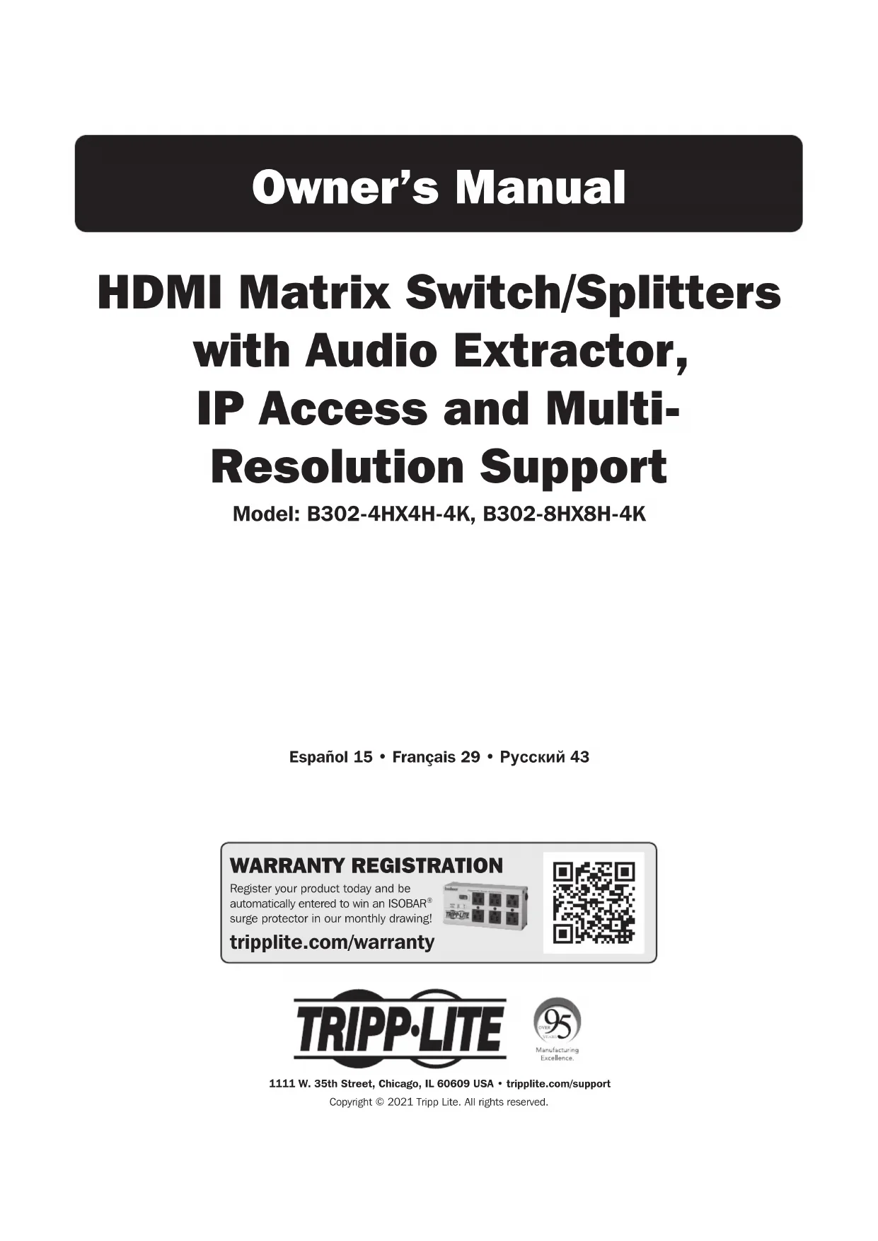 est approprié, adéquat et sûr pour l'usage prévu. Puisque les utilisations individuelles sont sujettes à des variations importantes, le fabricant ne fait aucune déclaration ou garantie quant à l'aptitude ou l'adaptation de ces dispositifs pour une application spécifique. La politique de Tripp Lite en est une d'amélioration continue. Les caractéristiques techniques sont modifiables sans préavis. Les produits réels peuvent différer légèrement des photos et des illustrations. 1111 W. 35th Street, Chicago, IL 60609 USA tripplite.com/support 20-10-226 • 93-3CA2_RevB43 Руководcтво пользoвателя Матричные HDMI-переключатели/ разветвители с устройством выделения аудиосигнала и поддержкой различных