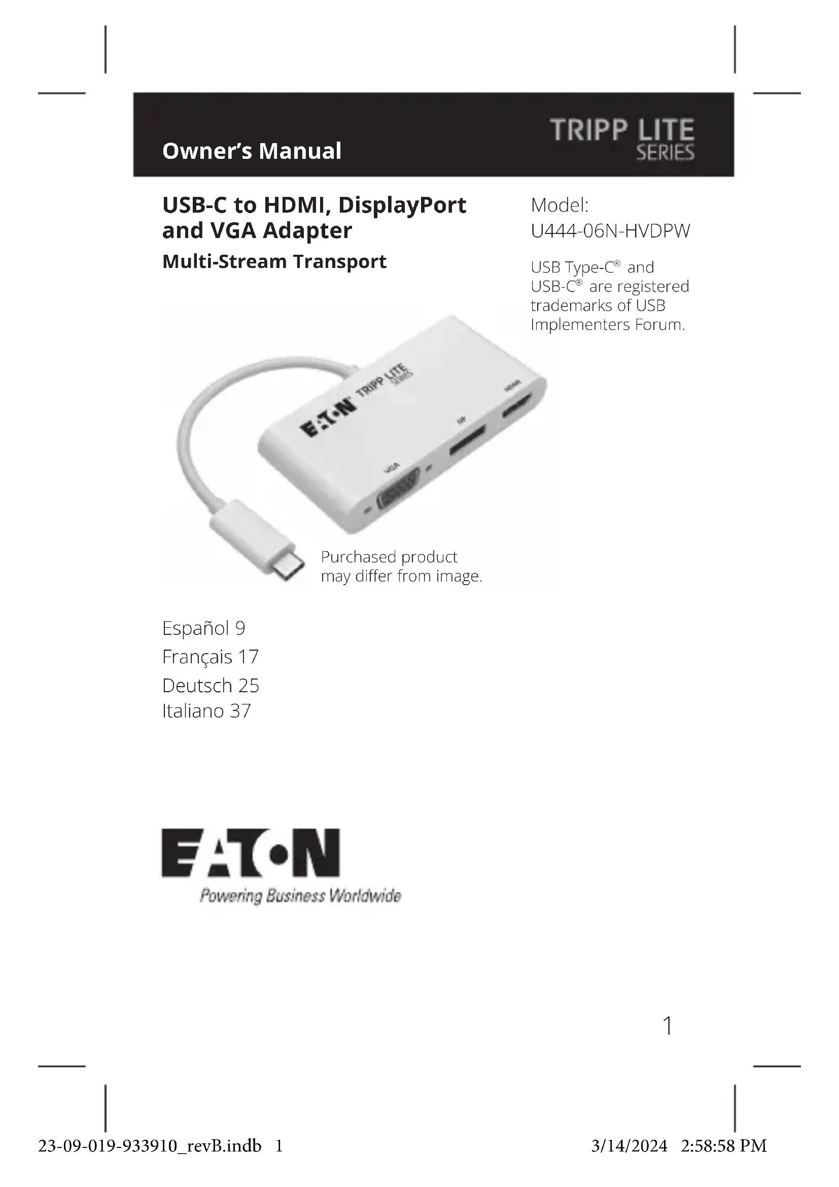 HDMI haute vitesse haut de gamme de la série P569-CERT), connectez un moniteur HDMI au port HDMI de l’adaptateur. 23-09-019-933910_revB.indb 2023-09-019-933910_revB.indb 20 3/14/2024 2:58:58 PM3/14/2024 2:58:58 PM21 Caractéristiques Signal d'entrée USB Type-C Signal de sortie VGA, DisplayPort et HDMI Résolution maximale HDMI 3840 x 2160, UHD 4K, à 30 Hz Résolution DisplayPort maximale 3840 x 2160 (4K x 2K) à 60 Hz Résolution VGA maximale 1920 x 1200, dont 1080p à 60 Hz Environnement Température de fonctionnement 0° à 45°C (32° à 113°F) Température de stockage -10° à 70°C (14° à 158°F) Taux d'humidité en fonctionnement 10 % à 85 % HR, Sans condensation Humidité de stockage 5 % à 90 % RH, Sans condensation 23-09-019-933910_revB.indb 2123-09-019-933910_revB.indb 21 3/14/2024 2:58:59 PM3/14/2024 2:58:59 PM22 Garantie limitée de 3ans Nous garantissons que nos produits sont exempts de défauts de matériaux et de fabrication pendant une période de trois (3) ans à compter de la date d'achat initiale. Notre obligation au titre de cette garantie est limitée à la réparation ou au remplacement (à notre seule discrétion) de tout produit défectueux. Veuillez consulter Tripplite.Eaton.com/support/product-returns avant d'envoyer un produit pour le faire réparer. Cette garantie ne s'applique pas aux équipements qui ont été endommagés par accident, négligence ou par une mauvaise utilisation, ni à ceux qui ont été altérés ou modiés d'une façon quelconque. SAUF MENTION CONTRAIRE DANS LE PRÉSENT DOCUMENT, NOUS NE FOURNISSONS AUCUNE GARANTIE, EXPLICITE OU IMPLICITE, Y COMPRIS LES GARANTIES DE QUALITÉ MARCHANDE ET DE VOCATION À UN BUT PARTICULIER. Certains États ne permettent ni la limitation ni l'exclusion de garanties implicites; ainsi, la/les limitation(s) ou exclusion(s) mentionnée(s) ci-dessus peut/peuvent ne pas s'appliquer à l'acquéreur. SAUF DANS LES CAS PRÉVUS CI-DESSUS, NOUS NE SERONS EN AUCUN CAS RESPONSABLES DES DOMMAGES DIRECTS, INDIRECTS, SPÉCIAUX, ACCESSOIRES OU CONSÉCUTIFS RÉSULTANT DE L'UTILISATION DE CE PRODUIT, MÊME SI NOUS AVONS ÉTÉ INFORMÉS DE LA POSSIBILITÉ DE TELS DOMMAGES. En particulier, nous ne sommes pas responsables des coûts tels que les pertes de prots ou de revenus, les pertes d'équipement, les pertes d'utilisation de l'équipement, les pertes de logiciels, les pertes de données, les coûts des produits de remplacement, les réclamations de tiers ou autres. Garantie 23-09-019-933910_revB.indb 2223-09-019-933910_revB.indb 22 3/14/2024 2:58:59 PM3/14/2024 2:58:59 PM23 Informations de conformité DEEE pour les clients et les recycleurs (Union européenne) Dans le cadre de la directive sur les Déchets d'équipements électriques et électroniques (DEEE) et des réglementations d'application, lorsqu'un consommateur achète un équipement électrique ou électronique neuf auprès d'Eaton, il est habilité à:
