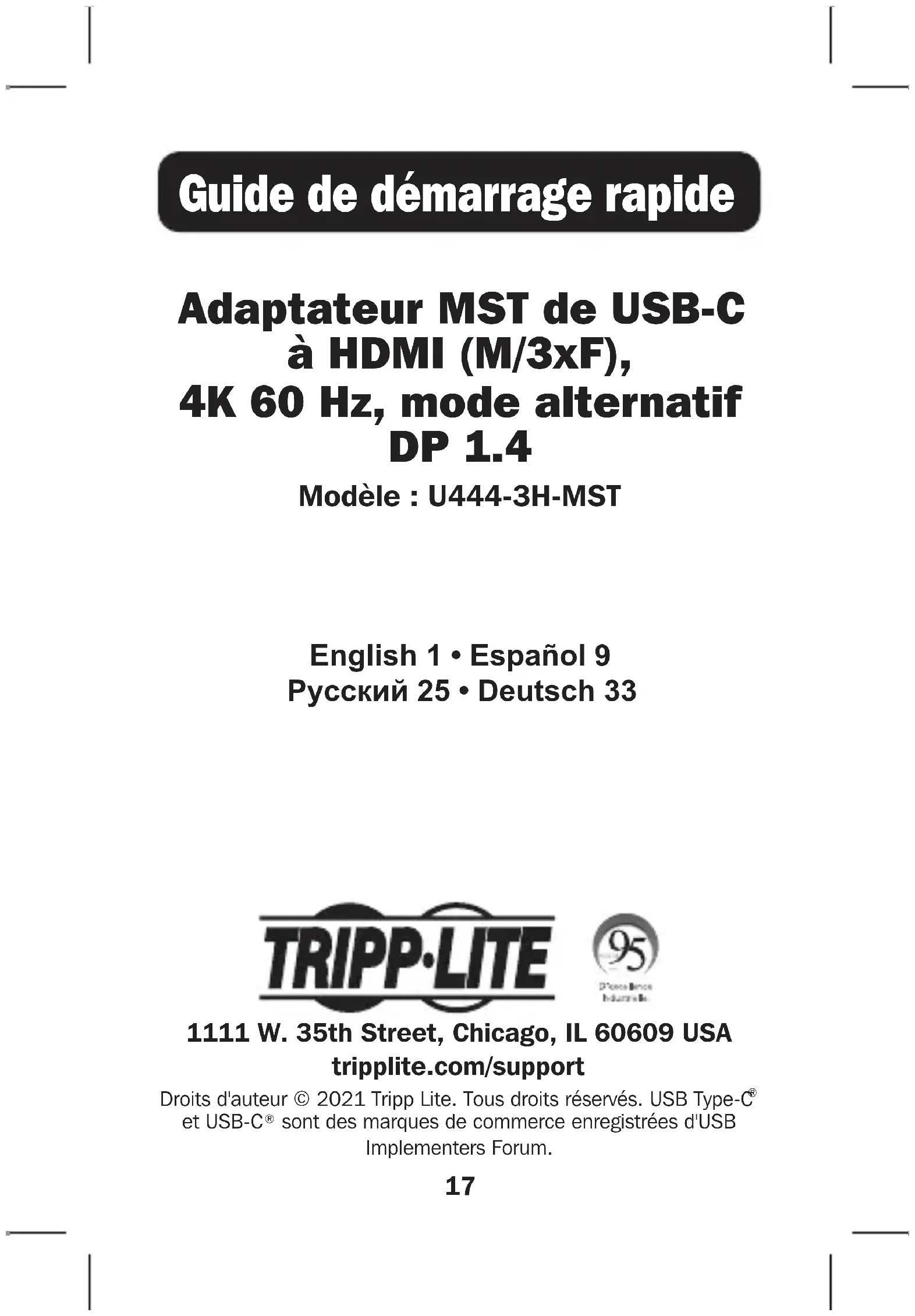 sont des marques de commerce enregistrées d'USB Implementers Forum. Guide de démarrage rapide Adaptateur MST de USB-C à HDMI (M/3xF), 4K 60 Hz, mode alternatif DP 1.4 Modèle : U444-3H-MST English 1 • Español 9 Русский 25 • Deutsch 3318 Contenu de l'emballage Caractéristiques du produit
