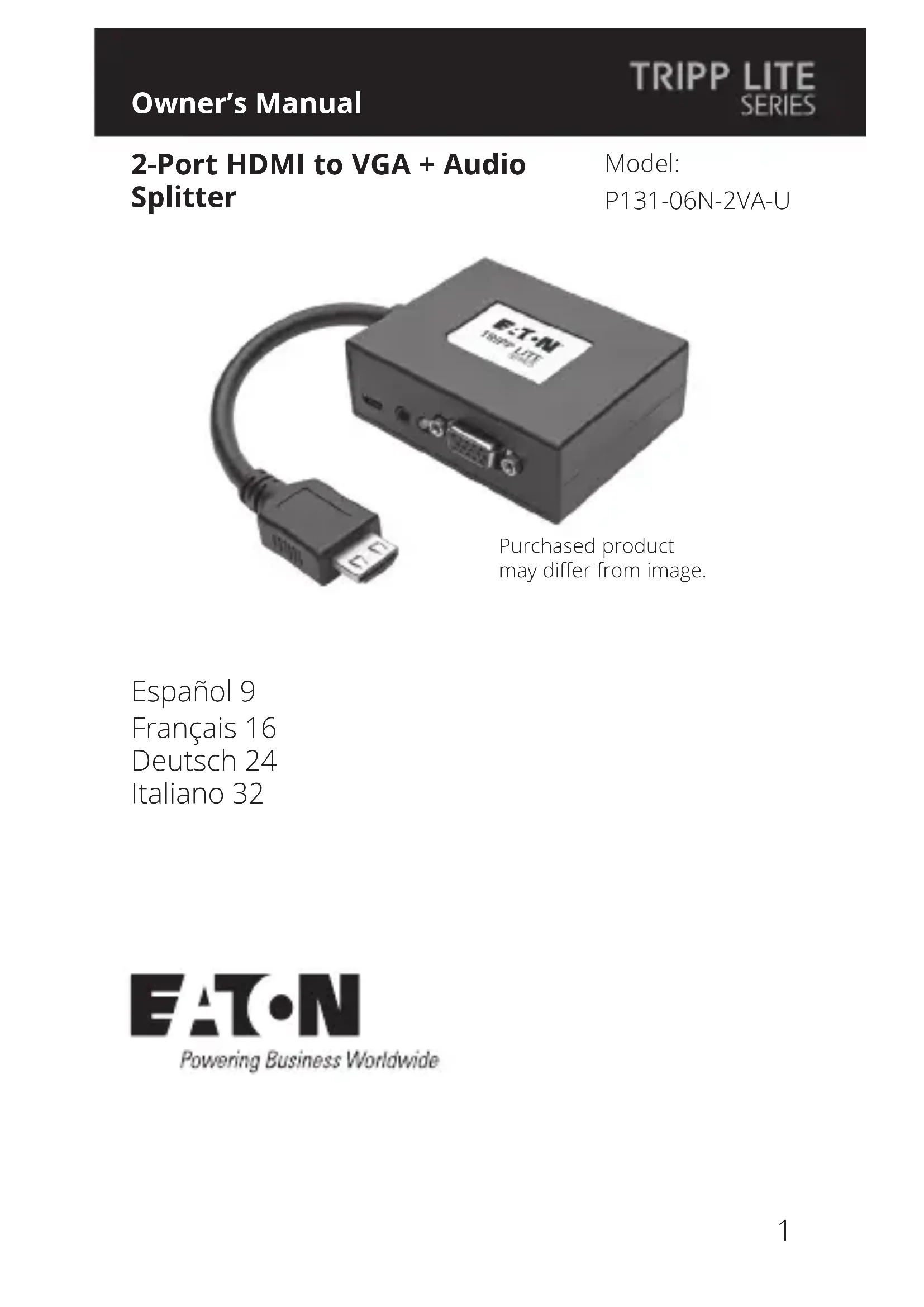 - Renvoyer le nouvel équipement pour recyclage lorsqu'il est en n de vie et devient un déchet AVERTISSEMENT L'utilisation de ce produit avec des dispositifs de maintien en vie n'est pas recommandée dans les cas où une panne de ce produit serait susceptible d'entraîner une panne du dispositif de maintien en vie ou d'aecter signicativement sa sécurité ou son ecacité. Eaton mène une politique d'amélioration constante. Les caractéristiques peuvent être modiées sans préavis. Eaton 1000 Eaton Boulevard Cleveland, OH 44122 États-Unis Eaton.com ©2024 Eaton Tous droits réservés. Publication n° 23-10-108 / 93-37CB_RevC Mars 2024 Eaton est une marque déposée. Toutes les marques commerciales appartiennent à leurs propriétaires respectifs. 9337CB24 Betriebsanleitung Das erworbene Produkt kann von der Abbildung abweichen. Modell: P131-06N-2VA-U 2-Port HDMI zu VGA + Audio Splitter English 1 Español 9 Français 16 Italiano 3225 Produktmerkmale Im Lieferumfang enthalten