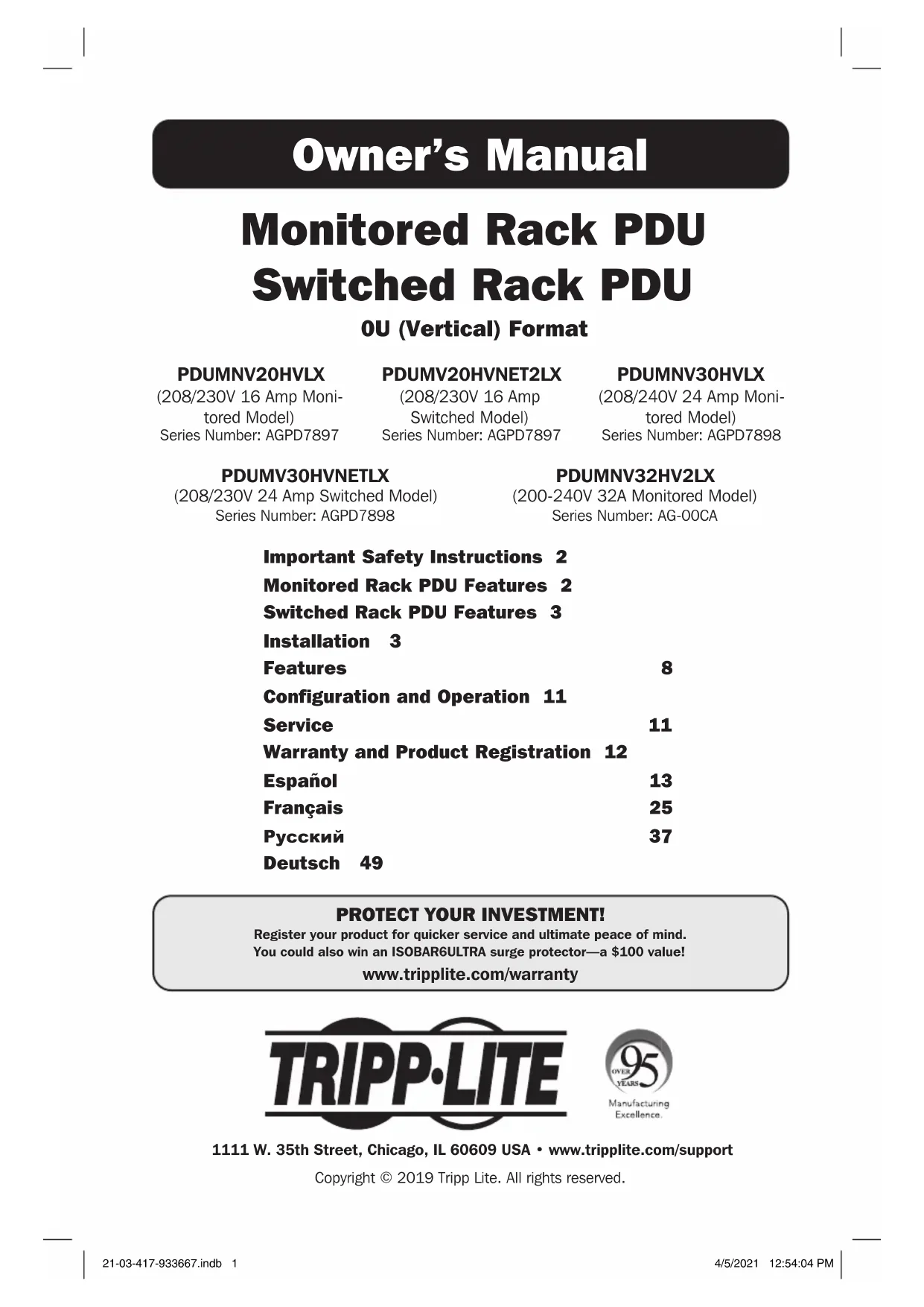 AÑOS 21-03-417 93-3667_RevD 21-03-417-933667.indb 2421-03-417-933667.indb 24 4/5/2021 12:54:12 PM4/5/2021 12:54:12 PM25 Manuel du propriétaire PDU en bâti surveillée Unité de distribution d'alimentation (PDU) en baie commandée par interrupteur Format barrette de connexion 0U (Vertical) Importantes consignes de sécurité 26 Caractéristiques de la PDU en bâti surveillée 26 Caractéristiques de la PDU en bâti à liaison commutée 27 Installation 27 Caractéristiques 31 Configuration et fonctionnement 35 Entretien 35 Garantie 36 English 1 Español 13 Русский 37 Deutsch 49 1111 W. 35th Street, Chicago, IL 60609 USA • www.tripplite.com/supportCopyright © 2019 Tripp Lite. Tous droits réservés. PDUMNV20HVLX (modèle de 208/230 V 16 ampères, surveillée)Numéro de série : AGPD7897