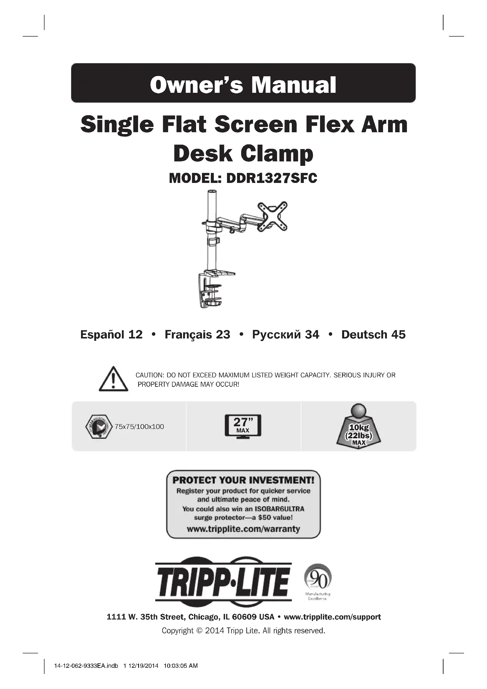 approprié, adéquat et sûr pour l’usage prévu. Puisque les utilisations individuelles sont sujettes à des variations importantes, le fabricant ne fait aucune déclaration ou garantie quant à l’aptitude ou l’adaptation de ces dispositifs pour une application spécifique. La politique de Tripp Lite en est une d’amélioration continue. Les spécifications sont sujettes à changement sans préavis. 14-12-062-9333EA.indb 24 12/19/2014 10:03:14 AM25 Lista de Comprobación de Componentes Ensemble du support d’adaptateur (x1) Emballage M Emballage P Pôle (x1) Ensemble de la bride pour bureau (x1) M4X14 (x4) Socle (x1) Clé hexagonale de 3 mm (x1) Coussinet (x1) Clé hexagonale de 4 mm (x1) M5X14 (x4) Rondelle D5 (x4) IMPORTANT : Veuillez vous assurer d’avoir reçu toutes les pièces conformément à la liste de vérification des composants avant de procéder à l’installation. Si des pièces sont manquantes ou défectueuses, visitez www.tripplite.com/support pour obtenir de l’aide. 14-12-062-9333EA.indb 25 12/19/2014 10:03:14 AM26