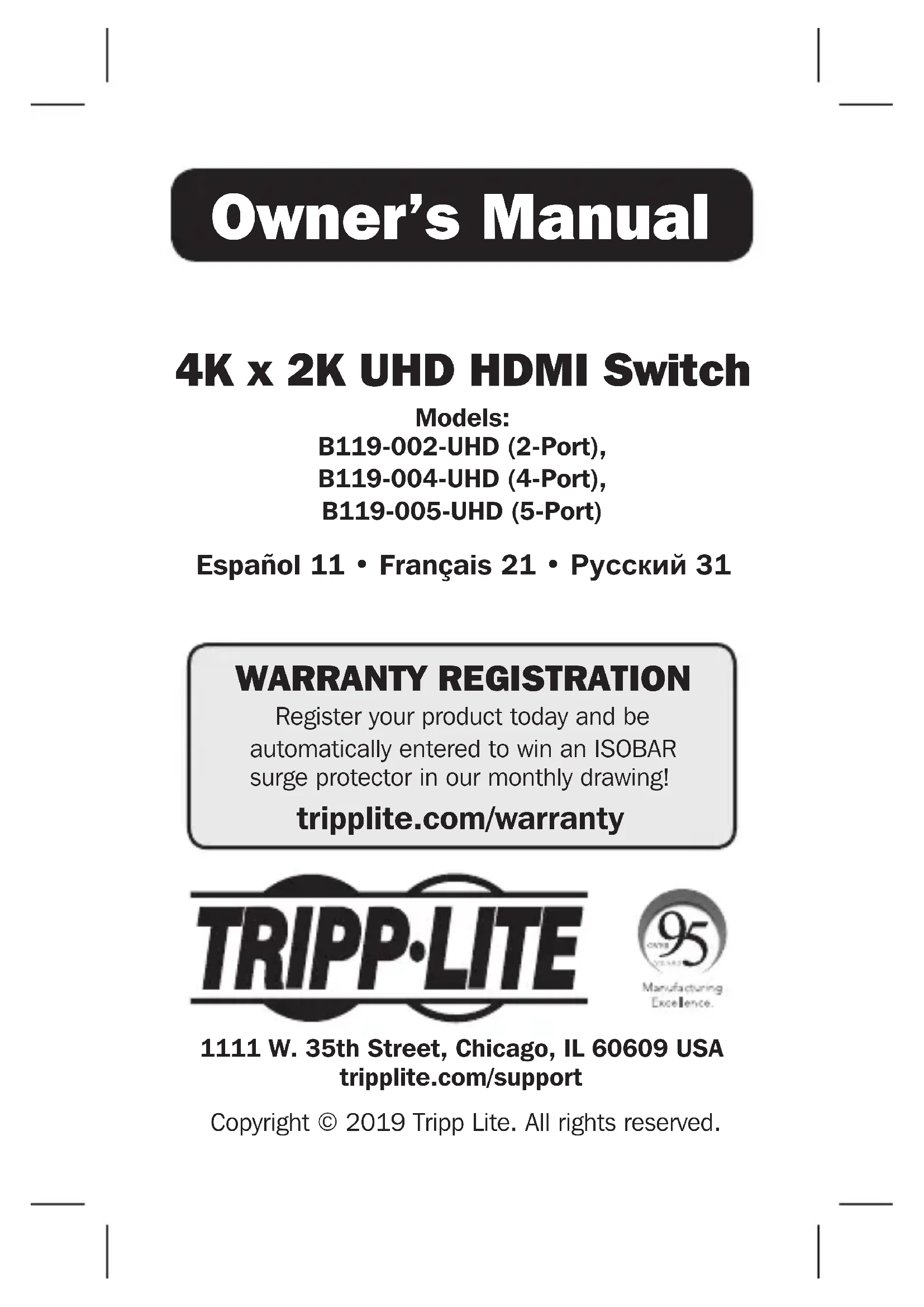 - De retourner le nouvel équipement afin qu'il soit recyclé à la fin de sa vie utile. Il n'est pas recommandé d'utiliser cet équipement pour des appareils de survie où une défaillance de cet équipement peut, selon toute vraisemblance, entraîner la défaillance de l’appareil de maintien de la vie ou affecter de façon majeure sa sécurité ou son efficacité. La politique de Tripp Lite en est une d'amélioration continue. Les caractéristiques techniques sont sujettes à changement sans préavis. 1111 W. 35th Street, Chicago, IL 60609 USA tripplite.com/support 19-08-201 93-37C3_RevD31 Руководство пользователя HDMI-переключатель 4K x 2K UHD