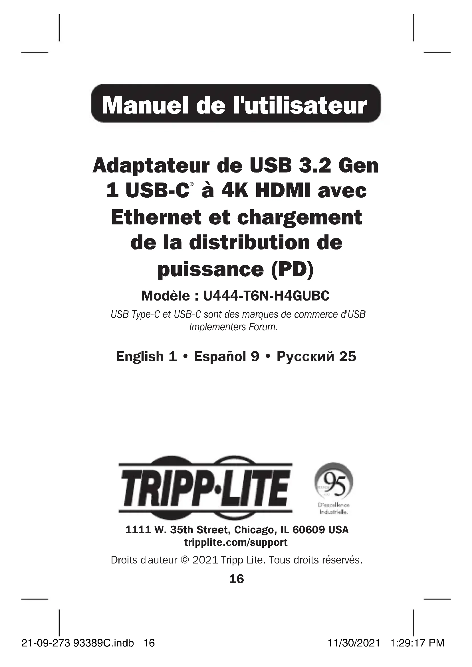 à 4K HDMI avec Ethernet et chargement de la distribution de puissance (PD) Modèle : U444-T6N-H4GUBC USB Type-C et USB-C sont des marques de commerce d'USB Implementers Forum. 1111 W. 35th Street, Chicago, IL 60609 USA tripplite.com/support Droits d'auteur © 2021 Tripp Lite. Tous droits réservés. English 1 • Español 9 • Русский 25 21-09-273 93389C.indb 1621-09-273 93389C.indb 16 11/30/2021 1:29:17 PM11/30/2021 1:29:17 PM17 L'emballage inclut