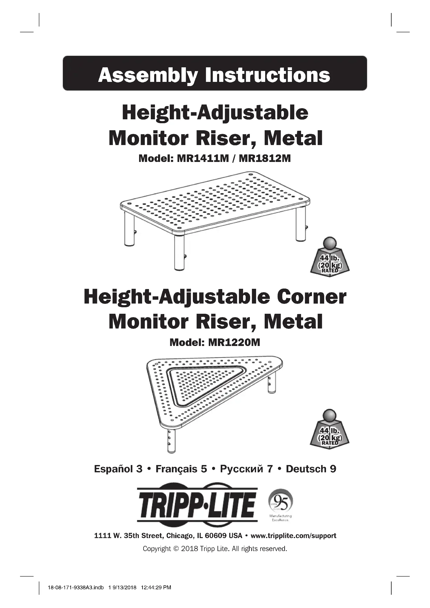 100 mm [3.94”] 18-08-171-9338A3.indb 4 9/13/2018 12:44:35 PM5 Instructions d'assemblage Base pour moniteur à hauteur réglable, en métal Modèle : MR1411M/MR1812M Cornière pour base pour moniteur à hauteur réglable, en métal Modèle : MR1220M 1111 W. 35th Street, Chicago, IL 60609 USA • www.tripplite.com/support Droits d'auteur © 2018 Tripp Lite. Tous droits réservés. 20 kg (44 lb) CAPACITÉ NOMINALE 20 kg (44 lb) CAPACITÉ NOMINALE English 1 • Español 3 • Русский 7 • Deutsch 9 18-08-171-9338A3.indb 5 9/13/2018 12:44:35 PM6 Modèle : MR1411M/MR1812M Modèle : MR1220M 1111 W. 35th Street, Chicago, IL 60609 USA www.tripplite.com/support Entretien