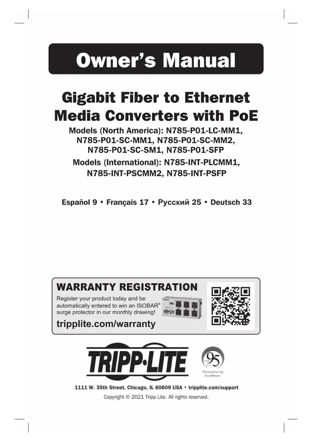 TRIPP LITE garantit que ses produits sont exempts de vices de matériaux et de fabrication pendant une période de deux (2) ans à partir de la date d'achat initiale. La responsabilité de TRIPP LITE, en vertu de la présente garantie, se limite à la réparation ou au remplacement (à sa seule discrétion) de ces produits défectueux. Pour obtenir une réparation sous cette garantie, vous devez obtenir un numéro d'autorisation de retour de matériel (« RMA ») auprès de TRIPP LITE ou d'un centre de réparation autorisé par TRIPP LITE. Les produits doivent être retournés à TRIPP LITE ou à un centre de réparation autorisé par TRIPP LITE en port prépayé et être accompagnés d'une brève description du problème et d'un justificatif de la date et du lieu d'achat. Cette garantie ne s'applique pas au matériel ayant été endommagé suite à un accident, à une négligence ou à une application abusive, ou ayant été altéré ou modifié d'une façon quelconque. SAUF DANS LES CAS PRÉVUS PAR LES PRÉSENTES, TRIPP LITE N'ACCORDE AUCUNE GARANTIE, EXPRESSE OU TACITE, Y COMPRIS DES GARANTIES DE QUALITÉ COMMERCIALE ET D'ADAPTATION À UN USAGE PARTICULIER. Certains États n'autorisant pas la limitation ni l'exclusion de garanties tacites, les limitations ou exclusions susmentionnées peuvent ne pas s'appliquer à l'acheteur. À L'EXCEPTION DES DISPOSITIONS CI-DESSUS, TRIPP LITE NE POURRA EN AUCUN CAS ÊTRE TENUE RESPONSABLE DE DOMMAGES DIRECTS, INDIRECTS, SPÉCIAUX, FORTUITS OU CONSÉCUTIFS RÉSULTANT DE L'UTILISATION DE CE PRODUIT, MÊME SI AYANT ÉTÉ AVISÉE DE L'ÉVENTUALITÉ DE TELS DOMMAGES. Plus précisément, TRIPP LITE ne pourra être tenue responsable de coûts, tels que perte de bénéfices ou de recettes, perte de matériel, impossibilité d'utilisation du matériel, perte de logiciel, perte de données, frais de produits de remplacement, réclamations d'un tiers ou autres.24 1111 W. 35th Street, Chicago, IL 60609 USA • tripplite.com/support 21-09-275 933965_RevB25 Руководство пользователя Медиаконвертеры Gigabit Fiber — Ethernet с питанием по кабелю витой пары (PoE) Модели (для Северной Америки): N785-P01-LC-MM1, N785-P01-SC-MM1, N785-P01-SC-MM2,