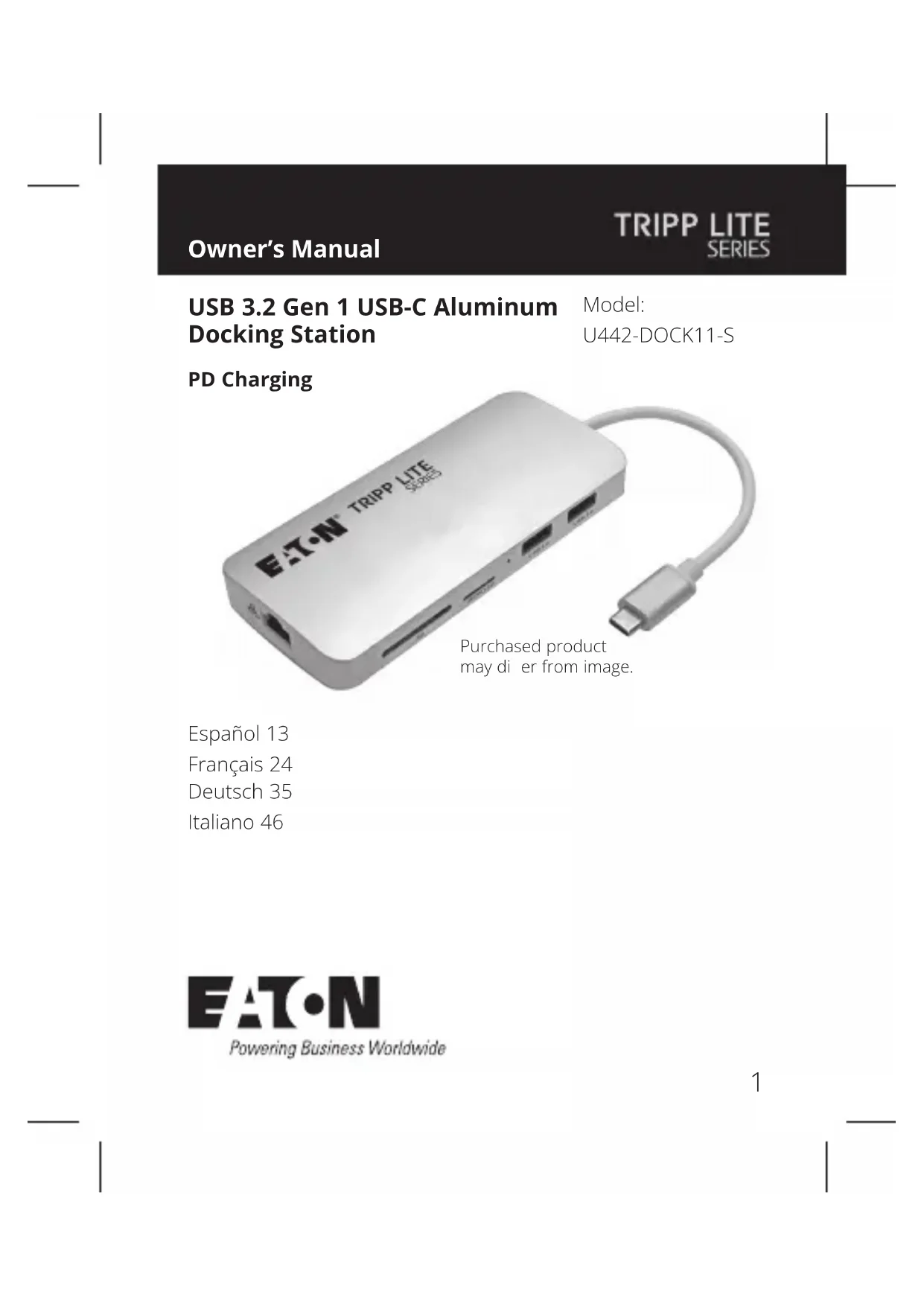 - Renvoyer le nouvel équipement pour recyclage lorsqu'il devient un déchet en n de vie L'utilisation de cet équipement dans des applications de maintien des fonctions vitales où l'on peut raisonnablement s'attendre à ce qu'une défaillance de cet équipement entraîne la défaillance de l'équipement de maintien des fonctions vitales ou aecte de manière signicative sa sécurité ou son ecacité n'est pas recommandée. Eaton mène une politique d'amélioration continue. Les caractéristiques peuvent être modiées sans préavis. Garantie Eaton 1000 Eaton Boulevard Cleveland, OH 44122 États-Unis Eaton.com © 2023 Eaton Tous droits réservés. Publication n° 23-08-335 / 93-37BC_RevD Septembre 2023 Eaton est une marque déposée. Toutes les marques commerciales appartiennent à leurs propriétaires respectifs.35 Benutzerhandbuch English 1 Español13 Français24 Italiano 46 Das gekaufte Produkt kann von der Abbildung abweichen. Modell: U442-DOCK11-Sl USB 3.2 Gen 1 USB-C-Dockingstation aus Aluminium PD-Aufladung36 Lieferumfang Optionales Zubehör