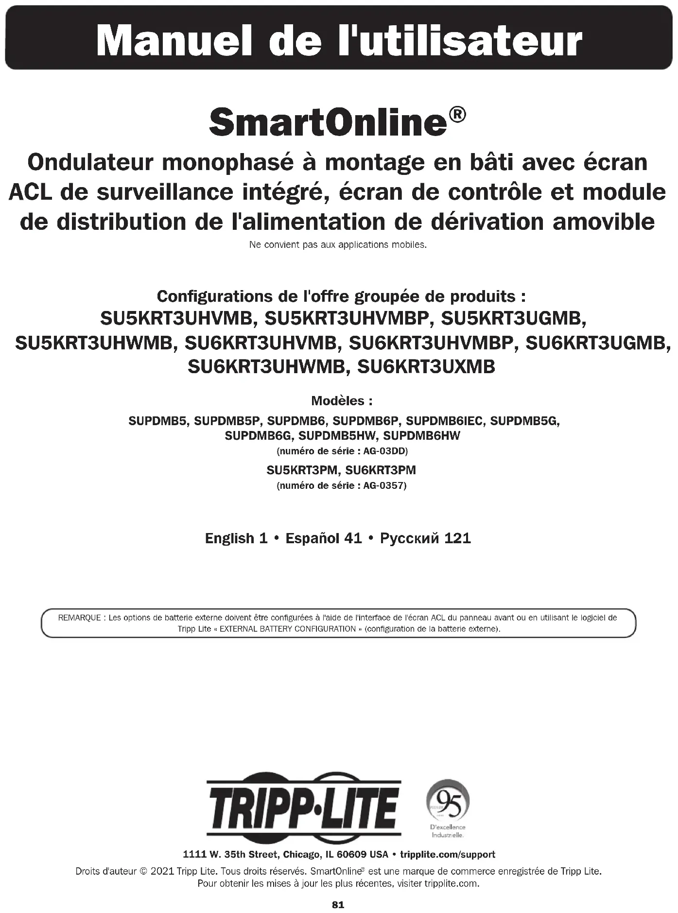 Ondulateur monophasé à montage en bâti avec écran ACL de surveillance intégré, écran de contrôle et module de distribution de l'alimentation de dérivation amovible Ne convient pas aux applications mobiles. REMARQUE : Les options de batterie externe doivent être configurées à l'aide de l'interface de l'écran ACL du panneau avant ou en utilisant le logiciel de Tripp Lite « EXTERNAL BATTERY CONFIGURATION » (configuration de la batterie externe). 1111 W. 35th Street, Chicago, IL 60609 USA • tripplite.com/supportDroits d'auteur © 2021 Tripp Lite. Tous droits réservés. SmartOnline est une marque de commerce enregistrée de Tripp Lite. Pour obtenir les mises à jour les plus récentes, visiter tripplite.com. English 1 • Español 41 • Русский 12182 Table des matières