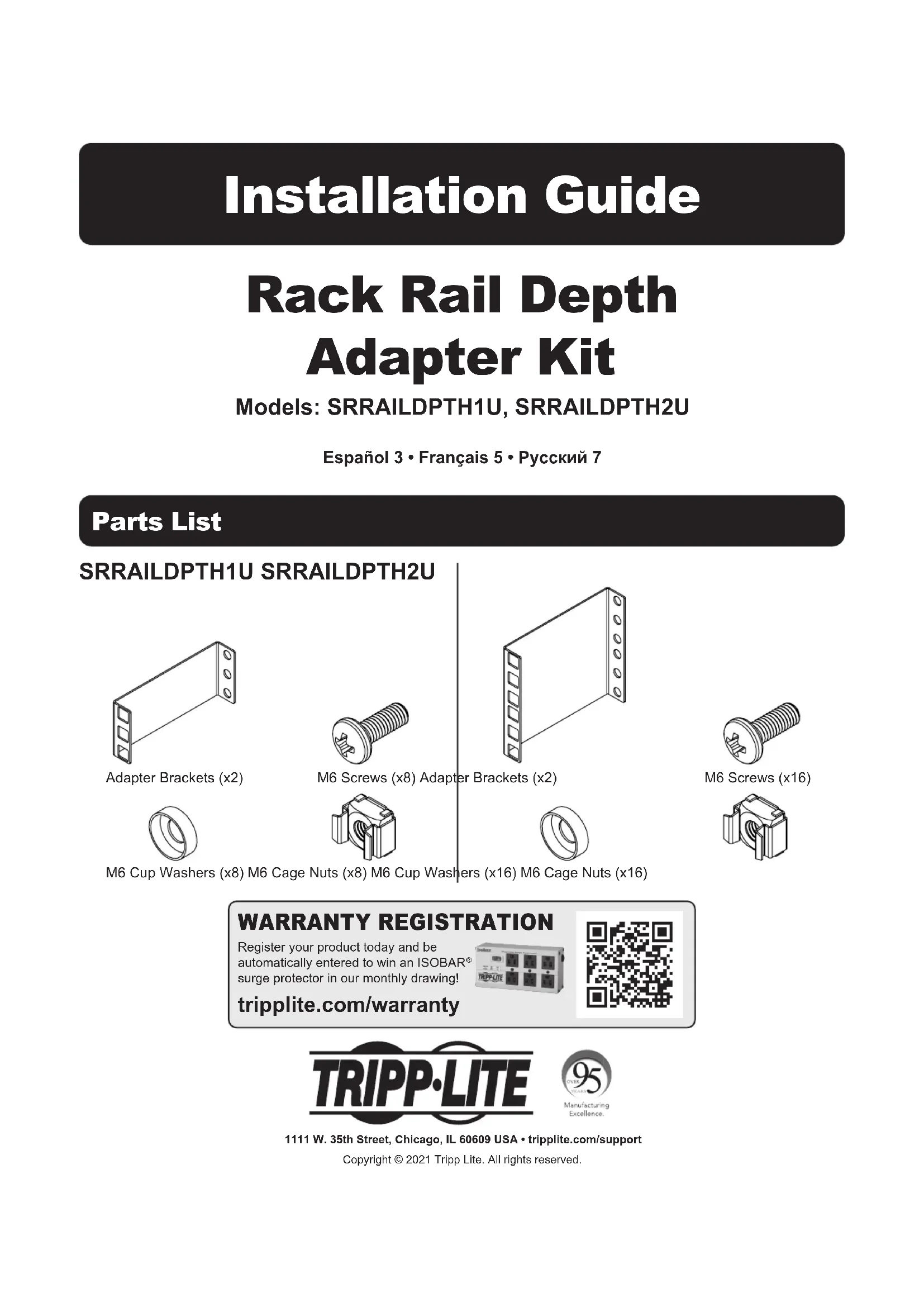 Rondelles à collerette M6 (x8) Écrous à cage M6 (x8) Rondelles à collerette M6 (x16)Écrous à cage M6 (x16)6 1111 W. 35th Street, Chicago, IL 60609 USA tripplite.com/support21-04-297 93-3E42_RevA Installation La politique de Tripp Lite en est une d'amélioration continue. Les caractéristiques techniques sont modifiables sans préavis. Les produits réels peuvent différer légèrement des photos et des illustrations. Trous pour le montage en bâti Trous pour le montage de l'équipement Pour AUGMENTER la profondeur du bâti À utiliser pour le montage en bâti de composants plus LONGS.
