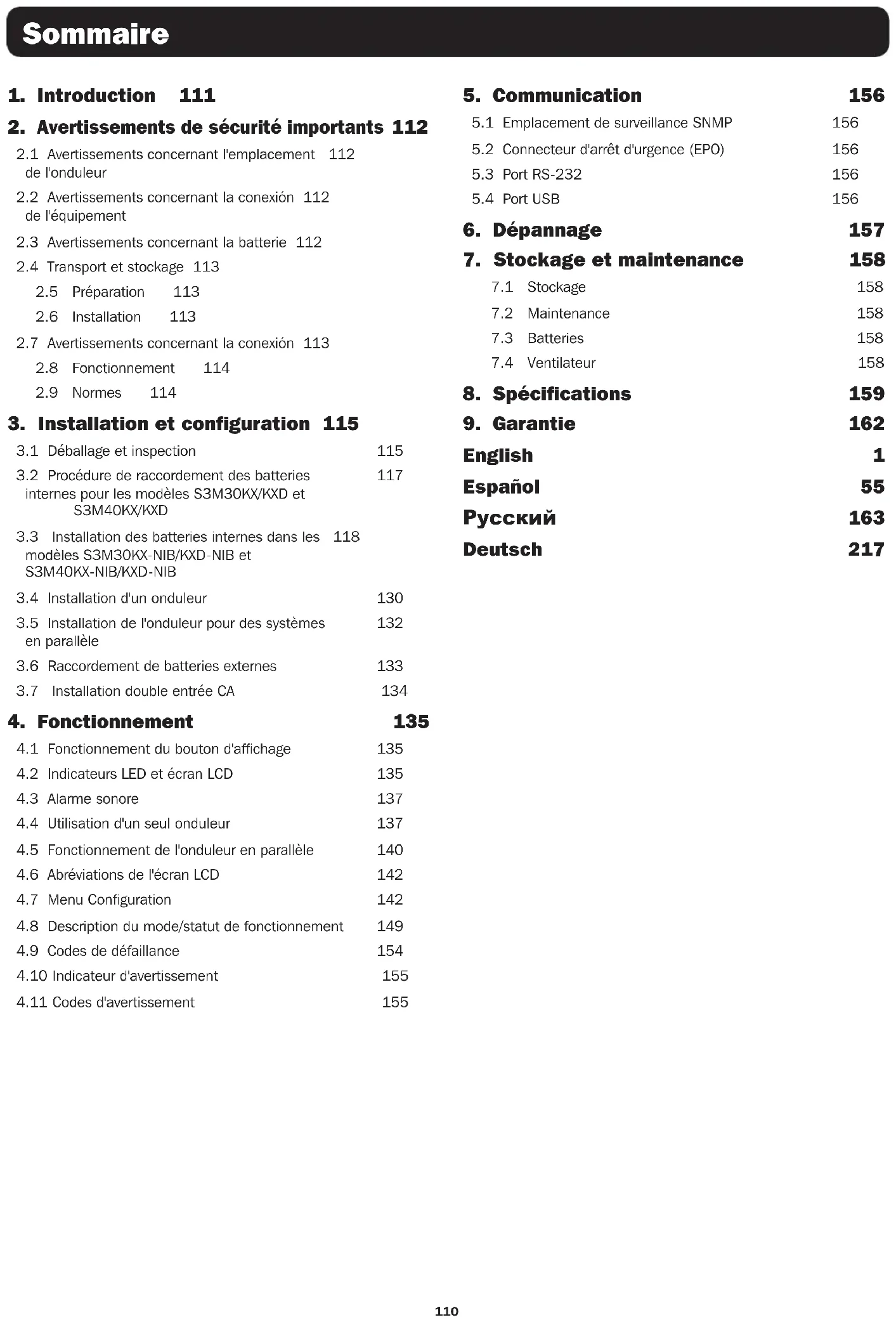 Si des erreurs se produisent dans l'onduleur mais qu'il continue à fonctionner normalement, l'écran LCD affiche un avertissement. Dans l'écran d'avertissement, l'icône clignote. Jusqu'à trois codes d'erreur peuvent être affichés, chaque code indiquant une erreur. Code d'aver- tissement Événement d'avertissement Code d'aver- tissement Événement d'avertissement 01 Batterie débranchée 22 Les situations de dérivation sont différentes dans un système en parallèle 02 Perte de neutre IP 33 Verrouillé en dérivation après 3 surcharges en 30 minutes 04 Phase IP anormale 34 Déséquilibre du courant du convertisseur 05 Phase de dérivation anormale 3A Couvercle du commutateur de maintenance ouvert 07 Surcharge 3C Puissance utilitaire extrêmement instable 08 Batteries faibles 3D Dérivation instable 09 Surcharge 3E La tension fournie par les batteries est trop élevée 0A Défaillance du ventilateur 3F Tension de la batterie déséquilibrée 0B Activation de l'arrêt d'urgence 40 Chargeur court-circuité 0D Surchauffe 44 Échec du paramètre de redondance 0E Défaillance du chargeur 24 Charges de sortie parallèles différentes 21 Les situations de ligne sont différentes dans un sys- tème en parallèle 35 Batterie fusible ouverte156