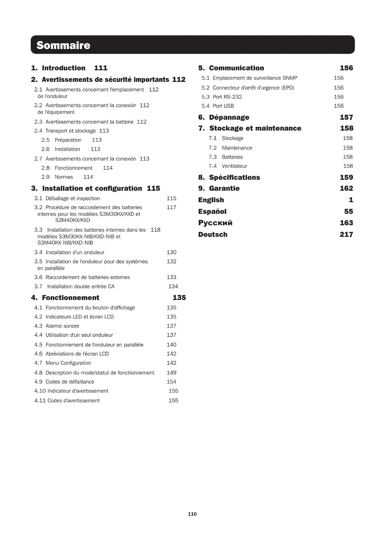 Si des erreurs se produisent dans l'onduleur mais qu'il continue à fonctionner normalement, l'écran LCD affiche un avertissement. Dans l'écran d'avertissement, l'icône clignote. Jusqu'à trois codes d'erreur peuvent être affichés, chaque code indiquant une erreur. Code d'aver- tissement Événement d'avertissement Code d'aver- tissement Événement d'avertissement 01 Batterie débranchée 22 Les situations de dérivation sont différentes dans un système en parallèle 02 Perte de neutre IP 33 Verrouillé en dérivation après 3 surcharges en 30 minutes 04 Phase IP anormale 34 Déséquilibre du courant du convertisseur 05 Phase de dérivation anormale 3A Couvercle du commutateur de maintenance ouvert 07 Surcharge 3C Puissance utilitaire extrêmement instable 08 Batteries faibles 3D Dérivation instable 09 Surcharge 3E La tension fournie par les batteries est trop élevée 0A Défaillance du ventilateur 3F Tension de la batterie déséquilibrée 0B Activation de l'arrêt d'urgence 40 Chargeur court-circuité 0D Surchauffe 44 Échec du paramètre de redondance 0E Défaillance du chargeur 24 Charges de sortie parallèles différentes 21 Les situations de ligne sont différentes dans un sys- tème en parallèle 35 Batterie fusible ouverte156