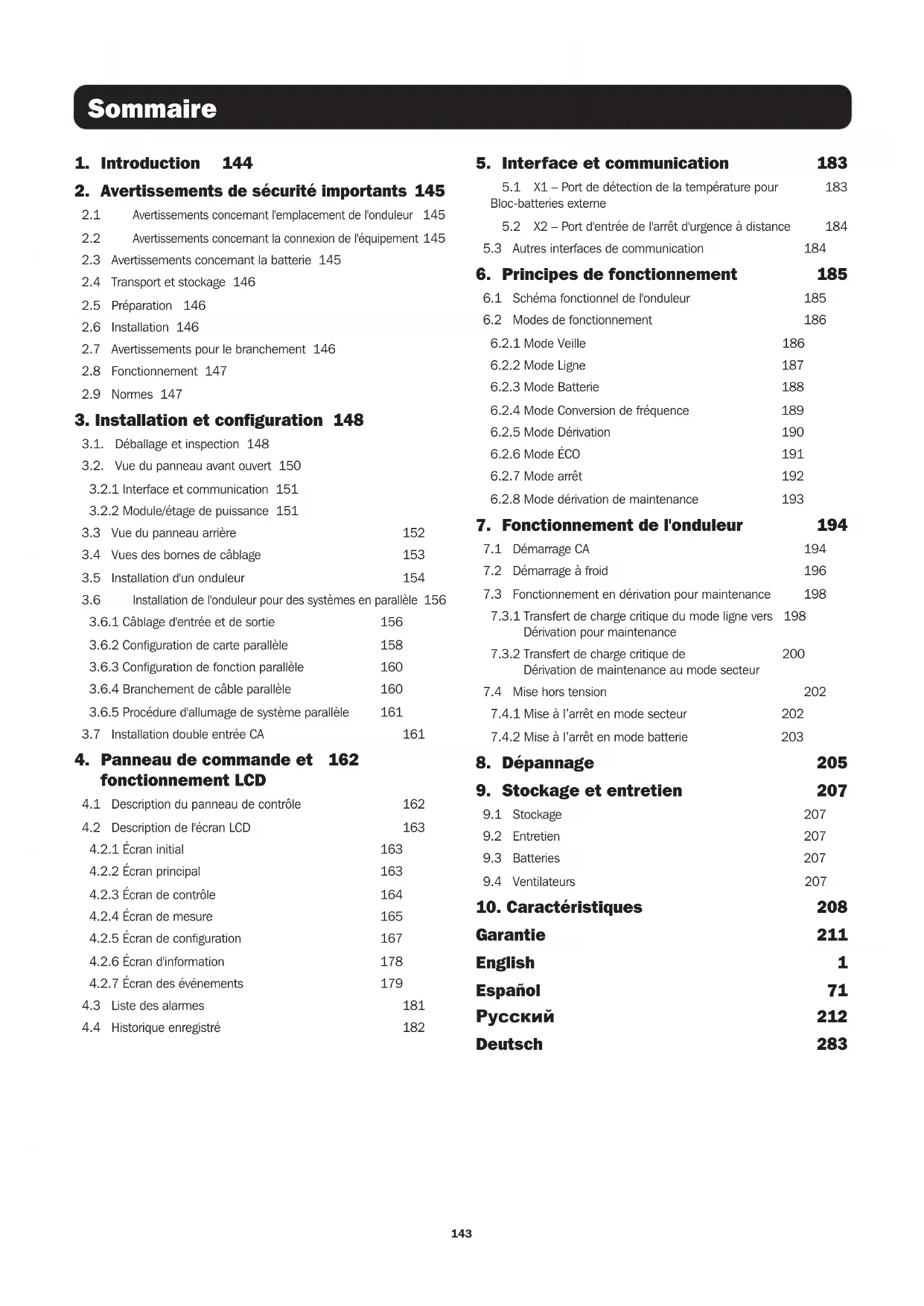 Les événements d'avertissement et de défaillance doivent être examinés par du personnel d'entretien agréé. Message sur l'écran LCD Explication Solution Fault! Bus Over Voltage La tension du bus CC est trop élevée. Contactez le personnel d'entretien. Fault! Bus Under Voltage La tension du bus CC est trop faible. Contactez le personnel d'entretien. Fault! Bus Voltage Unbalance La tension du bus CC n'est pas équilibrée. Contactez le personnel d'entretien. Fault! Bus Short Le bus CC est en court-circuit. Contactez le personnel d'entretien. Fault! Bus Soft Start Time Out Les redresseurs n'ont pas pu démarrer à cause d'une tension faible du bus CC dans le temps indiqué. Éteignez l'onduleur, puis redémarrez-le. En cas de nouvelle défaillance, contactez le personnel d'entretien. Fault! Inverter Soft Start Time Out La tension de l'onduleur n'atteint pas la tension désirée dans le temps indiqué. Éteignez l'onduleur, puis redémarrez-le. En cas de nouvelle défaillance, contactez le personnel d'entretien. Fault! Inverter Voltage Over La tension de l'onduleur a dépassé la valeur de crête. Contactez le personnel d'entretien. Fault! Inverter Voltage High La tension de l'onduleur est trop élevée. Contactez le personnel d'entretien. Fault! Inverter Voltage Low La tension de l'onduleur est trop faible. Contactez le personnel d'entretien. Fault! R Inverter Voltage Short La sortie phase R de l'onduleur présente un court- circuit. Contactez le personnel d'entretien. Fault! S Inverter Voltage Short La sortie phase S de l'onduleur présente un court- circuit. Contactez le personnel d'entretien. Fault! T Inverter Voltage Short La sortie phase T de l'onduleur présente un court- circuit. Contactez le personnel d'entretien. Fault! RS Inverter Voltage Short La sortie R-S de l'onduleur présente un court-circuit. Contactez le personnel d'entretien. Fault! ST Inverter Voltage Short La sortie S-T de l'onduleur présente un court-circuit. Contactez le personnel d'entretien. Fault! TR Inverter Voltage Short La sortie T-R de l'onduleur présente un court-circuit. Contactez le personnel d'entretien. Fault! Inverter R Negative Power Alimentation négative de la sortie phase R de l'onduleur sur la plage. Contactez le personnel d'entretien. Fault! Inverter S Negative Power Alimentation négative de la sortie phase S de l'onduleur sur la plage. Contactez le personnel d'entretien. Fault! Inverter T Negative Power Alimentation négative de la sortie phase T de l'onduleur sur la plage. Contactez le personnel d'entretien. Fault! Over Load Fault Une forte surcharge provoque une défaillance de l'onduleur. Diminuez la charge. Fault! Battery Fault Batterie inversée. Vérifiez la polarité des branchements de la batterie et contactez le personnel d'entretien. Fault! Over Temperature Assurez-vous qu'un espacement adapté est dégagé pour permettre le fonctionnement du ventilateur et des aérations de ventilation. Vérifiez si la température ambiante dépasse les caractéristiques spécifiées ou contactez le personnel d'entretien. Fault! CAN Fault Défaillance de la communication CAN. Contactez le personnel d'entretien. Fault! TRIG0 Fault Défaillance du signal de déclenchement synchronisé. Contactez le personnel d'entretien. Fault! Relay Fault Défaillance du relais de l'onduleur. Contactez le personnel d'entretien. Fault! Line SCR Fail Défaillance à cause du court-circuit de la ligne SCR. Contactez le personnel d'entretien. Fault! EEPROM Fault Erreur de fonctionnement de l'EEPROM. Contactez le personnel d'entretien. Fault! Parallel Cable Loosen Fault Défaillance due au débranchement du câble parallèle. Vérifiez si le câble parallèle est débranché et contactez le personnel d'entretien. Fault! DSP MCU Stop Communicate Arrêt de communication MCU DSP. Contactez le personnel d'entretien. Fault! Bypass Temperature Fault Défaillance de la température de dérivation. Vérifiez si la température ambiante dépasse les caractéristiques spécifiées ou contactez le personnel d'entretien. Fault! Bypass SCR Fault Défaillance de dérivation SCR. Contactez le personnel d'entretien. Warning! EPO Active Vérifiez le connecteur d'arrêt d'urgence. Vérifiez si le connecteur est débranché quand l'arrêt d'urgence ne fonctionne pas normalement. Warning! Over Load Fail Les appareils en charge demandent plus de puissance que celle que l'onduleur peut fournir. Le mode Ligne passe en mode Dérivation. Réduisez certaines charges et vérifiez que la capacité et la charge de sortie respectent les caractéristiques spécifiées. Warning! Communicate CAN Fail Erreur de communication CAN. Contactez le personnel d'entretien.206