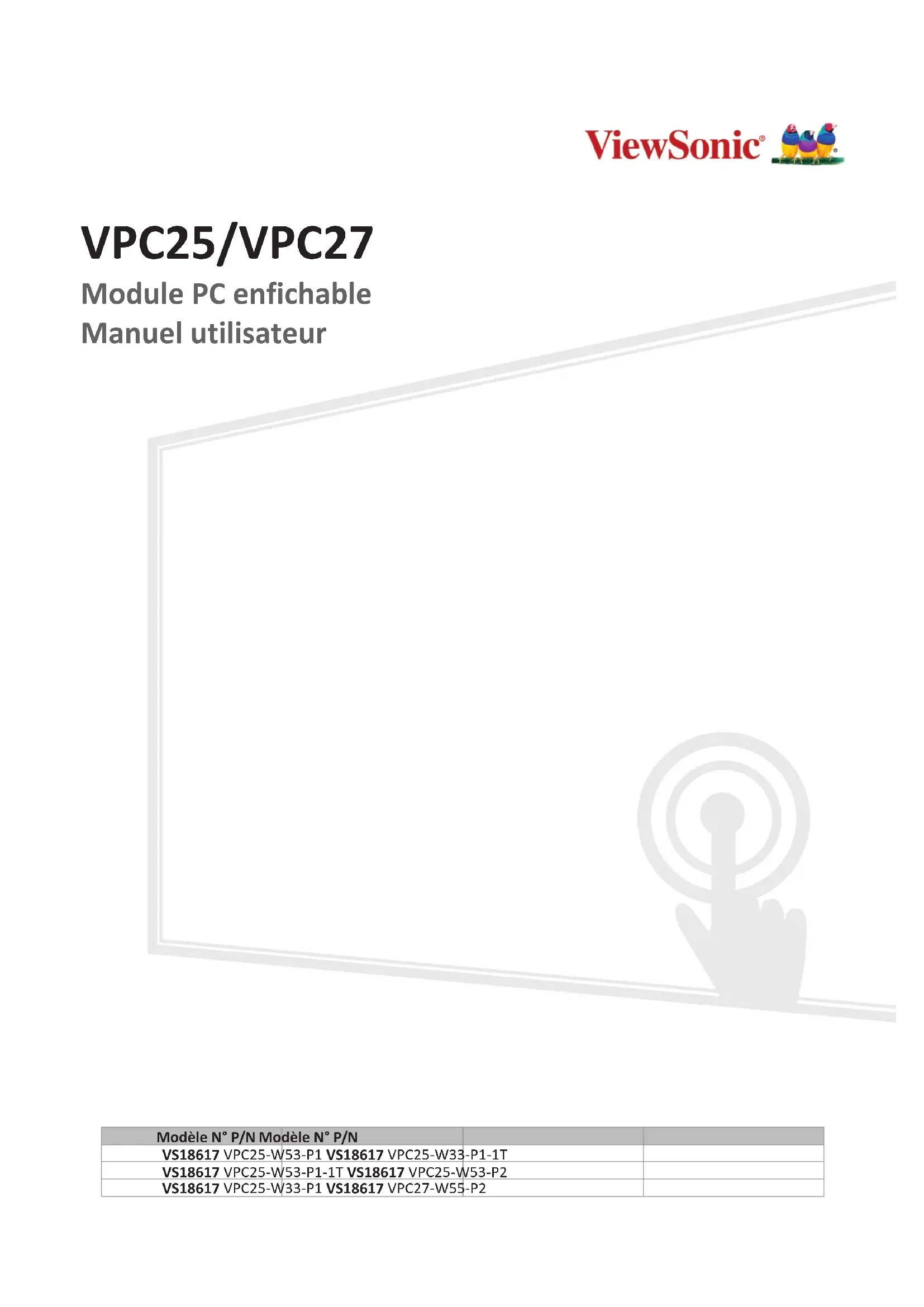 VPC25/VPC27 Module PC enfichable Manuel utilisateur Modèle N° P/N Modèle N° P/N VS18617 VPC25-W53-P1 VS18617 VPC25-W33-P1-1T VS18617 VPC25-W53-P1-1T VS18617 VPC25-W53-P2 VS18617 VPC25-W33-P1 VS18617 VPC27-W55-P22 Merci d’avoir choisi ViewSonic® En tant que leader mondial de solutions visuelles, ViewSonic® se consacre à dépasser les attentes du monde en matière d’évolution technologique, d’innovation et de simplicité. Chez ViewSonic®, nous pensons que nos produits peuvent avoir un impact positif dans le monde et nous sommes convaincus que le produit ViewSonic® que vous avez choisi vous servira correctement. Une fois de plus, merci d’avoir choisi ViewSonic® !3
