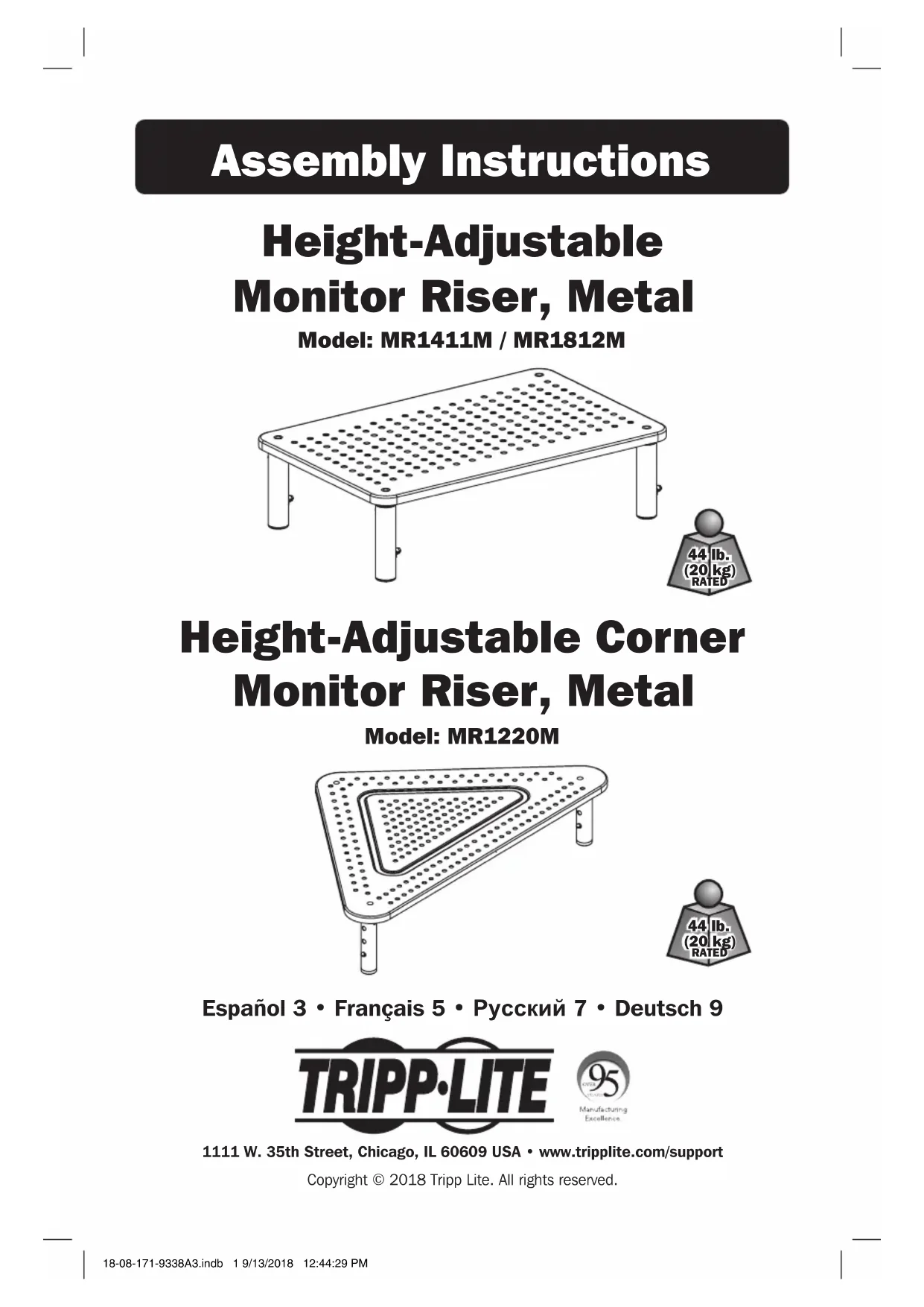 100 mm [3.94”] 18-08-171-9338A3.indb 4 9/13/2018 12:44:35 PM5 Instructions d'assemblage Base pour moniteur à hauteur réglable, en métal Modèle : MR1411M/MR1812M Cornière pour base pour moniteur à hauteur réglable, en métal Modèle : MR1220M 1111 W. 35th Street, Chicago, IL 60609 USA • www.tripplite.com/support Droits d'auteur © 2018 Tripp Lite. Tous droits réservés. 20 kg (44 lb) CAPACITÉ NOMINALE 20 kg (44 lb) CAPACITÉ NOMINALE English 1 • Español 3 • Русский 7 • Deutsch 9 18-08-171-9338A3.indb 5 9/13/2018 12:44:35 PM6 Modèle : MR1411M/MR1812M Modèle : MR1220M 1111 W. 35th Street, Chicago, IL 60609 USA www.tripplite.com/support Entretien