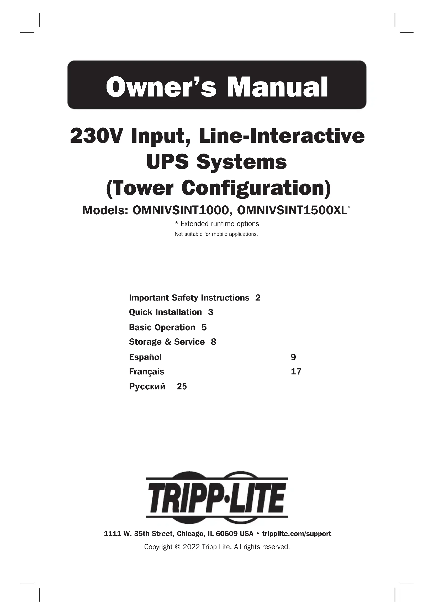 Returns (retour du produit). De cet endroit, vous pouvez demander un numéro d’autorisation de retour de matériel (RMA) qui est exigé pour une réparation. Ce formulaire en ligne simple vous demandera le numéro de modèle et le numéro de série de votre unité ainsi que d’autres renseignements généraux concernant l’acheteur. Le numéro RMA, ainsi que les instructions concernant le transport vous seront acheminées par courriel. Tout dommage (direct, indirect, spécial ou fortuit) survenu au produit pendant le transport à Tripp Lite ou à un centre de service autorisé Tripp Lite est exclu de la garanti. Les produits expédiés à Tripp Lite ou à un centre de service autorisé doivent être prépayés. Inscrire le numéro RMA sur le paquet. Si le produit est encore couvert par la garantie de deux ans, joindre une copie de votre facture d’achat. Retourner le produit pour réparation par un transporteur assuré à l’adresse qui vous a été donnée lorsque vous avez demandé le RMA. Numéros d’identification de conformité aux règlements À des fins de certification et d’identification de conformité aux règlements, votre produit Tripp Lite a reçu un numéro de série unique. Ce numéro se retrouve sur la plaque signalétique du produit, avec les inscriptions et informations d’approbation requises. Lors d’une demande d’information de conformité pour ce produit, utilisez toujours le numéro de série. Il ne doit pas être confondu avec le nom de la marque ou le numéro de modèle du produit.L’information de conformité WEEE pour les clients de Tripp Lite et recycleurs (Union européenne)Sous les directives et règlements de déchet d’équipements électrique et électronique (Waste Electrical and Electronic Equipment, WEEE), lorsque les clients achètent le matériel électrique et électronique neuf de Tripp Lite ils sont autorisés à :• Envoyer le vieux matériel pour le recyclage sur une base de un-contre-un et en nature (ceci varie selon le pays)• Renvoyer le matériel neuf pour recyclage quand ceci devient éventuellement un rebut La politique de Tripp Lite en est une d’amélioration continue. Les spécifications sont sujettes à changement sans préavis. Les produits réels peuvent différer légèrement des photos et des illustrations. Note sur l’étiquetage Deux symboles sont utilisés sur les étiquettes. V~ : Tension CA V : Tension CC 1111 W. 35th Street, Chicago, IL 60609 USA tripplite.com/support 22-05-094 93-2205_revD25 1111 W. 35th Street, Chicago, IL 60609 USA • tripplite.com/supportОхраняется авторским правом © 2022 Tripp Lite. Перепечатка запрещается. Руководство пользователя Линейно-интерактивные ИБП на входное напряжение 230 В (для вертикальной установки) Модели: OMNIVSINT1000, OMNIVSINT1500XL