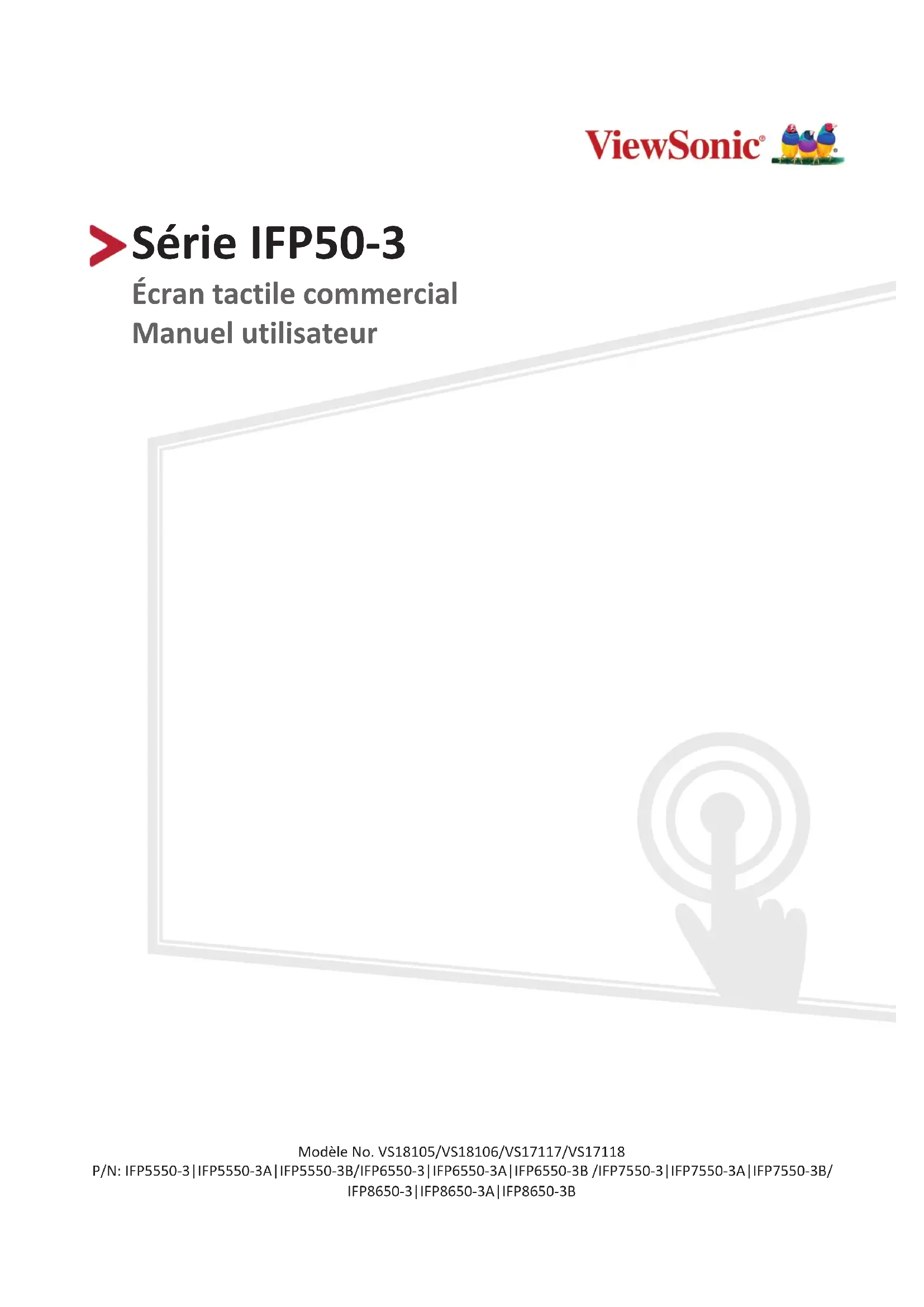 Série IFP50-3 Écran tactile commercial Manuel utilisateur Modèle No. VS18105/VS18106/VS17117/VS17118 P/N: IFP5550-3|IFP5550-3A|IFP5550-3B/IFP6550-3|IFP6550-3A|IFP6550-3B /IFP7550-3|IFP7550-3A|IFP7550-3B/ IFP8650-3|IFP8650-3A|IFP8650-3B2 Merci d'avoir choisi ViewSonic® En tant que leader mondial de solutions visuelles, ViewSonic® se consacre à dépasser les attentes du monde en matière d’évolution technologique, d’innovation et de simplicité. Chez ViewSonic®, nous pensons que nos produits peuvent avoir un impact positif dans le monde et nous sommes convaincus que le produit ViewSonic® que vous avez choisi vous servira correctement. Une fois de plus, merci d’avoir choisi ViewSonic® !3 Consignes de sécurité Veuillez lire les Précauons de sécurité qui suivent avant de commencer à uliser l'appareil.
