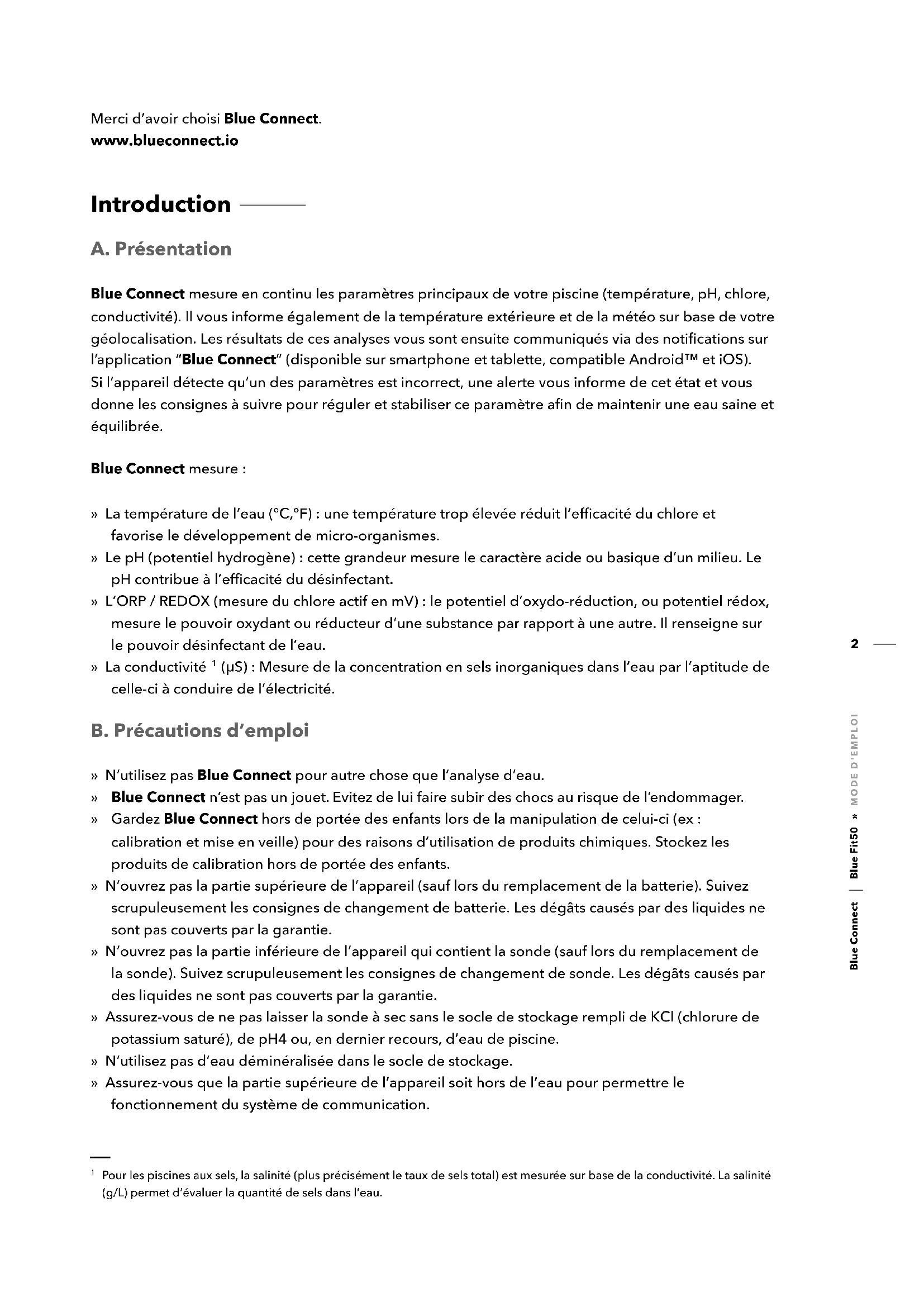 Pour les piscines aux sels, la salinité (plus précisément le taux de sels total) est mesurée sur base de la conductivité. La salinité (g/L) permet d’évaluer la quantité de sels dans l’eau.3 Blue Connect Blue Fit50 » MODE D' EMPLOI » Ne laissez pas Blue Connect dans une eau à moins de 5°C ou à plus de 50°C. » Conservez le numéro de série et le code