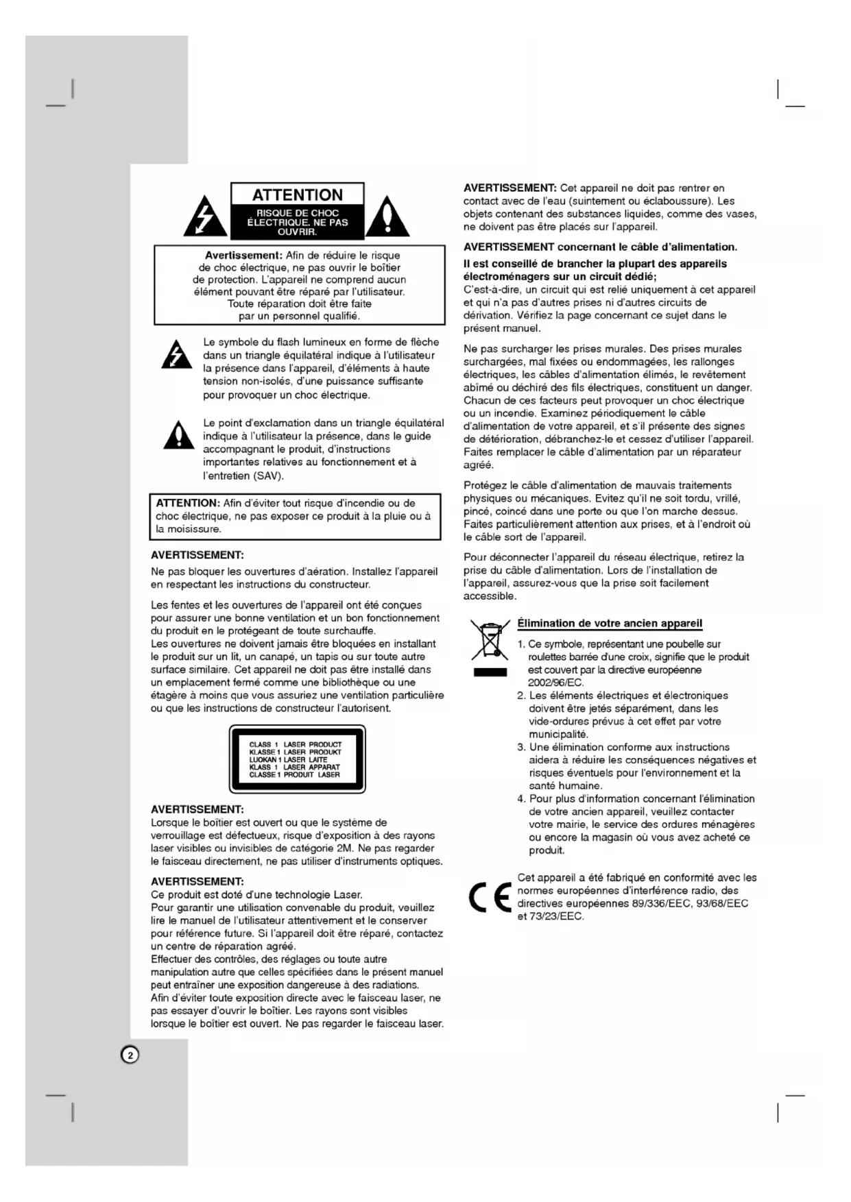 produit estdoted'une technologie Laser.Pour garantir uneutilisationconvenabledu produit, veuillezlirelemanuel del'utilisateurattentivementetleconserverpourreferencefuture. Si l'appareil doitetre repare, contactezuncentrede reparation agree. Effectuerdes controles, des reglages outouteautre manipulation autrequecelles specifiees dansle present manuel peut entrainerune exposition dangereuse adesradiations.Afind'evitertoute exposition directeaveclefaisceau laser, nepasessayerd'ouvrirleboitier.Lesrayonssontvisibles lorsque leboitierestouvert.Nepas regarder lefaisceaulaser.AVERTISSEMENT:Cet appareil nedoitpasrentrerencontactavecdel'eau (suintement eclaboussure). Les objets contenantdessubstances liquides, commedesvases,nedoiventpasetre places sur l'appareil. AVERTISSEMENTconcernantlecabled'alimentation.Ilest conseille debrancherla plupart des appareils electromenagers sur
