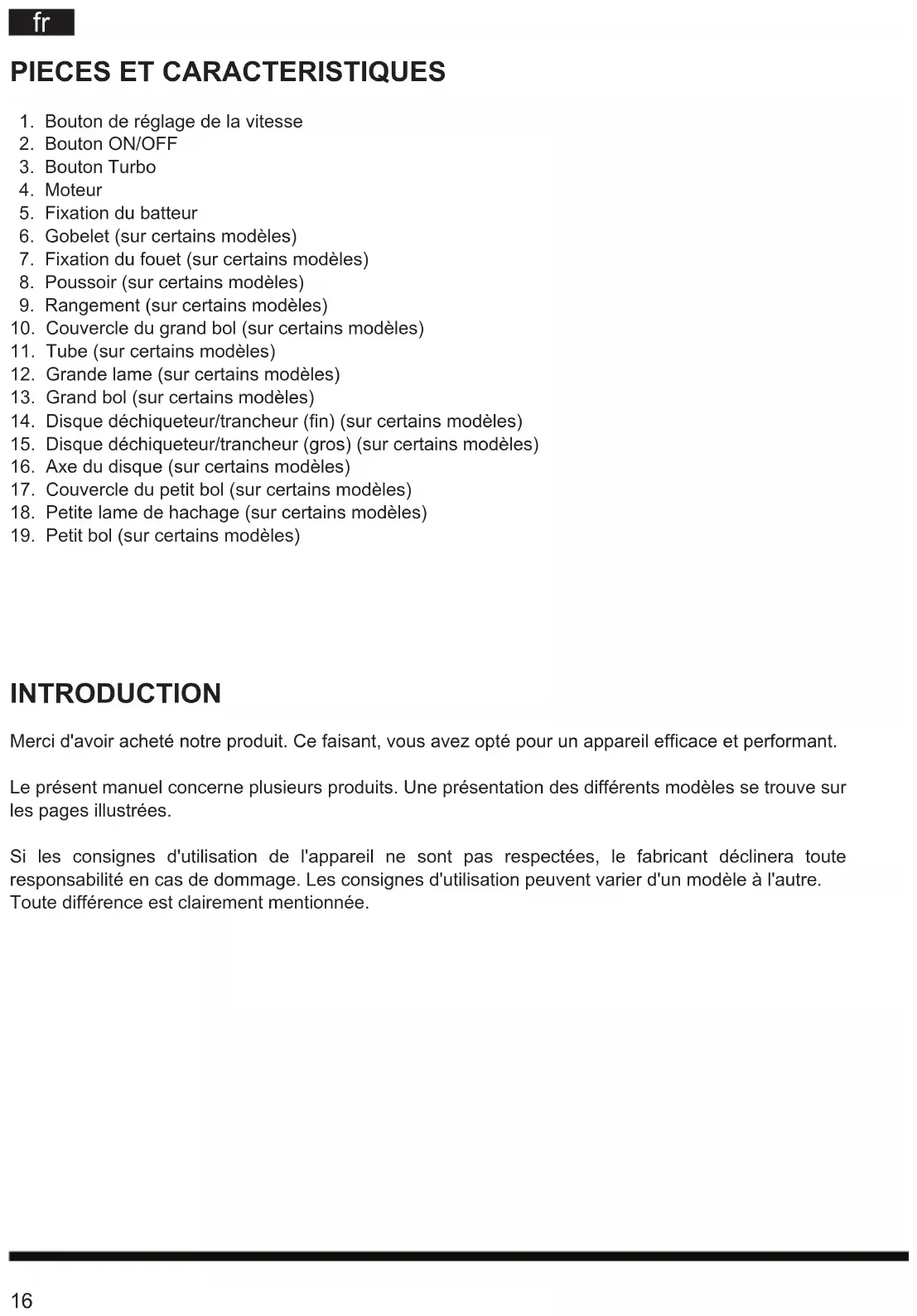 INTRODUCTION Merci d'avoir acheté notre produit. Ce faisant, vous avez opté pour un appareil efcace et performant. Le présent manuel concerne plusieurs produits. Une présentation des différents modèles se trouve sur les pages illustrées. Si les consignes d'utilisation de l'appareil ne sont pas respectées, le fabricant déclinera toute responsabilité en cas de dommage. Les consignes d'utilisation peuvent varier d'un modèle à l'autre. Toute différence est clairement mentionnée.17