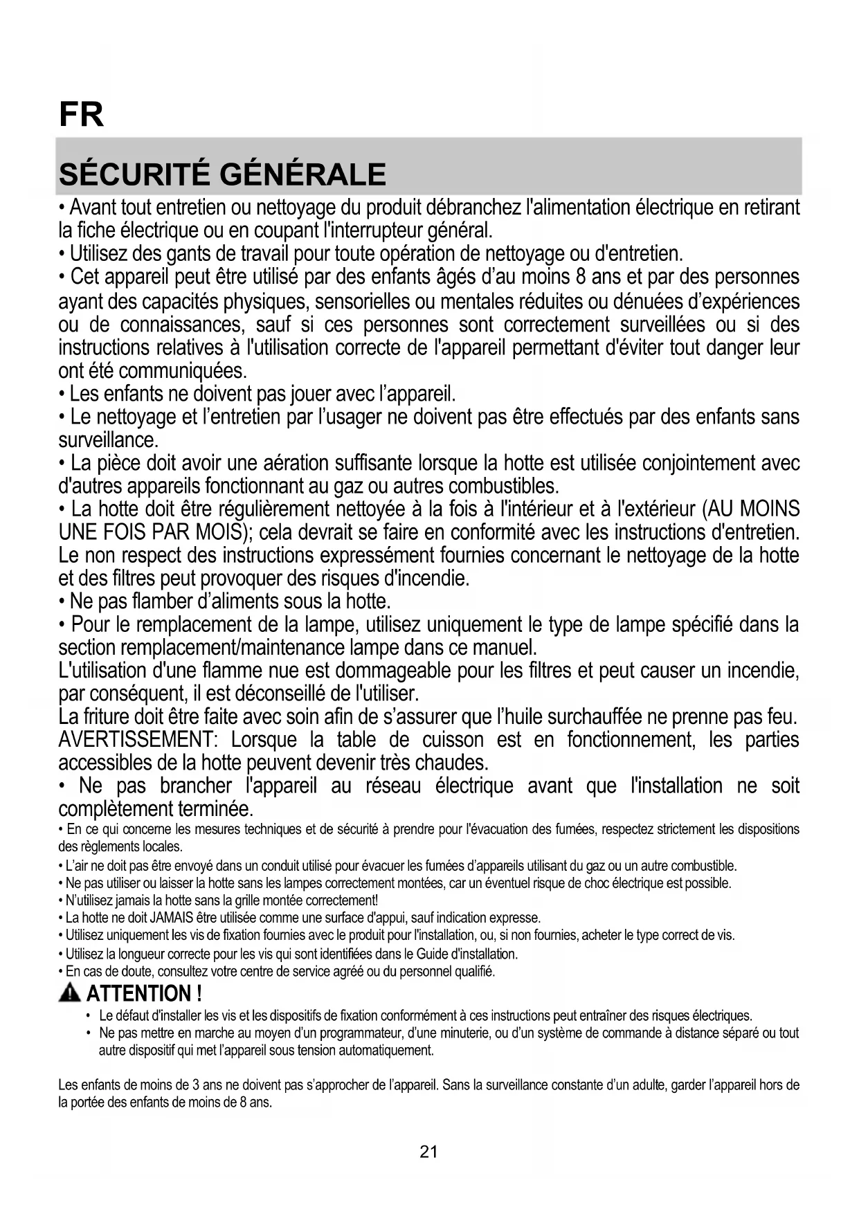 - Ne pas utiliser ou laisser la hotte sans les lampes correctement montées, car un éventuel risque de choc électrique est possible.