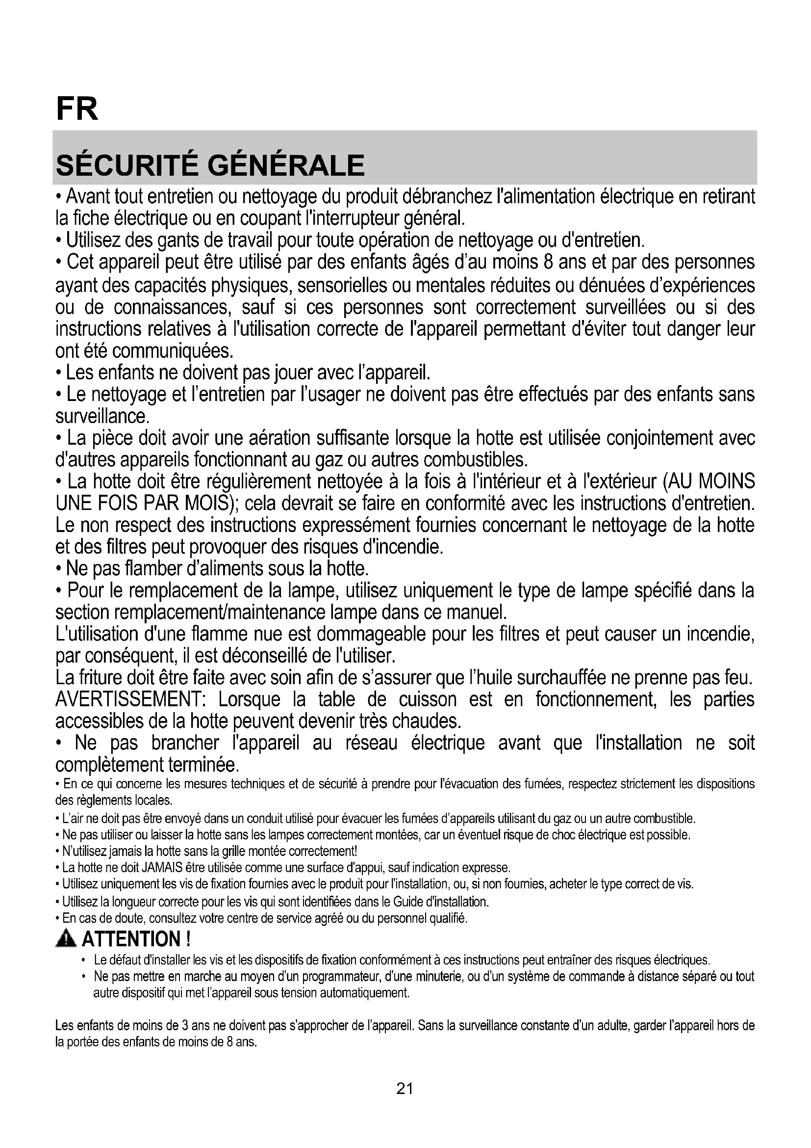 - Ne pas utiliser ou laisser la hotte sans les lampes correctement montées, car un éventuel risque de choc électrique est possible.