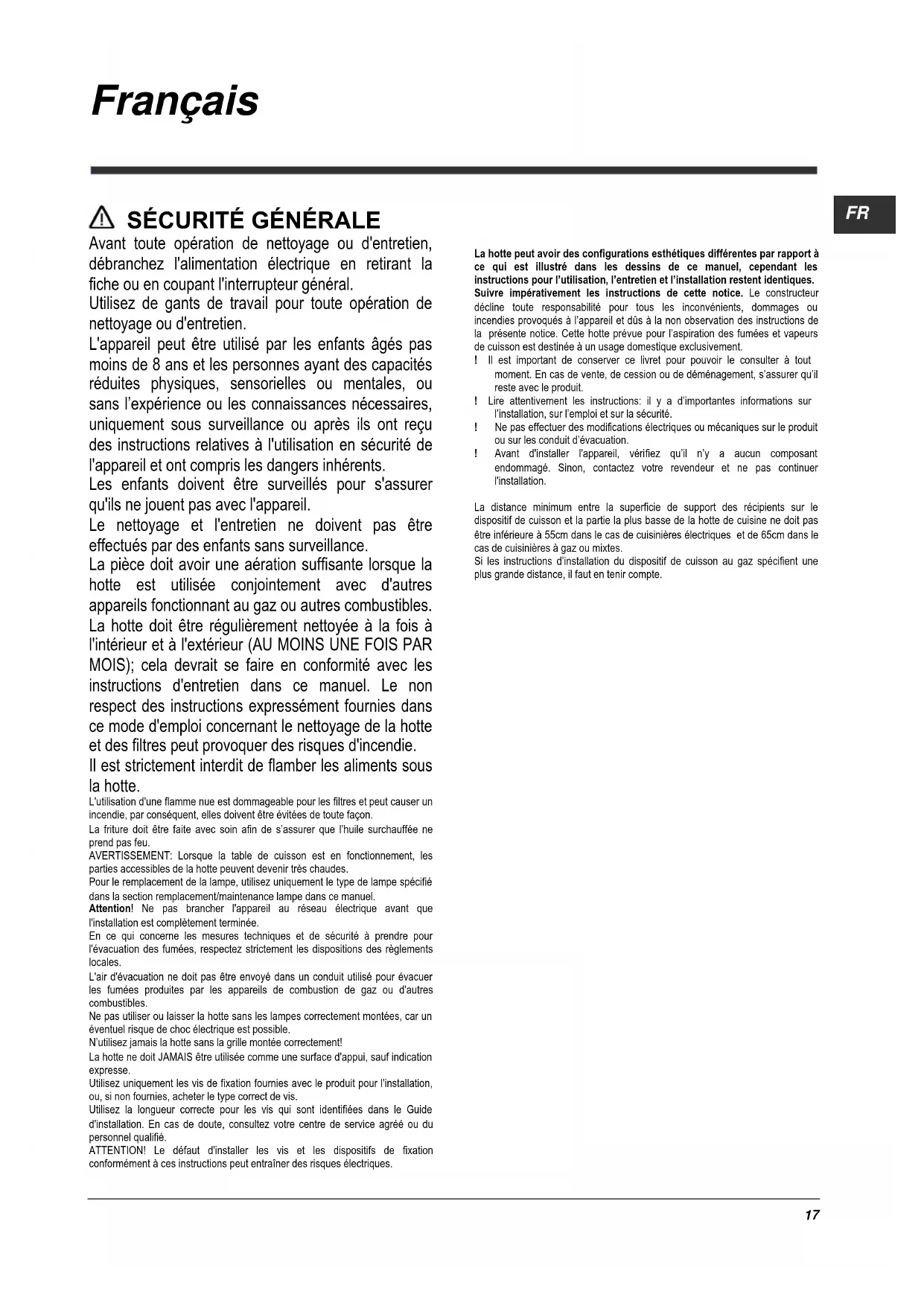 Avant toute opération de nettoyage ou d'entretien, débranchez l'alimentation électrique en retirant la fiche ou en coupant l'interrupteur général. Utilisez de gants de travail pour toute opération de nettoyage ou d'entretien. L'appareil peut être utilisé par les enfants âgés pas moins de 8 ans et les personnes ayant des capacités réduites physiques, sensorielles ou mentales, ou sans l’expérience ou les connaissances nécessaires, uniquement sous surveillance ou après ils ont reçu des instructions relatives à l'utilisation en sécurité de l'appareil et ont compris les dangers inhérents. Les enfants doivent être surveillés pour s'assurer qu'ils ne jouent pas avec l'appareil. Le nettoyage et l'entretien ne doivent pas être effectués par des enfants sans surveillance. La pièce doit avoir une aération suffisante lorsque la hotte est utilisée conjointement avec d'autres appareils fonctionnant au gaz ou autres combustibles. La hotte doit être régulièrement nettoyée à la fois à l'intérieur et à l'extérieur (AU MOINS UNE FOIS PAR MOIS); cela devrait se faire en conformité avec les instructions d'entretien dans ce manuel. Le non respect des instructions expressément fournies dans ce mode d'emploi concernant le nettoyage de la hotte et des filtres peut provoquer des risques d'incendie. Il est strictement interdit de flamber les aliments sous la hotte. L'utilisation d'une flamme nue est dommageable pour les filtres et peut causer un incendie, par conséquent, elles doivent être évitées de toute façon. La friture doit être faite avec soin afin de s’assurer que l’huile surchauffée ne prend pas feu.