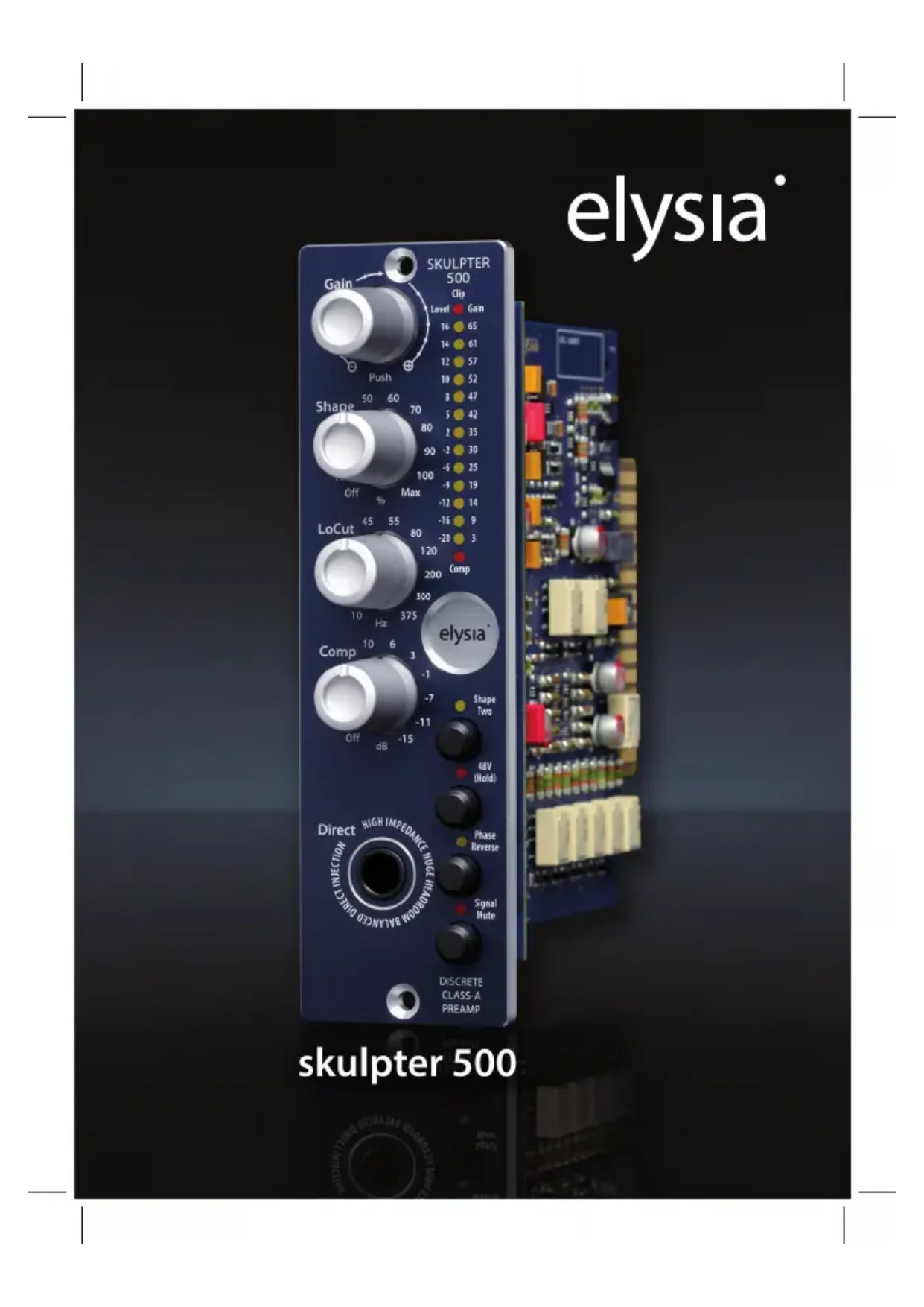 Compresseur Embarqué Intelligent Le skulpter 500 est équipé d’un compresseur dont le réglage se résume à un seul bouton. Son poten- tiomètre permet de régler le seuil avec un ratio xe de 3:1 et une courbe de compression de type “soft knee”. Les temps d’attack et release ont été choisis pour leur versatilité. Ce n’est pas nit! Le fonctionnement simplissime mais redou- table de ce compresseur bénécie de la fonction spéciale Auto Fast d’elysia permettant de réduire le temps d’attack à son minimum sur les transitoires les plus fortes. D’un point de vue technique, le VCA discret utilisé pour ré- duire le gain opère en feedback négatif avec l’ampli op qui le suit. Le signal passera dans le circuit de compression que lorsqu’il est opérant. Si aucune compression n’est déclenchée, le circuit du compresseur est simplement ‘bypassé’. Le fonctionnement est simplissime: Si vous désirez plus de compression, tournez ‘Comp’ vers la droite. Pour aucune com- pression, tournez-le complètement à gauche. Niveau d’entrée (dBu) Niveau de sortie (dBu) Caractéristiques de Compression39 Indicateur Multifonction Les quinze LEDs de l’indicateur de niveau du skulpter 500 vous informent sur quatre données importantes: Saturation de l’Entrée Une LED unique située au sommet de la colonne s’allume dès que le niveau maximal d’entrée est dépassé. Si l’entrée n’est pas en surcharge, on est certain que le reste du circuit audio ne le sera pas non plus. La LED brillera d’autant plus fort que la surcharge augmente. Compression Une autre LED unique située tout en bas de la colonne vous indique le niveau de réduction de gain appliqué au signal si le compresseur est activé. Cette LED varie en intensité en fonc- tion de l’importance de la compression. Indicateur de Niveau Les treize LEDs situées au milieu de la colonne vous informent sur le niveau de sortie du préamplicateur. Pour plus de préci- sion dans la lecture des valeurs les LEDs changent elles aussi en intensité. Les eets de niveau induits par le compresseur ou les sections de coloration peuvent aussi être visualisés sur cet indicateur. Indicateur de Gain Si on appuie sur l’encodeur de gain, l’indicateur de niveau passe alors en mode indicateur de gain. L’échelle à lire est dans ce cas celle située à droite de la colonne avec comme valeurs indiquées celles concernant le gain que le préampli génère.40 Données techniques Réponse fréquentielle @ 3dB gain: 10Hz - 170kHz (-3dB) Réponse fréquentielle @ 29dB gain: 10Hz - 170kHz (-3dB) THD+N @ +6dBu level, 3dB gain, 20Hz - 22kHz: 0,007% THD+N @ +6dBu level, 29dB gain, 20Hz - 22kHz: 0,007% Seuil de bruit @ 3dB gain, 20Hz - 20kHz (A-weighted): -97dBu Seuil de bruit @ 29dB gain, 20Hz - 20kHz (A-weighted): -93dBu CMRR @ +6dBu level, 29dBu gain, 1kHz: 87dB CMRR @ +6dBu level, 29dBu gain, 10kHz: 69dB Niveau maximum Mic In/DI In/Out 19/19/21dBu Impédance Mic In/DI In/Out 13.6kOhm/1Megaohm/62Ohm Conformité CE La conformité de cet appareil aux directives euro- péennes est conrmée par le marquage CE apposé sur l’appareil. Cette déclaration n’est plus valide en cas de modication non- autorisée de l’appareil. Nettetal, 01.05.2018 - Ruben Tilgner41 Précautions ATTENTION: Haute Tension