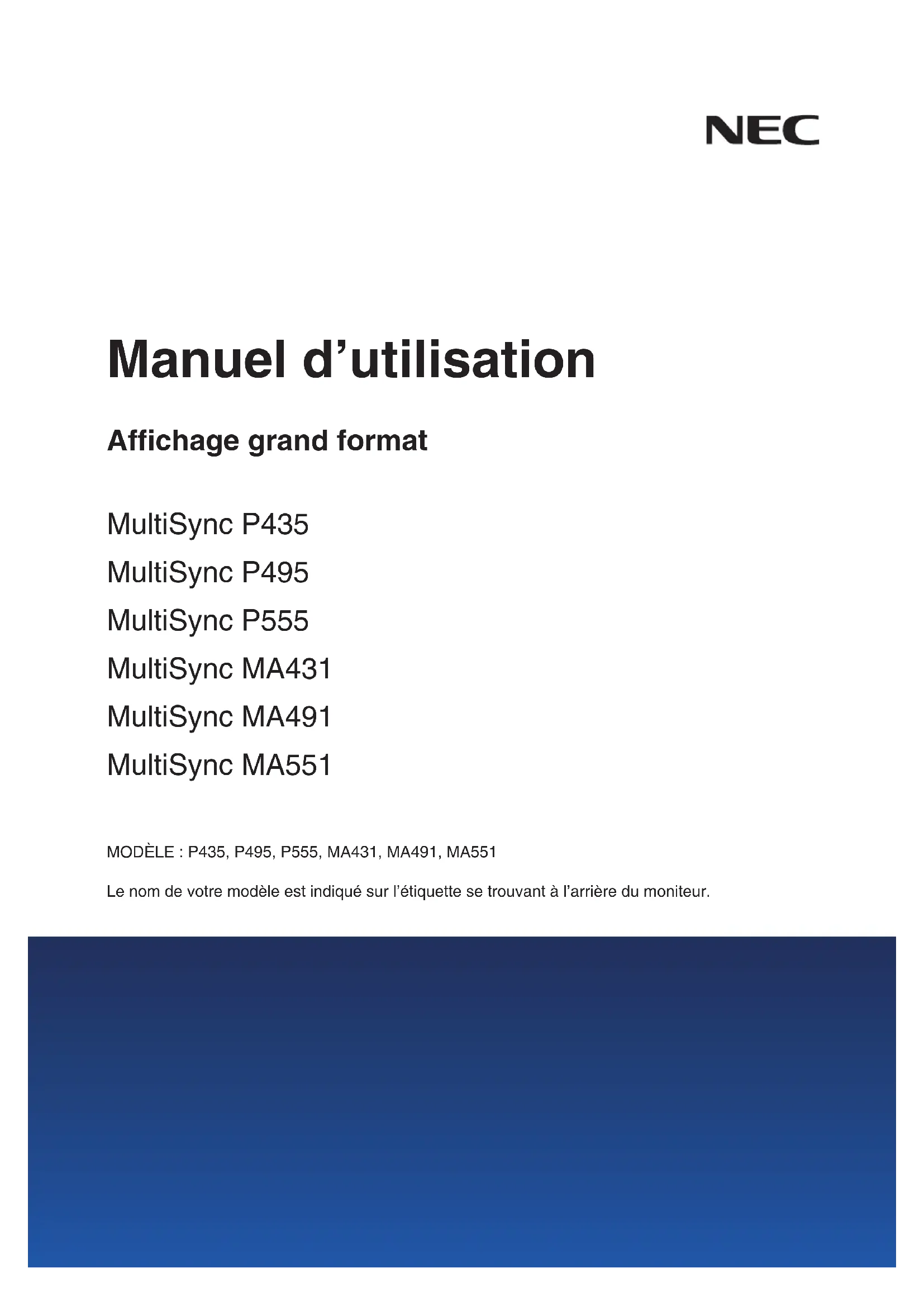 - Manuel d’utilisation Affichage grand format MultiSync P435 MultiSync P495 MultiSync P555 MultiSync MA431 MultiSync MA491 MultiSync MA551 MODÈLE : P435, P495, P555, MA431, MA491, MA551 Le nom de votre modèle est indiqué sur l’étiquette se trouvant à l’arrière du moniteur.Sommaire Informations importantes p. 2