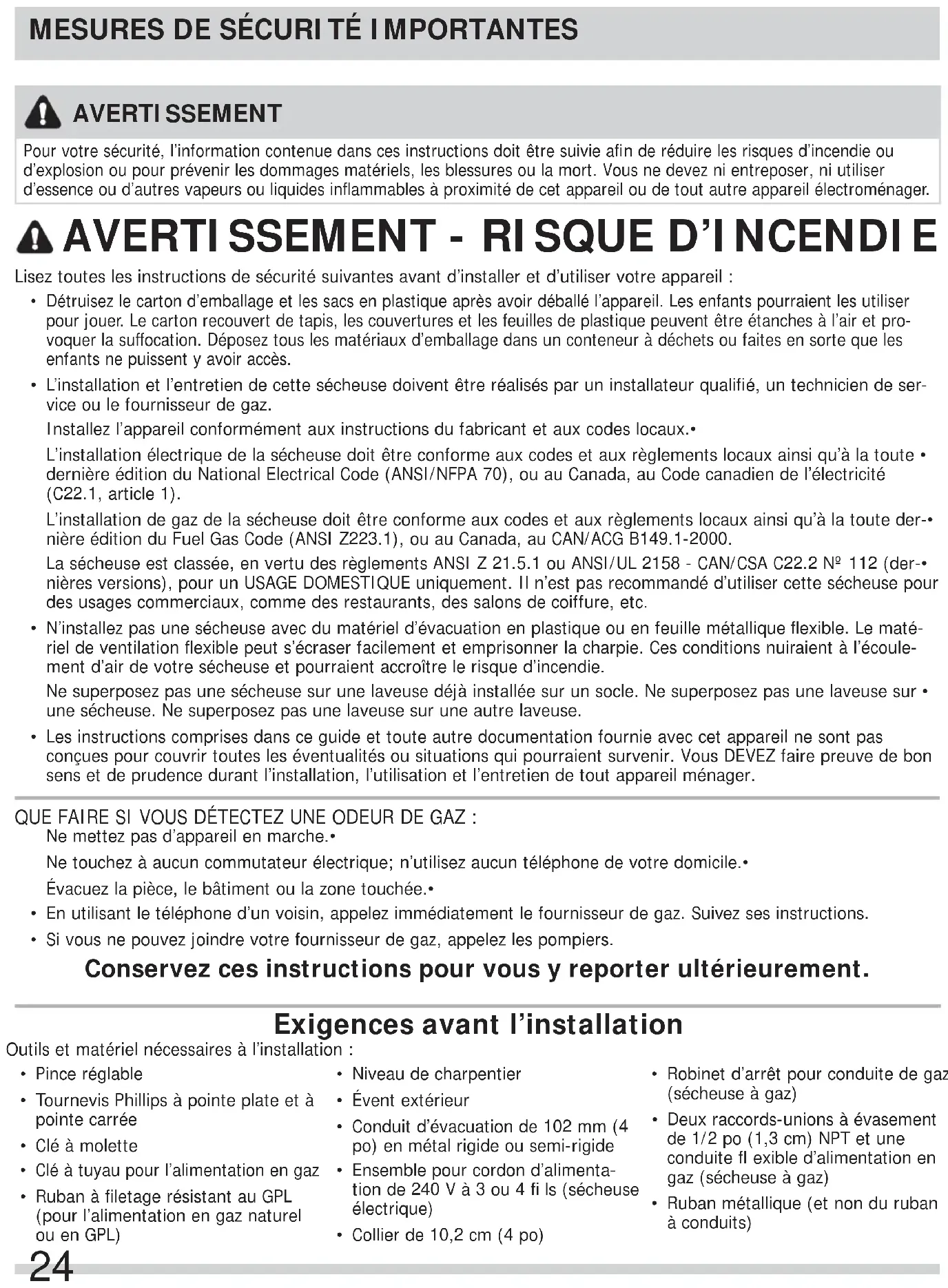 Lisez toutes les instructions de sécurité suivantes avant d’installer et d’utiliser votre appareil : Détruisez le carton d’emballage et les sacs en plastique après avoir déballé l’appareil. Les enfants pourraient les utiliser • pour jouer. Le carton recouvert de tapis, les couvertures et les feuilles de plastique peuvent être étanches à l’air et pro- voquer la suffocation. Déposez tous les matériaux d’emballage dans un conteneur à déchets ou faites en sorte que les enfants ne puissent y avoir accès. L’installation et l’entretien de cette sécheuse doivent être réalisés par un installateur qualifi é, un technicien de ser-• vice ou le fournisseur de gaz.Installez l’appareil conformément aux instructions du fabricant et aux codes locaux.• L’installation électrique de la sécheuse doit être conforme aux codes et aux règlements locaux ainsi qu’à la toute • dernière édition du National Electrical Code (ANSI/NFPA 70), ou au Canada, au Code canadien de l’électricité (C22.1, article 1).L’installation de gaz de la sécheuse doit être conforme aux codes et aux règlements locaux ainsi qu’à la toute der-• nière édition du Fuel Gas Code (ANSI Z223.1), ou au Canada, au CAN/ACG B149.1-2000.La sécheuse est classée, en vertu des règlements ANSI Z 21.5.1 ou ANSI/UL 2158 - CAN/CSA C22.2 Nº 112 (der-• nières versions), pour un USAGE DOMESTIQUE uniquement. Il n’est pas recommandé d’utiliser cette sécheuse pour des usages commerciaux, comme des restaurants, des salons de coiffure, etc. N’installez pas une sécheuse avec du matériel d’évacuation en plastique ou en feuille métallique fl exible. Le maté-• riel de ventilation fl exible peut s’écraser facilement et emprisonner la charpie. Ces conditions nuiraient à l’écoule- ment d’air de votre sécheuse et pourraient accroître le risque d’incendie.Ne superposez pas une sécheuse sur une laveuse déjà installée sur un socle. Ne superposez pas une laveuse sur • une sécheuse. Ne superposez pas une laveuse sur une autre laveuse. Les instructions comprises dans ce guide et toute autre documentation fournie avec cet appareil ne sont pas • conçues pour couvrir toutes les éventualités ou situations qui pourraient survenir. Vous DEVEZ faire preuve de bon sens et de prudence durant l’installation, l’utilisation et l’entretien de tout appareil ménager. QUE FAIRE SI VOUS DÉTECTEZ UNE ODEUR DE GAZ : Ne mettez pas d’appareil en marche.• Ne touchez à aucun commutateur électrique; n’utilisez aucun téléphone de votre domicile.• Évacuez la pièce, le bâtiment ou la zone touchée.• En utilisant le téléphone d’un voisin, appelez immédiatement le fournisseur de gaz. Suivez ses instructions.• Si vous ne pouvez joindre votre fournisseur de gaz, appelez les pompiers.• Exigences avant l’installation Outils et matériel nécessaires à l’installation :Pince réglable• Tournevis Phillips à pointe plate et à • pointe carréeClé à molette• Clé à tuyau pour l’alimentation en gaz• Ruban à fi letage résistant au GPL • (pour l’alimentation en gaz naturel ou en GPL)Niveau de charpentier• Évent extérieur• Conduit d’évacuation de 102 mm (4 • po) en métal rigide ou semi-rigideEnsemble pour cordon d’alimenta-• tion de 240 V à 3 ou 4 fi ls (sécheuse électrique)Collier de 10,2 cm (4 po)• Robinet d’arrêt pour conduite de gaz • (sécheuse à gaz)Deux raccords-unions à évasement • de 1/2 po (1,3 cm) NPT et une conduite fl exible d’alimentation en gaz (sécheuse à gaz)Ruban métallique (et non du ruban • à conduits) Conservez ces instructions pour vous y reporter ultérieurement. AVERTISSEMENT Pour votre sécurité, l’information contenue dans ces instructions doit être suivie afi n de réduire les risques d’incendie ou d’explosion ou pour prévenir les dommages matériels, les blessures ou la mort. Vous ne devez ni entreposer, ni utiliser d’essence ou d’autres vapeurs ou liquides infl ammables à proximité de cet appareil ou de tout autre appareil électroménager.