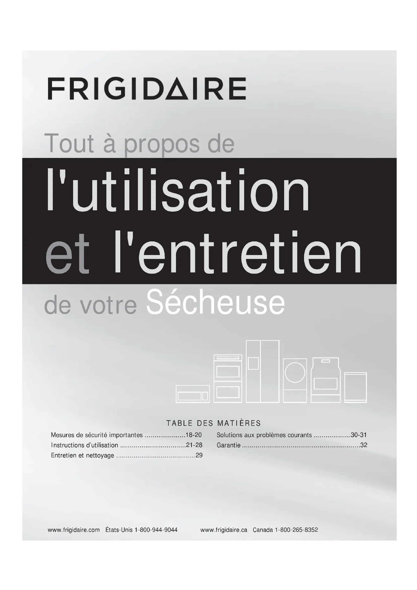 - www.frigidaire.com États-Unis 1-800-944-9044 www.frigidaire.ca Canada 1-800-265-8352 Tout à propos de l'utilisation et l'entretien de votre Sécheuse Mesures de sécurité importantes p. 18