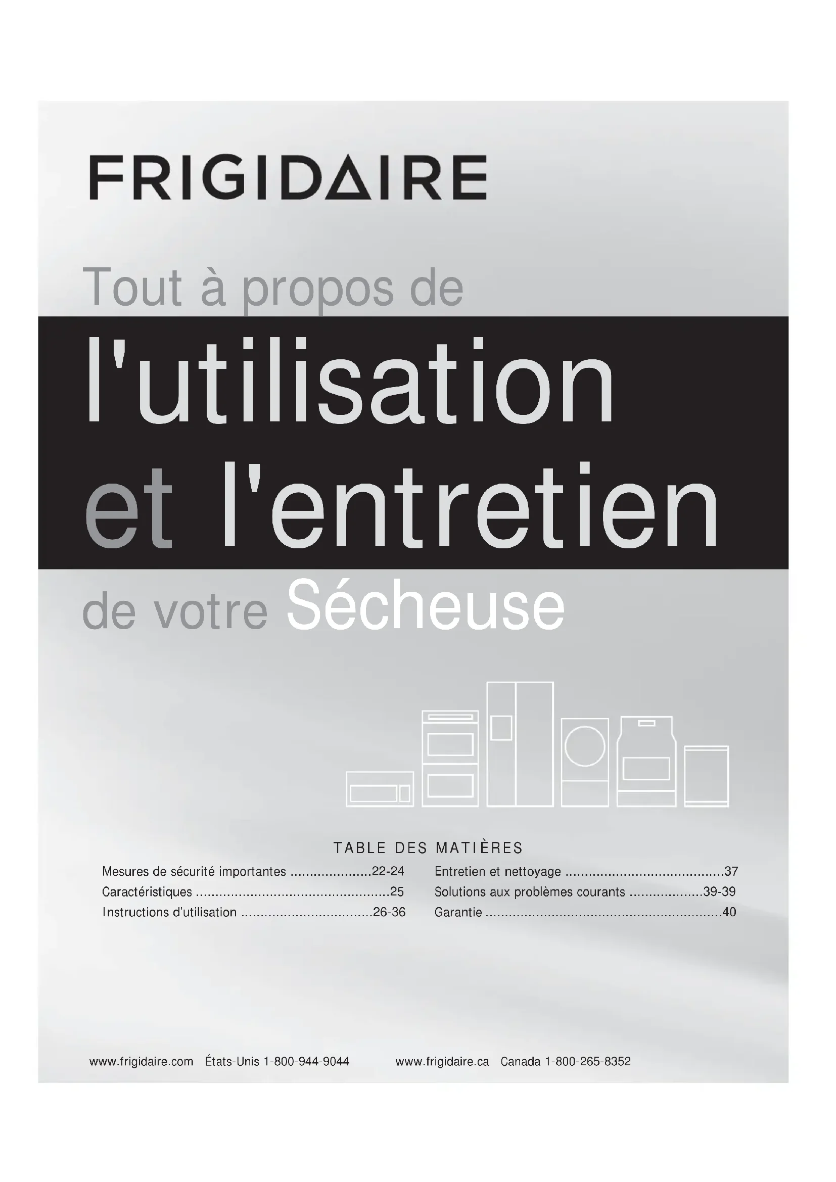 - www.frigidaire.com États-Unis 1-800-944-9044 www.frigidaire.ca Canada 1-800-265-8352 Tout à propos de l'utilisation et l'entretien de votre Sécheuse Mesures de sécurité importantes p. 22