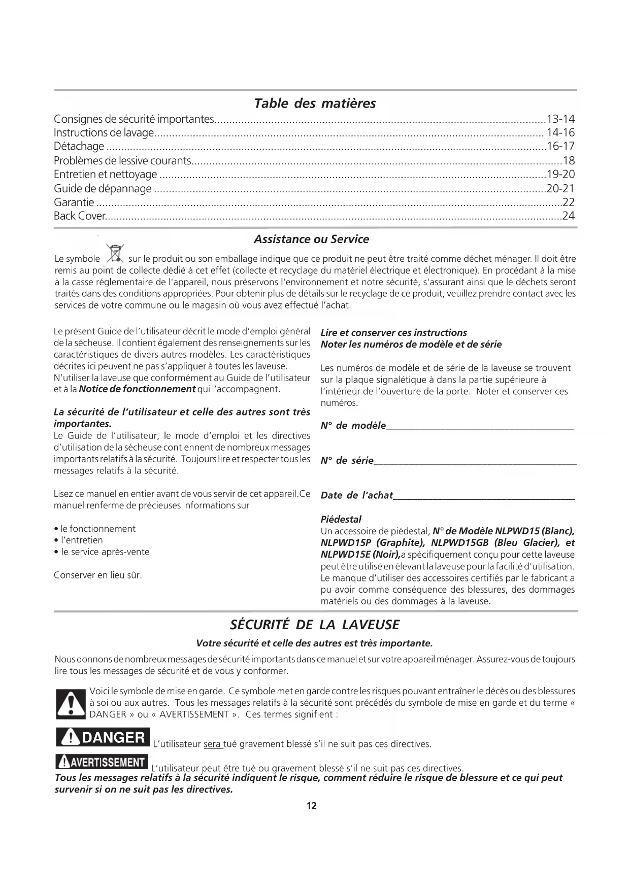 Votre sécurité et celle des autres est très importante. Nous donnons de nombreux messages de sécurité importants dans ce manuel et sur votre appareil ménager. Assurez-vous de toujours lire tous les messages de sécurité et de vous y conformer. Voici le symbole de mise en garde. Ce symbole met en garde contre les risques pouvant entraîner le décès ou des blessures à soi ou aux autres. Tous les messages relatifs à la sécurité sont précédés du symbole de mise en garde et du terme « DANGER » ou « AVERTISSEMENT ». Ces termes signifient : DANGER L’utilisateur sera tué gravement blessé s’il ne suit pas ces directives. L’utilisateur peut être tué ou gravement blessé s’il ne suit pas ces directives. Tous les messages relatifs à la sécurité indiquent le risque, comment réduire le risque de blessure et ce qui peut survenir si on ne suit pas les directives. Piédestal Un accessoire de piédestal, N° de Modèle NLPWD15 (Blanc), NLPWD15P (Graphite), NLPWD15GB (Bleu Glacier), et NLPWD15E (Noir),a spécifiquement conçu pour cette laveuse peut être utilisé en élevant la laveuse pour la facilité d’utilisation. Le manque d’utiliser des accessoires certifiés par le fabricant a pu avoir comme conséquence des blessures, des dommages matériels ou des dommages à la laveuse. Le présent Guide de l’utilisateur décrit le mode d’emploi général de la sécheuse. Il contient également des renseignements sur les caractéristiques de divers autres modèles. Les caractéristiques décrites ici peuvent ne pas s’appliquer à toutes les laveuse. N’utiliser la laveuse que conformément au Guide de l’utilisateur et à la Notice de fonctionnement qui l’accompagnent. La sécurité de l’utilisateur et celle des autres sont très importantes. Le Guide de l’utilisateur, le mode d’emploi et les directives d’utilisation de la sécheuse contiennent de nombreux messages importants relatifs à la sécurité. Toujours lire et respecter tous les messages relatifs à la sécurité. Lisez ce manuel en entier avant de vous servir de cet appareil.Ce manuel renferme de précieuses informations sur