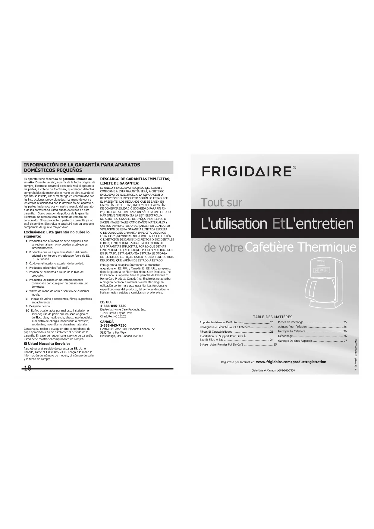 1 Rincez dans une solution savonneuse chaude : le panier deltre,leltredorépermanent,lesupportdultreà eau ainsi que la carafe. Rincez à l’eau claire et essuyez. N’utilisez pas d’agents nettoyants abrasifs ou de laines d’acier. N’immergez pas la cafetière dans l’eau ou tout autre liquide; cela pourrait endommager la cafetière de façon permanente. 2 Soulevez le couvercle du réservoir, sur le dessus de la cafetière, et versez-y la quantité d’eau fraîche désirée. Assurez-vous de verser l’eau dans le réservoir et non danslepanierdultre. 3Lepanierdultreenplace,insérezleltredoré permanentouuncornet-ltreenpapiern°4dansle panierdultre–maisnonpaslesdeuxàlafois! 4Ajoutezlaquantitédecafémouludésiréedansleltre. Il est recommandé d’utiliser une cuillerée à soupe de café moulu pour chaque tasse d’eau que contient le réservoir. Par contre, vous pouvez ajuster la quantité de café et d’eau selon vos goûts personnels. 5AppuyezsurleboutonMarche/Arrêtpourcommencer le processus d’infusion. Avant d’appuyer sur le boutonMarche/Arrêt,vouspourriezvouloirréglerla force du café à infuser en appuyant sur le bouton Force café, sur la surface de commande. Les choix passent de Régulier à Fort. 6 Une fois le cycle d’infusion terminé, 3 timbres sonores se feront entendre. Pour commander des pièces de rechange aux États-Unis et le Mexique, visitez notre site Web à www.frigidaire.com/professional Pour commander des pièces de rechange au Canada, visitez notre site Web à www.frigidaire.ca Ou appelez-nous au 1-888-845-7330 Heures Du lundi au vendredi, de 9 heures-8 h 30 HNE, le samedi et le dimanche, 11 heures-19h30 HNE. (S’ilvousplaîtappelerlemêmenuméropourobtenirdes réponses à des problèmes ou des questions.) Pour prix, voir notre site web www.frigidaire.com/ professional ou appelez 1-888-845-7330 Frigidaire Accessories / Accesorios de Frigidaire / Accessoires de FrigidairePart No.Nº De Parte / Nº De Piéce16158162211615916164FPDC06WFMW16181-1Thermal CarafeTérmico CafeteraThermal Carafe LidTapa Térmico CafeteraFilter Basket HolderGoldtone Coffee FilterFiltro Dorado Para CafeteraWater Filter Holder6 - Pack Coffee Water FiltersFiltro de agua, paquete de 6Replacement Rubber Feet (4-Pack)Pies de Goma de Reemplazo (Conjunto de 4)Thermo VerseuseCouvercle de la Carafe ThermiquePorte-Panier FiltreFiltre à Café DoréPorte-Filtre à EauPaquet De 6 Filtres à EauPieds en Caoutchouc de Remplacement (Paquet de 4)1622026 ASTUCES POUR L’INFUSION, LE NETTOYAGE, DÉPANNAGE Utilisez le bouton Force café pour faire votre choix de Régulier à Fort, selon vos goûts. Utilisez Des Grains De Café Frais Nous vous recommandons de broyer votre café avant chaque infusion et d’utiliser les grains de café les plusfraisquisoient.Lesgrainsdecafédoiventêtre conservés dans un contenant hermétique et rangés dans un endroit frais. Ne pas réfrigérer les grains de café; de la condensation se formera sur les grains lorsquevouslesretirerezduréfrigérateur.Mêmesila congélation aide à conserver les grains de café, cela pourrait altérer la saveur. Broyer Votre Café Mêmesilecaféprémouluestparfaitementacceptable, le café est meilleur lorsqu’il est infusé à partir de grains de café fraîchement moulus. Nous vous recommandons de broyer vos grains de café juste avant l’infusion et de réglervotrebroyeurand’obtenirdesgrainsmoyens. Les grains moyens constituent le réglage optimal pour la majorité des cafetières automatiques goutte à goutte. Quelle Quantité De Café Utilisée Pour Chaque Pot Selon la force de café désirée, un rapport d’une cuillerée à soupe par tasse est recommandée. Vous pouvez ajuster cette quantité selon vos goûts person- nels, mais si vous préférez un café plus faible, l’infusion doitdeforcerégulièrepourensuiteêtrediluéeavecde l’eau chaude; cela maximisera la saveur et minimisera le goût amer. Infuser Avec Une Eau De Qualité Pour obtenir un café de qualité, il est essentiel d’infuser avec une eau de qualité. Dans certains cas, l’eau du robinetpeutêtredefaiblequalité,cequipeutaltérer la saveur du café. Si l’eau de votre robinet est de faible qualité, vous pourriez vouloir infuser votre café en util- isant de l’eau embouteillée ou de l’eau provenant d’un appareildeltrationd’osmose.Parcontre,n’utilisezpas d’eau distillée ou minérale, car cela pourrait endom- mager votre cafetière. Conserver Votre Cafetière Propre Pour toujours obtenir un café savoureux de qualité, il est important que votre carafe et votre panier soient toujours propres. Lavez chacun d’eux après chaque utilisation. Il se pourrait qu’il soit occasionnellement nécessaire de nettoyer le système complet à l’aide d’une solution à base de vinaigre et d’eau (se reporter aux instructions de Nettoyage automatique à la page 6). Selon l’utilisation, il pourrait êtrenécessaired’utilisercetteméthodedenettoyage une ou deux fois par mois. Nettoyer La Cafetière 1 Retirezlepanierdeltreetlacarafedela cafetière. 2 Lavezlepanierdeltreetleltredorépermanent dans une eau savonneuse; rincez ensuite à l’eau chaude. N’utilisez pas d’agents nettoyants abrasifs oudelainesd’acier.Cesarticlespeuventaussiêtre lavés dans le panier supérieur du lave-vaisselle. 3 Débranchez la cafetière et essuyez le boîtier à l’aide d’un linge doux ayant été préalablement trempé dans l’eau chaude. Essuyez ensuite avec un linge sec et séchez à l’aide d’un linge doux. N’utilisez pas d’agents nettoyants abrasifs ou de laines d’acier. Pour faire briller et nettoyer la partie extérieure en acier inoxydable, Frigidaire recommande l’utilisation de Ecosential Stainless Steel Cleaner par Smart Choice™. Pour en faire l’achat en ligne, rendez- vous au http://frigidaire.stores.yahoo.net/ ou appelez au numéro sans frais : 1-800-599-7569. Dépannage