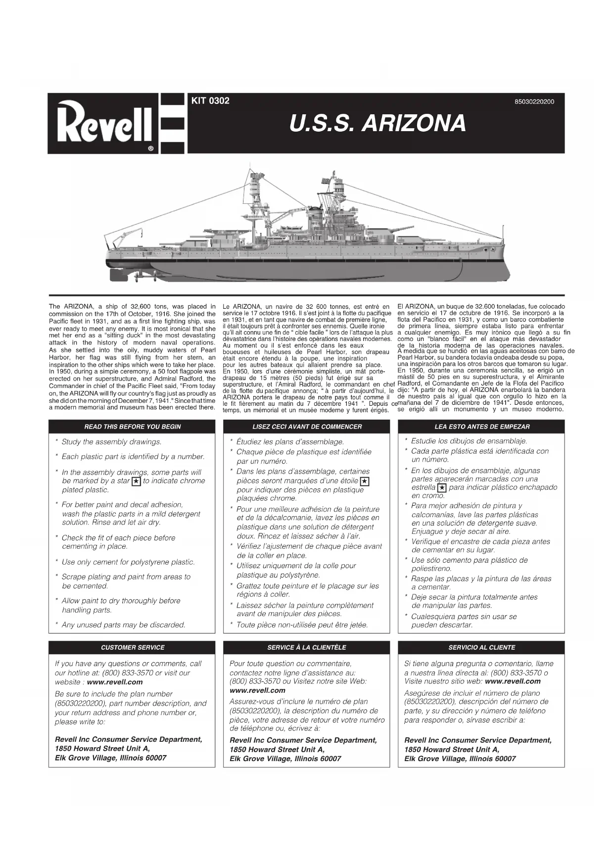 Pour toute question ou commentaire, contactez notre ligne d’assistance au: (800) 833-3570 ou Visitez notre site Web: www.revell.com Assurez-vous d’inclure le numéro de plan (85030220200), la description du numéro de pièce, votre adresse de retour et votre numéro de téléphone ou, écrivez à: Revell Inc Consumer Service Department, 1850 Howard Street Unit A, Elk Grove Village, Illinois 60007