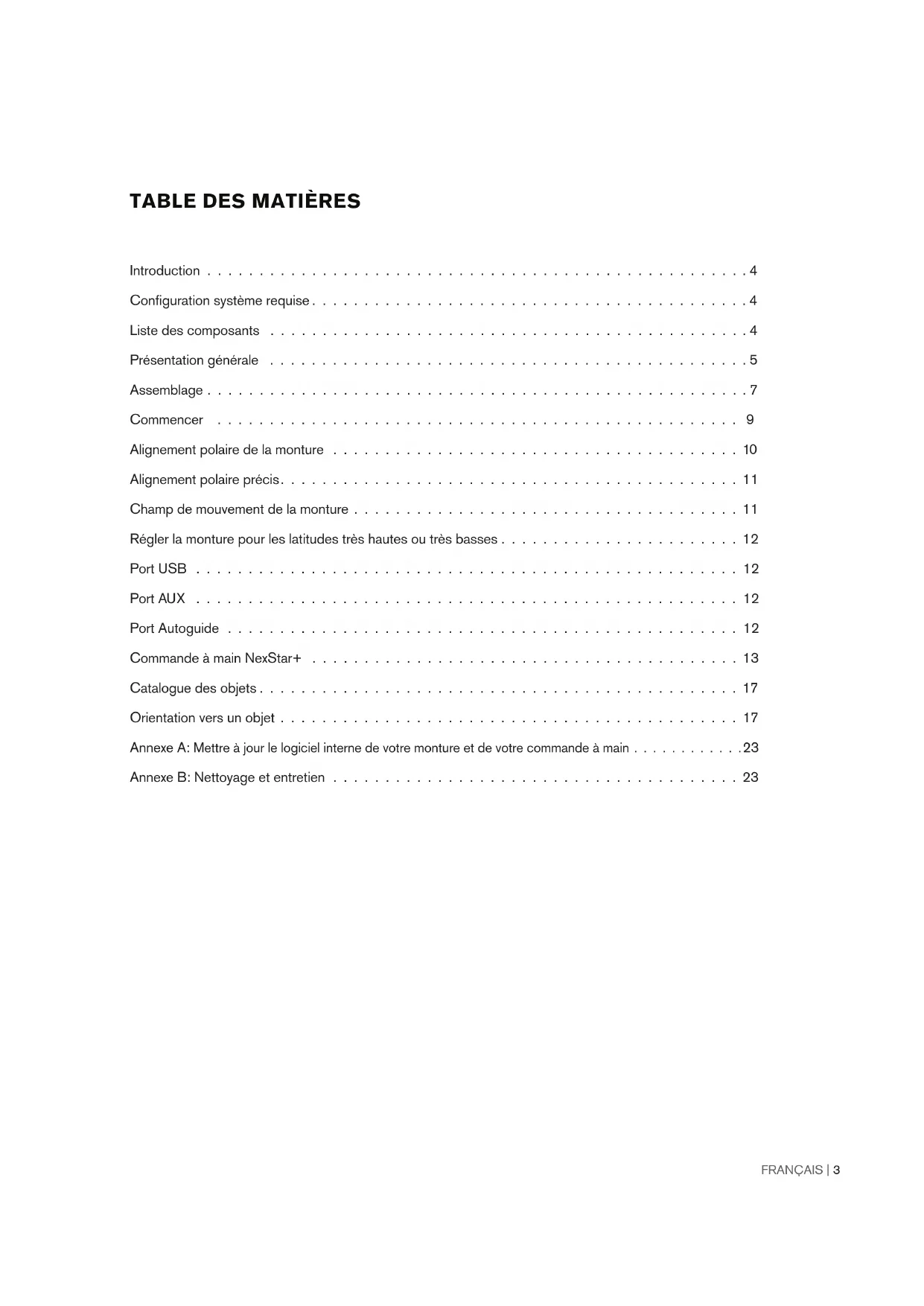 - Annexe A: Mettre à jour le logiciel interne de votre monture et de votre commande à main p. 23