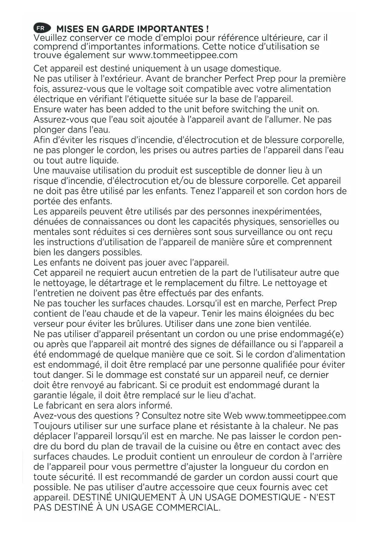 Cet appareil est destiné uniquement à un usage domestique. Ne pas utiliser à l’extérieur. Avant de brancher Perfect Prep pour la première fois, assurez-vous que le voltage soit compatible avec votre alimentation électrique en vérifiant l’étiquette située sur la base de l’appareil. Ensure water has been added to the unit before switching the unit on. Assurez-vous que l’eau soit ajoutée à l’appareil avant de l’allumer. Ne pas plonger dans l’eau. Afin d’éviter les risques d’incendie, d’électrocution et de blessure corporelle, ne pas plonger le cordon, les prises ou autres parties de l’appareil dans l’eau ou tout autre liquide. Une mauvaise utilisation du produit est susceptible de donner lieu à un risque d’incendie, d’électrocution et/ou de blessure corporelle. Cet appareil ne doit pas être utilisé par les enfants. Tenez l’appareil et son cordon hors de portée des enfants. Les appareils peuvent être utilisés par des personnes inexpérimentées, dénuées de connaissances ou dont les capacités physiques, sensorielles ou mentales sont réduites si ces dernières sont sous surveillance ou ont reçu les instructions d’utilisation de l’appareil de manière sûre et comprennent bien les dangers possibles. Les enfants ne doivent pas jouer avec l’appareil. Cet appareil ne requiert aucun entretien de la part de l’utilisateur autre que le nettoyage, le détartrage et le remplacement du filtre. Le nettoyage et l’entretien ne doivent pas être eectués par des enfants. Ne pas toucher les surfaces chaudes. Lorsqu’il est en marche, Perfect Prep contient de l’eau chaude et de la vapeur. Tenir les mains éloignées du bec verseur pour éviter les brûlures. Utiliser dans une zone bien ventilée. Ne pas utiliser d’appareil présentant un cordon ou une prise endommagé(e) ou après que l’appareil ait montré des signes de défaillance ou si l’appareil a été endommagé de quelque manière que ce soit. Si le cordon d’alimentation est endommagé, il doit être remplacé par une personne qualifiée pour éviter tout danger. Si le dommage est constaté sur un appareil neuf, ce dernier doit être renvoyé au fabricant. Si ce produit est endommagé durant la garantie légale, il doit être remplacé sur le lieu d’achat. Le fabricant en sera alors informé. Avez-vous des questions ? Consultez notre site Web www.tommeetippee.com Toujours utiliser sur une surface plane et résistante à la chaleur. Ne pas déplacer l’appareil lorsqu’il est en marche. Ne pas laisser le cordon pen- dre du bord du plan de travail de la cuisine ou être en contact avec des surfaces chaudes. Le produit contient un enrouleur de cordon à l’arrière de l’appareil pour vous permettre d’ajuster la longueur du cordon en toute sécurité. Il est recommandé de garder un cordon aussi court que possible. Ne pas utiliser d’autre accessoire que ceux fournis avec cet appareil. DESTINÉ UNIQUEMENT À UN USAGE DOMESTIQUE - N’EST PAS DESTINÉ À UN USAGE COMMERCIAL.MODE D’EMPLOI INSTALLATION: