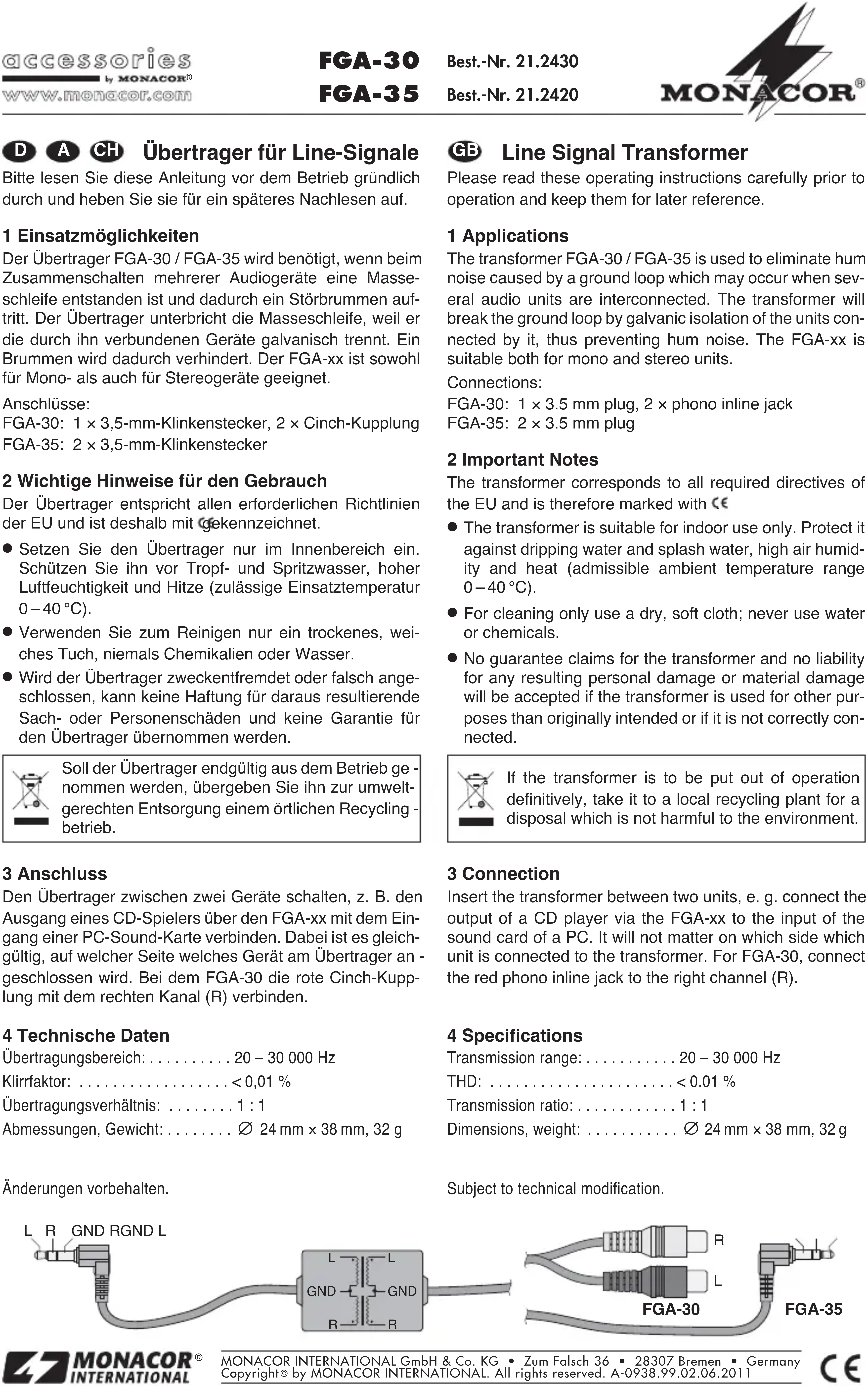 FGA35 - Transformateur audio Monacor - Notice d'utilisation et mode d'emploi gratuit