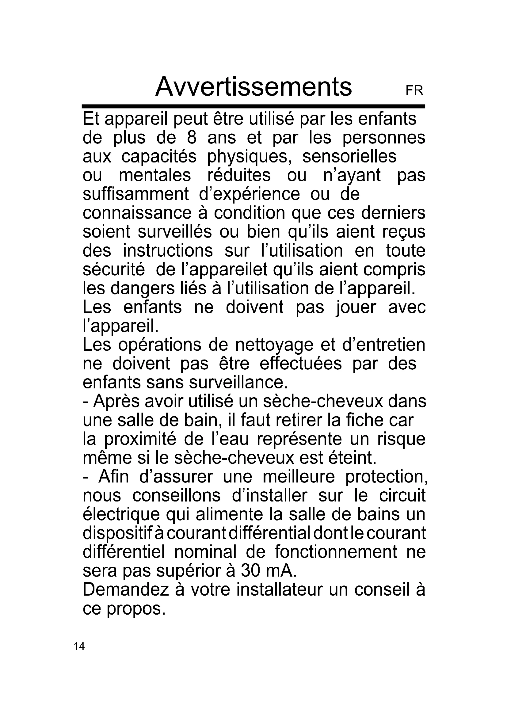 USER INFORMATION DISPOSAL 13FR Avvertissements Et appareil peut être utilisé par les enfants de plus de 8 ans et par les personnes aux capacités physiques, sensorielles ou mentales réduites ou n’ayant pas sufsamment d’expérience ou de connaissance à condition que ces derniers soient surveillés ou bien qu’ils aient reçus des instructions sur l’utilisation en toute sécurité de l’appareilet qu’ils aient compris les dangers liés à l’utilisation de l’appareil. Les enfants ne doivent pas jouer avec l’appareil. Les opérations de nettoyage et d’entretien ne doivent pas être effectuées par des enfants sans surveillance. - Après avoir utilisé un sèche-cheveux dans une salle de bain, il faut retirer la che car la proximité de l’eau représente un risque même si le sèche-cheveux est éteint. - An d’assurer une meilleure protection, nous conseillons d’installer sur le circuit électrique qui alimente la salle de bains un dispositif à courant différential dont le courant différentiel nominal de fonctionnement ne sera pas supérior à 30 mA. Demandez à votre installateur un conseil à ce propos. 14Ne pas utiliser dans le baignoire et dans le douche. ATTENTION: Ne pas utiliser l’appareil voisin à baignoire, douche, évier ou récipients avec de l’eau. Si le câble d’alimentation devait être endommagé, il faut le remplacer uniquement auprès des centres d’assistance autorisés par le constructeur, an de prévenir chaque risque.
