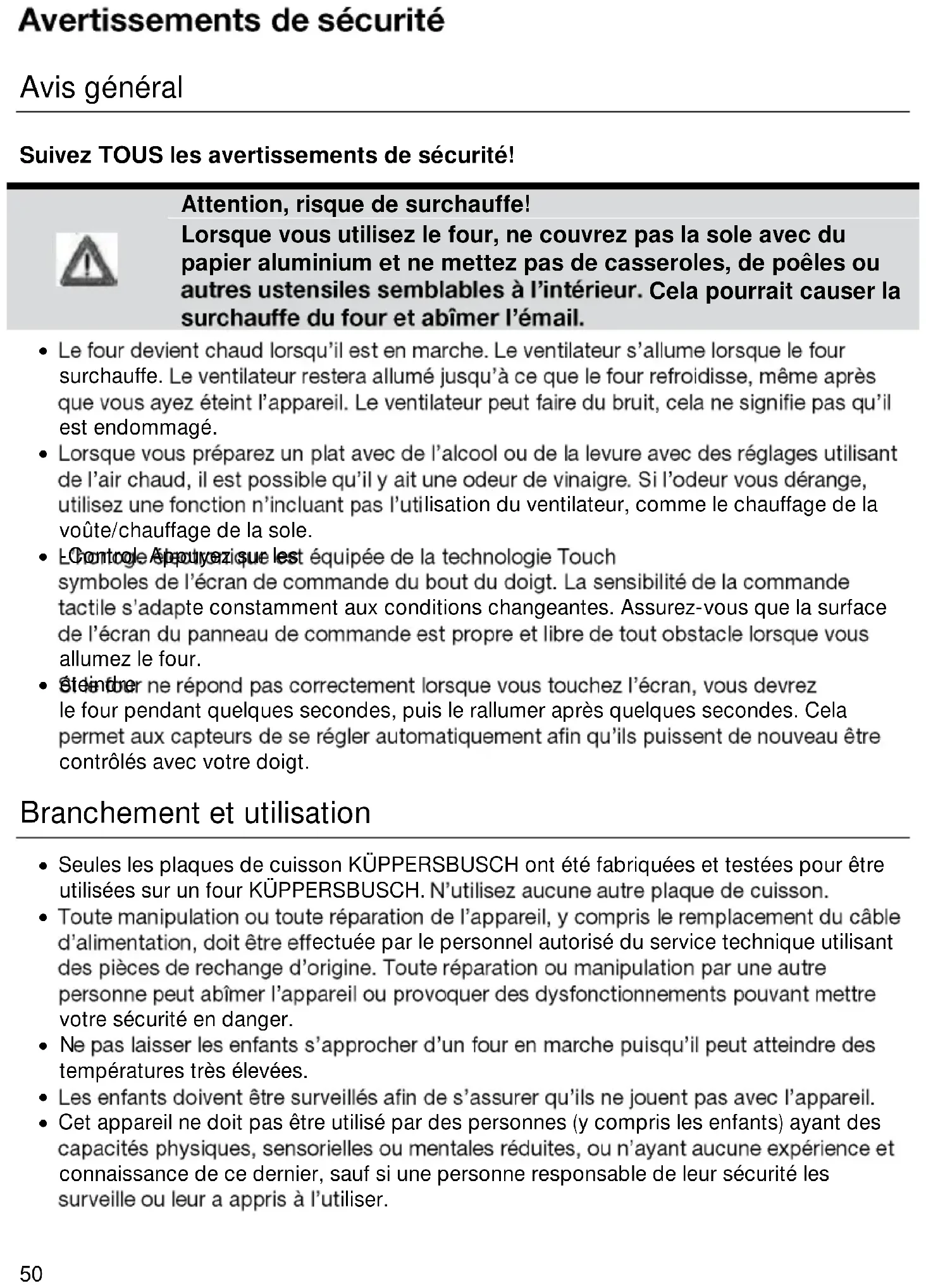 lisation du ventilateur, comme le chauffage de la voûte/chauffage de la sole. -Control. Appuyez sur les te constamment aux conditions changeantes. Assurez-vous que la surface allumez le four. éteindre le four pendant quelques secondes, puis le rallumer après quelques secondes. Cela contrôlés avec votre doigt. Branchement et utilisation Seules les plaques de cuisson KÜPPERSBUSCH ont été fabriquées et testées pour être utilisées sur un four KÜPPERSBUSCH.