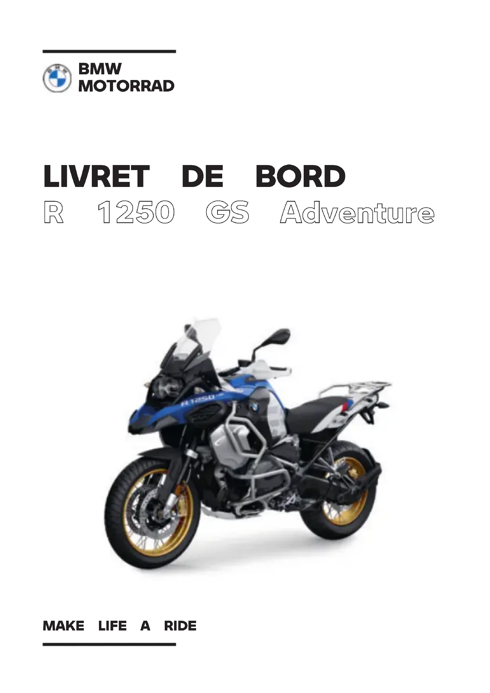 R 1250 GS Adventure BMW MOTORRAD MAKE LIFE A RIDEDonnées de la moto Modèle Numéro d'identification du véhicule Code couleur Première immatriculation N° d'immatriculation Données du concessionnaire Interlocuteur au service après-vente Madame/Monsieur N° de téléphone Adresse du concessionnaire/Téléphone (cachet de la société)VOTRE BMW. Nous vous félicitons d'avoir porté votre choix sur un véhicule de BMW Motorrad et avons le plaisir de vous accueillir dans le cercle des pilotes BMW. Familiarisez-vous avec votre nouveau véhicule afin d'être en mesure de vous déplacer en toute sécurité sur les routes. À propos de ce livret de bord Lisez le livret de bord avant de démarrer votre nouvelle BMW. Vous y trouverez des indications importantes concernant l'utilisa- tion du véhicule qui vous permettront de profiter pleinement des avantages techniques de votre BMW. Vous y trouverez également des informations sur l'entretien et la maintenance de façon à assurer la sécurité de fonctionnement, la sécurité routière et une conservation optimale de la valeur de votre véhicule. Si vous étiez amené à vendre un jour votre BMW, pensez à re- mettre le livret de bord. Il fait partie intégrante de la moto. Nous espérons que votre BMW vous donnera entière satisfaction et vous souhaitons bonne route BMW Motorrad.01