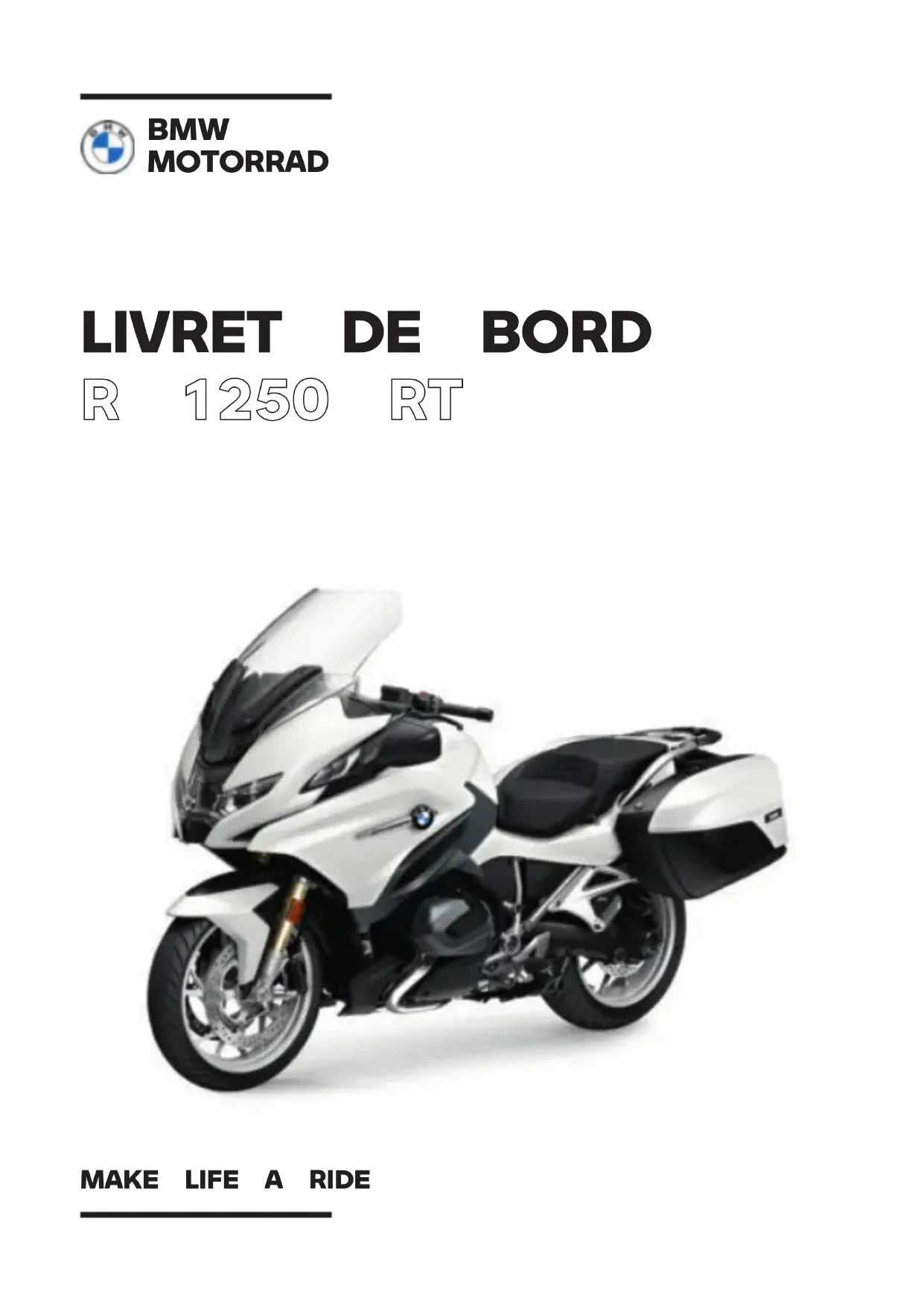 R 1250 RT BMW MOTORRAD MAKE LIFE A RIDEDonnées de la moto Modèle Numéro d'identification du véhicule Code couleur Première immatriculation N° d'immatriculation Données du concessionnaire Interlocuteur au service après-vente Madame/Monsieur N° de téléphone Adresse du concessionnaire/Téléphone (cachet de la société)VOTRE BMW. Nous vous félicitons d'avoir porté votre choix sur un véhicule de BMW Motorrad et avons le plaisir de vous accueillir dans le cercle des pilotes BMW. Familiarisez-vous avec votre nouveau véhicule afin d'être en mesure de vous déplacer en toute sécurité sur les routes. À propos de ce livret de bord Lisez le livret de bord avant de démarrer votre nouvelle BMW. Vous y trouverez des indications importantes concernant l'utilisa- tion du véhicule qui vous permettront de profiter pleinement des avantages techniques de votre BMW. Vous y trouverez également des informations sur l'entretien et la maintenance de façon à assurer la sécurité de fonctionnement, la sécurité routière et une conservation optimale de la valeur de votre véhicule. Si vous étiez amené à vendre un jour votre BMW, pensez à re- mettre le livret de bord. Il fait partie intégrante de la moto. Nous espérons que votre BMW vous donnera entière satisfaction et vous souhaitons bonne route BMW Motorrad.01