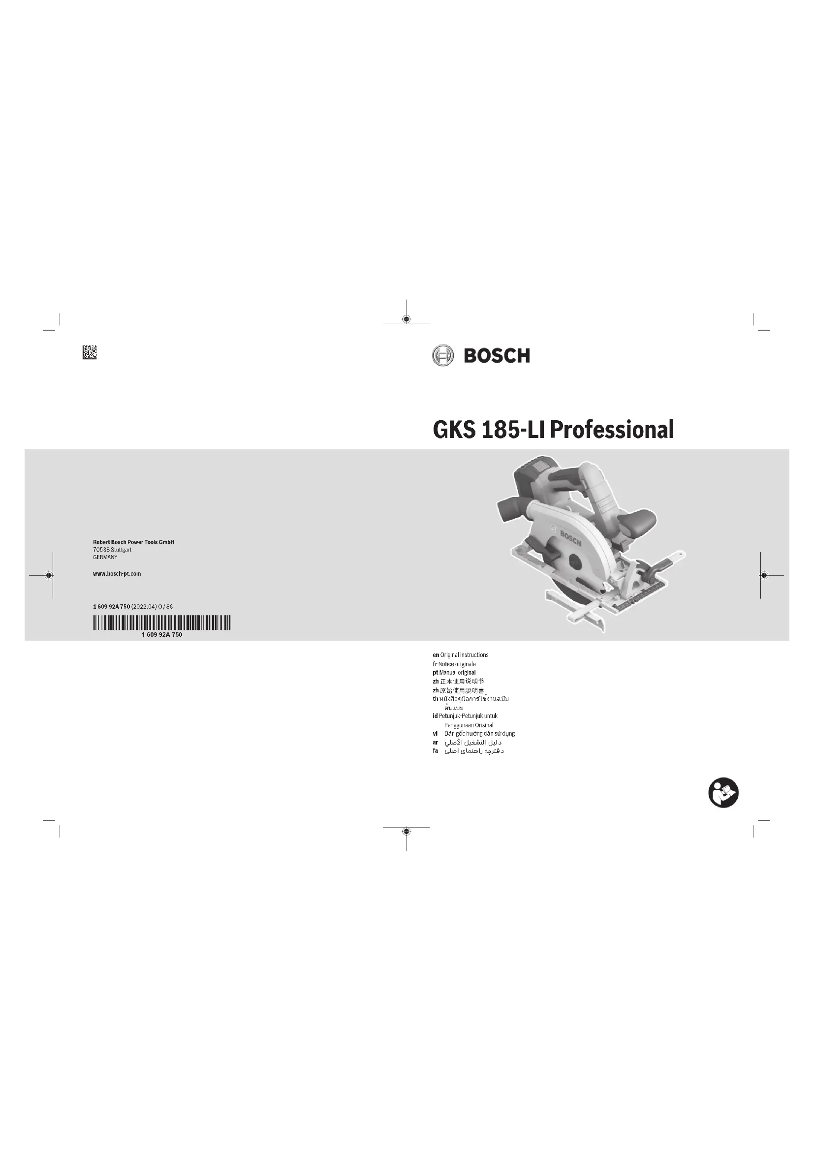 The cut mark (12) indicates the position of the saw blade when making a right-angled cut. For a precise cut, place the circular saw against the work- piece as shown in the figure. We recommend making a test cut. Start-up Switching on/off u Make sure that you are able to press the On/Off switch without releasing the handle. To start the power tool, first press the lock-off switch (2), then press and hold the on/off switch (1). To switch off the power tool, release the on/off switch (1). Note: For safety reasons, the on/off switch (1) cannot be locked; it must remain pressed during the entire operation. Switching on the LED worklight The lamp (10) lights up when the on/off switch (1) is lightly or fully pressed, meaning that the work area is illuminated in poor lighting conditions. Run-out brake An integrated run-out brake shortens the time the saw blade keeps running for after the power tool has been switched off. Protection Against Deep Discharging The lithium-ion battery is protected against deep discharge by the Electronic Cell Protection (ECP). When the battery is discharged, the power tool is switched off by means of a pro- tective circuit: The application tool no longer rotates. Practical advice u Remove the battery from the power tool before carry- ing out work on the power tool (e.g. maintenance, changing tool, etc.). The battery should also be re- 1 609 92A 750 | (29.04.2022) Bosch Power ToolsEnglish | 11 moved for transport and storage. There is risk of injury from unintentionally pressing the on/off switch. The width of cut varies depending on the saw blade used. Protect saw blades against shock and impact. Guide the power tool evenly, pushing it gently in the cutting direction. Applying too much pressure to the power tool when moving it in the cutting direction significantly reduces the service life of the application tools and can damage the power tool. The sawing performance and the quality of the cut essen- tially depend on the condition and the tooth shape of the saw blade. This is why you should only use sharp saw blades that are suitable for the material being machined. Sawing wood Choosing the right saw blade depends on the wood type, wood quality and whether cuts with or against the grain are required. Making cuts in spruce with the grain produces long, spiral- shaped chips. Beech and oak dust is especially detrimental to health. Therefore, work only with dust extraction. Sawing with the parallel guide (see figure D) The parallel guide (13) allows you to make precise cuts along the edge of a workpiece and cut strips with the same dimensions. Sawing with an auxiliary guide (see figure E) For working on large workpieces or for cutting straight edges, you can securely fasten a board or rail to the work- piece as an auxiliary guide. The circular saw can be guided along the path of this auxiliary guide with the base plate. Utility hook (see figureG) Your power tool is equipped with a utility hook (30) for hanging it to a ladder, for example. Simply fold out the utility hook (30) to the required position. u When the power tool is hanging by the utility hook, en- sure that the saw blade is protected against uninten- ded contact in order to prevent injury. Fold the utility hook (30) in again when you want to begin work with the power tool. Maintenance and Service Maintenance and Cleaning u Remove the battery from the power tool before carry- ing out work on the power tool (e.g. maintenance, changing tool, etc.). The battery should also be re- moved for transport and storage. There is risk of injury from unintentionally pressing the on/off switch. u To ensure safe and efficient operation, always keep the power tool and the ventilation slots clean. The retracting blade guard must always be able to move freely and retract automatically. It is therefore important to keep the area around the retracting blade guard clean at all times. Remove dust and chips with a paintbrush. Non-coated saw blades can be protected against corrosion using a thin layer of acid-free oil. Remove the oil again before sawing as failure to do so will stain the wood. Resin or glue residue on the saw blade has a detrimental ef- fect on the quality of the cut. You should therefore clean saw blades straight after use. After-Sales Service and Application Service Our after-sales service responds to your questions concern- ing maintenance and repair of your product as well as spare parts. You can find explosion drawings and information on spare parts at: www.bosch-pt.com The Bosch product use advice team will be happy to help you with any questions about our products and their accessor- ies. In all correspondence and spare parts orders, please always include the 10‑digit article number given on the nameplate of the product. Malaysia Robert Bosch Sdn. Bhd.(220975-V) PT/SMY No. 8A, Jalan 13/6 46200 Petaling Jaya Selangor Tel.: (03) 79663194 Toll-Free: 1800 880188 Fax: (03) 79583838 E-Mail: kiathoe.chong@my.bosch.com www.bosch-pt.com.my You can find further service addresses at: www.bosch-pt.com/serviceaddresses Transport The recommended lithium-ion batteries are subject to legis- lation on the transport of dangerous goods. The user can transport the batteries by road without further require- ments. When shipping by third parties (e.g.: by air transport or for- warding agency), special requirements on packaging and la- belling must be observed. For preparation of the item being shipped, consulting an expert for hazardous material is re- quired. Dispatch battery packs only when the housing is undam- aged. Tape or mask off open contacts and pack up the bat- tery in such a manner that it cannot move around in the packaging. Please also observe the possibility of more de- tailed national regulations. Disposal Power tools, rechargeable batteries, accessor- ies and packaging should be sorted for environ- mental-friendly recycling. Do not dispose of power tools and batteries/re- chargeable batteries into household waste! 