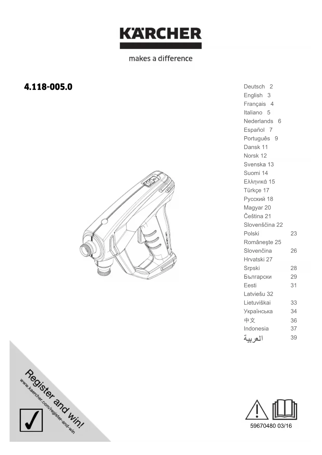 Safety Devices Safety catch Safety lever Start up Operation Locking/releasing the trigger gun Opening/closing the trigger gun 3EN– 1 Avant la première utilisation de votre accessoire, lisez le manuel d'instructions original, agissez en consé- quence et conservez le pour une utilisation ultérieure ou pour le futur propriétaire. DANGER Signale la présence d'un danger imminent entraînant de graves blessures corporelles et pouvant avoir une issue mortelle. 몇 AVERTISSEMENT Signale la présence d'une situation éven- tuellement dangereuse pouvant entraîner de graves blessures corporelles et même avoir une issue mortelle. 1 Cran de sécurité 2 Poignée-pistolet 3 Levier de départ 4 Manette de sécurité A Raccord pour flexible haute pression B Raccord de lance – Lisez impérativement les instructions de service du nettoyeur haute pression utilisé avant la mise en service ! – Avant la première mise en service, vous devez impérativement avoir lu les consignes de sécurité pour les net- toyeur haute pression N° 5.951-949.0 ! – Il est interdit d'effectuer des modifica- tion sur les accessoires. La poignée-pistolet est conçue pour le net- toyage de machines, véhicules, bâtiments, outils, façades, terrasses, équipements de jardin, etc. en lien avec un nettoyeur haute pression et les accessoires Kärcher d’ori- gine avec EASY!Lock (raccord rapide). Les dispositifs de sécurité ont pour but de protéger l'utilisateur. Par conséquent, ils ne doivent en aucun cas être désactivés ou transformés. Le cran de sécurité de la poignée-pistolet empêche toute mise en marche inopinée de l'appareil. La manette de sécurité verrouille la poi- gnée-pistolet à la fermeture et doit être ac- tionnée à chaque ouverture. 몇 AVERTISSEMENT Risque de blessure ! Les accessoires doivent être dans un parfait état. Ne pas utiliser les ac- cessoires si leur état n'est pas irréprochable. DANGER Risque de blessure ! – Lors du fonctionnement, ne pas bloquer la gâchette. – Lors du fonctionnement, ne pas bloquer la manette de sécurité. – Pendant le travail, retenir la poignée pistolet et la lance des deux mains. Sécuriser la poignée-pistolet en cas d’interruption du travail (pauses prolon- gées, changement de buse, etc.) à l’aide du cran de sécurité. Sécuriser la poignée-pistolet : Faire avancer le bouton vers l'avant. Armer la poignée-pistolet : Pousser le cran de sécurité vers l'arrière. Ouvrir le pistolet de pulvérisation à main : Actionner le levier de sécurité et le levier de départ. Fermer le pistolet de pulvérisation à main. Relâcher le levier de sécurité et le levier de départ. Niveaux de danger Éléments de l'appareil Consignes de sécurité Utilisation conforme
