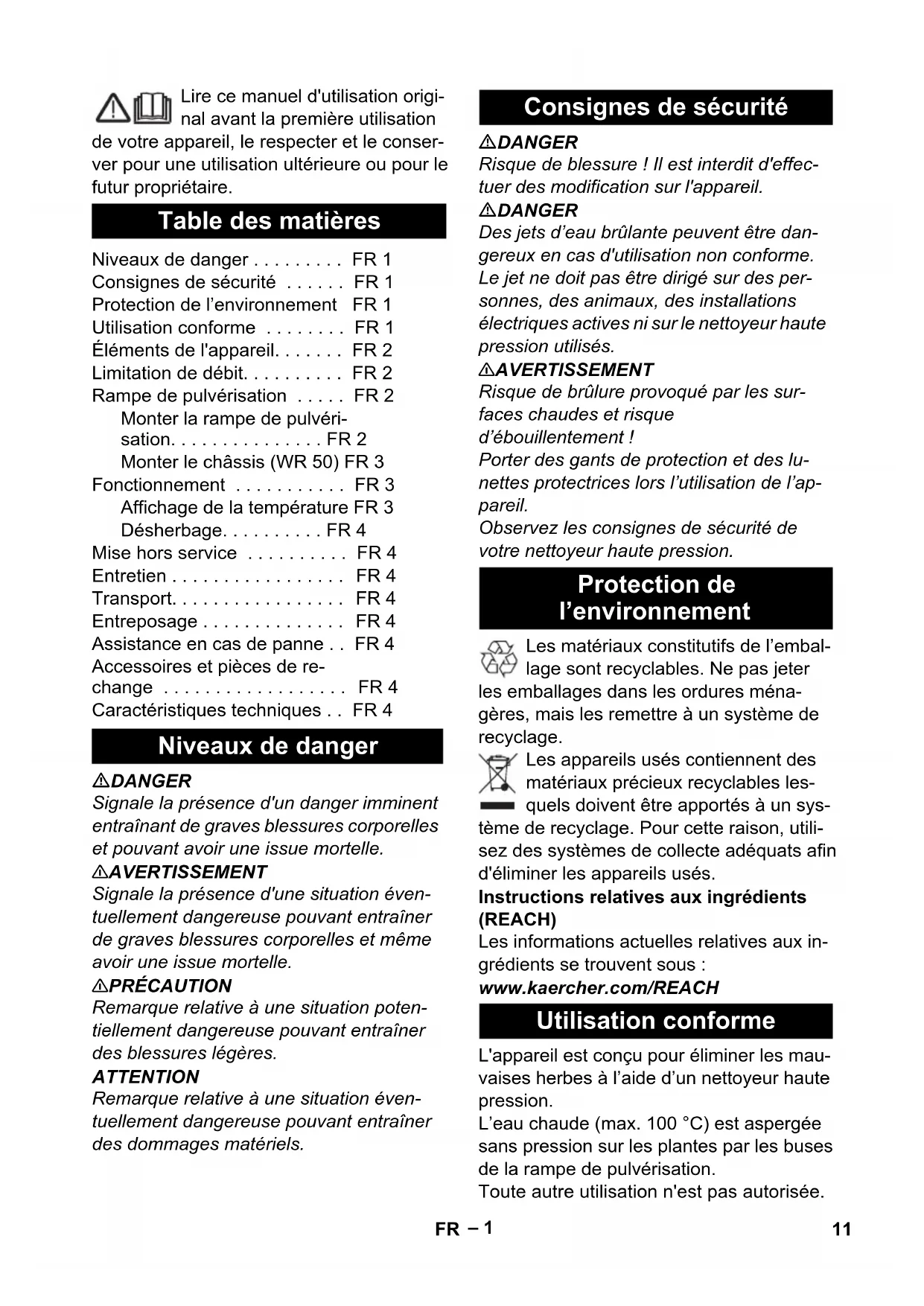 Protect the appliance against frost. remove any dirt, soil and plant residue from the chassis and suspension (WR 50 / WR 100) Regularly check the nozzles on the spray bar for blockages. Mind the weight of the appliance during transport. Consider the weight of the appliance when storing it. Store the appliance in a frost free area. Steam is coming out of the spray bar: Reduce the temperature setting on the high-pressure cleaner. The emerging water pressure is too high: Mount power nozzle in screw connec- tion. Select a suitable power nozzle (see ta- ble). High-pressure cleaner switches off/the high-pressure cleaner burner does not start: Check the nozzles on the spray bar for soiling. Check the nozzles on the spray bar for calcification. The wheels of the chassis and suspen- sion (WR 50 / WR 100) cannot be turned: Check wheel axle and bearings for soil- ing. Only use original accessories and spare parts, they ensure the safe and trouble-free operation of the device. For information about accessories and spare parts, please visit www.kaercher.com. Weed removal Shutting down Care Transport Storage Troubleshooting Accessories and Spare Parts Technical specifications WR 20 WR 50 WR 100 Working width 200mm 500mm 1000mm Input temperature min. 90°C Max. feed temperature 100°C Input amount l/min 5.8 - 8.3 8.3 - 16.7 8.3 - 16.7 Weight (kg) 0.3 2.2 1.2 10 EN– 1 Lire ce manuel d'utilisation origi- nal avant la première utilisation de votre appareil, le respecter et le conser- ver pour une utilisation ultérieure ou pour le futur propriétaire. DANGER Signale la présence d'un danger imminent entraînant de graves blessures corporelles et pouvant avoir une issue mortelle. 몇 AVERTISSEMENT Signale la présence d'une situation éven- tuellement dangereuse pouvant entraîner de graves blessures corporelles et même avoir une issue mortelle. 몇 PRÉCAUTION Remarque relative à une situation poten- tiellement dangereuse pouvant entraîner des blessures légères. ATTENTION Remarque relative à une situation éven- tuellement dangereuse pouvant entraîner des dommages matériels. DANGER Risque de blessure ! Il est interdit d'effec- tuer des modification sur l'appareil. DANGER Des jets d’eau brûlante peuvent être dan- gereux en cas d'utilisation non conforme. Le jet ne doit pas être dirigé sur des per- sonnes, des animaux, des installations électriques actives ni sur le nettoyeur haute pression utilisés. 몇 AVERTISSEMENT Risque de brûlure provoqué par les sur- faces chaudes et risque d’ébouillentement ! Porter des gants de protection et des lu- nettes protectrices lors l’utilisation de l’ap- pareil. Observez les consignes de sécurité de votre nettoyeur haute pression. Les matériaux constitutifs de l’embal- lage sont recyclables. Ne pas jeter les emballages dans les ordures ména- gères, mais les remettre à un système de recyclage. Les appareils usés contiennent des matériaux précieux recyclables les- quels doivent être apportés à un sys- tème de recyclage. Pour cette raison, utili- sez des systèmes de collecte adéquats afin d'éliminer les appareils usés. Instructions relatives aux ingrédients (REACH) Les informations actuelles relatives aux in- grédients se trouvent sous : www.kaercher.com/REACH L'appareil est conçu pour éliminer les mau- vaises herbes à l’aide d’un nettoyeur haute pression. L’eau chaude (max. 100 °C) est aspergée sans pression sur les plantes par les buses de la rampe de pulvérisation. Toute autre utilisation n'est pas autorisée. Table des matières Niveaux de danger ... FR 1 Consignes de sécurité ... FR 1 Protection de l’environnement FR 1 Utilisation conforme ... FR 1 Éléments de l'appareil... FR 2 Limitation de débit... FR 2 Rampe de pulvérisation ... FR 2 Monter la rampe de pulvéri- sation... FR 2 Monter le châssis (WR 50) FR 3 Fonctionnement ... FR 3 Affichage de la température FR 3 Désherbage... FR 4 Mise hors service ... FR 4 Entretien ... FR 4 Transport... FR 4 Entreposage ... FR 4 Assistance en cas de panne ... FR 4 Accessoires et pièces de re- change ... FR 4 Caractéristiques techniques ... FR 4 Niveaux de danger Consignes de sécurité Protection de l’environnement Utilisation conforme 11FR– 2 Pour les illustrations, voir la page de garde 1 Fermeture 2 Vis de la poignée étoile 3 Support de la rampe de pulvérisation 4 Châssis (WR 50) 5 Rampe de pulvérisation 6 Buses de la rampe de pulvérisation 7 Affichage de température Pour garantir une température élevée constante (au-delà de 90°C) de l’eau, il faut insérer une buse « Power » dans le rac- cord à vis de la barre de pulvérisation pour limiter le débit. Remarque La buse « Power » nécessaire est adaptée au nettoyeur haute pression correspondant et doit être commandée séparément. Remarque : Les buses « Power » pour les nettoyeurs haute pression eau chaude non mentionnés ici doivent être demandées au- près du partenaire de service après-vente. Pousser la buse « Power » dans le rac- cord à vis. Insérer un joint d’étanchéité entre la buse « Power » et la lance. Appliquer la colle pour métaux 6.867-