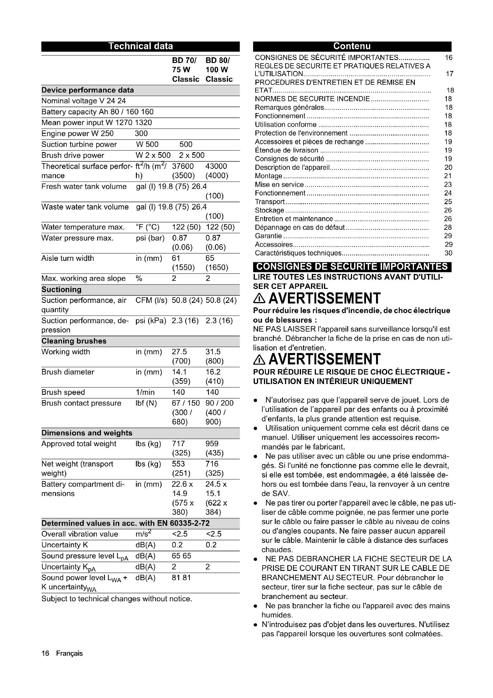 ● N’autorisez pas que l’appareil serve de jouet. Lors de l’utilisation de l’appareil par des enfants ou à proximité d’enfants, la plus grande attention est requise. ● Utilisation uniquement comme cela est décrit dans ce manuel. Utiliser uniquement les accessoires recom- mandés par le fabricant. ● Ne pas utiliser avec un câble ou une prise endomma- gés. Si l'unité ne fonctionne pas comme elle le devrait, si elle est tombée, est endommagée, a été laissée de- hors ou est tombée dans l'eau, la renvoyer à un centre de SAV. ● Ne pas tirer ou porter l'appareil avec le câble, ne pas uti- liser de câble comme poignée, ne pas fermer une porte sur le câble ou faire passer le câble au niveau de coins ou d'angles coupants. Ne faire passer aucun appareil sur le câble. Maintenir le câble à distance des surfaces chaudes. ● NE PAS DEBRANCHER LA FICHE SECTEUR DE LA PRISE DE COURANT EN TIRANT SUR LE CABLE DE BRANCHEMENT AU SECTEUR. Pour débrancher le secteur, tirer sur la fiche secteur, pas sur le câble de branchement au secteur. ● Ne pas brancher la fiche ou l'appareil avec des mains humides. ● N’introduisez pas d'objet dans les ouvertures. N'utilisez pas l'appareil lorsque les ouvertures sont colmatées. BD 70/ 75 W Classic BD 80/ 100 W Classic Device performance data Nominal voltage V 24 24 Battery capacity Ah 80 / 160 160 Mean power input W 1270 1320 Engine power W 250 300 Suction turbine power W 500 500 Brush drive power W 2 x 500 2 x 500 Theoretical surface perfor- mance