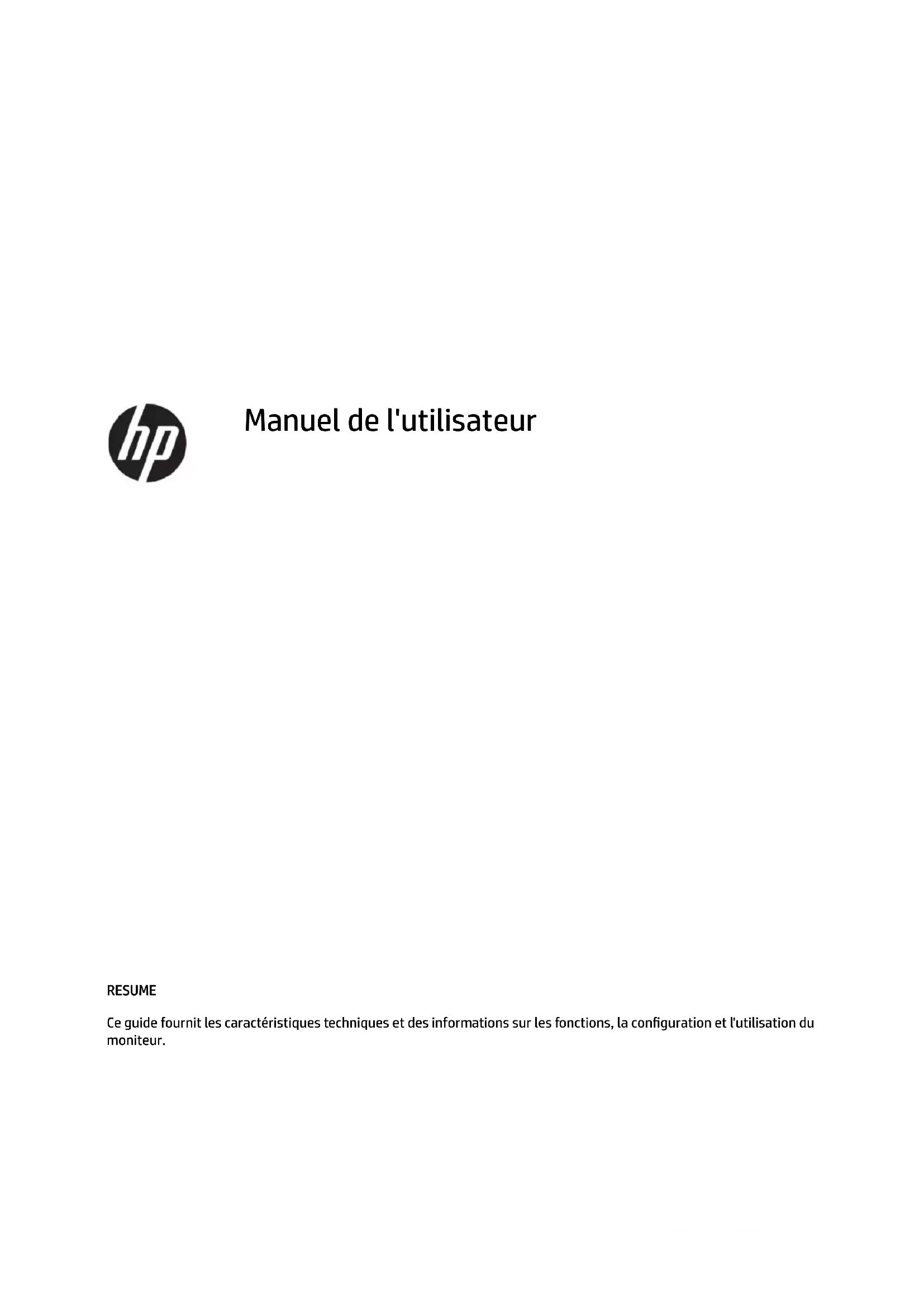 - Manuel de l'utilisateur RESUME Ce guide fournit les caractéristiques techniques et des informations sur les fonctions, la conguration et l'utilisation du moniteur.Informations légales © Copyright 2021 HP Development Company, L.P. AMD et FreeSync sont des marques commerciales ou des marques déposées d'Advanced Micro Devices, Inc. HDMI, le Logo HDMI et High-Denition Multimedia Interface sont des marques commerciales ou des marques déposées de HDMI Licensing LLC. DisplayPort™, le logo DisplayPort™, et VESA® sont des marques commerciales ou des marques commerciales déposées appartenant à Video Electronics Standards Association (VESA) aux États-Unis et dans d'autres pays. Les informations contenues dans le présent document peuvent faire l'objet de modications sans préavis. Les garanties applicables aux produits et services HP sont décrites dans les documents de garantie expresse accompagnant ces produits et services. Aucune partie du présent document ne saurait être interprétée comme une garantie supplémentaire. HP ne saurait être tenu responsable des éventuelles erreurs techniques ou d'édition contenues dans ce guide, ni des omissions. Informations sur le produit Ce manuel décrit des fonctions communes à la plupart des modèles. Certaines fonctions peuvent ne pas être disponibles sur votre produit. Pour accéder au dernier manuel de l'utilisateur, rendez-vous sur http://www.hp.com/support, puis suivez les instructions pour trouver votre produit. Ensuite, sélectionnez Manuels. Première édition : mai 2021 Numéro de référence du document : M54492-051À propos de ce manuel Ce guide fournit les caractéristiques techniques et des informations sur les fonctions et la conguration du moniteur ainsi que sur l'utilisation du logiciel. Selon le modèle, votre moniteur peut ne pas avoir toutes les fonctions incluses dans ce guide. AVERTISSEMENT ! Indique une situation dangereuse pouvant entraîner des blessures graves ou la mort. ATTENTION : Indique une situation dangereuse pouvant entraîner des blessures mineures ou de gravité modérée. IMPORTANT : Indique les informations considérées comme importantes mais non dangereuses (par exemple, des messages associés à des dommages matériels). Avertit l'utilisateur que si une procédure n'est pas scrupuleusement suivie, cela peut entraîner une perte de données ou une détérioration du matériel ou des logiciels. Contient également des informations essentielles pour expliquer un concept ou pour terminer une tâche. REMARQUE : Contient des informations supplémentaires qui soulignent ou complètent les points importants du texte principal. CONSEIL : Fournit des conseils utiles pour terminer une tâche. Ce produit intègre la technologie HDMI. iiiiv À propos de ce manuelSommaire 1 Mise en route p. 1