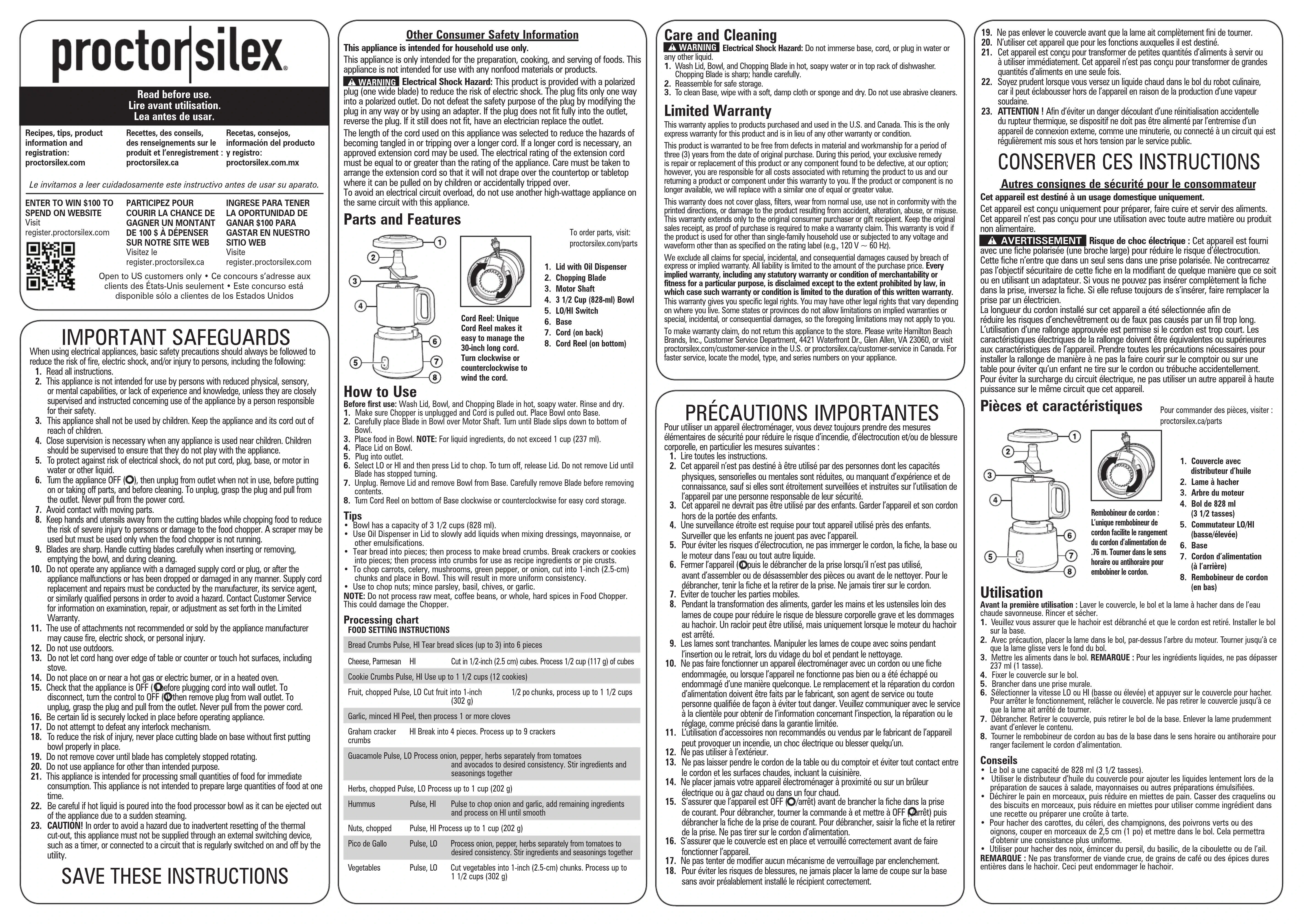 - Utiliser le distributeur d’huile du couvercle pour ajouter les liquides lentement lors de la préparation de sauces à salade, mayonnaises ou autres préparations émulsifiées.• Déchirer le pain en morceaux, puis réduire en miettes de pain. Casser des craquelins ou des biscuits en morceaux, puis réduire en miettes pour utiliser comme ingrédient dans une recette ou préparer une croûte à tarte.• Pour hacher des carottes, du céleri, des champignons, des poivrons verts ou des oignons, couper en morceaux de 2,5 cm (1 po) et mettre dans le bol. Cela permettra d’obtenir une consistance plus uniforme.• Utiliser pour hacher des noix, émincer du persil, du basilic, de la ciboulette ou de l’ail.REMARQUE : Ne pas transformer de viande crue, de grains de café ou des épices dures entières dans le hachoir. Ceci peut endommager le hachoir.Pour commander des pièces, visiter :proctorsilex.ca/parts1. Couvercle avec distributeur d’huile2. Lame à hacher3. Arbre du moteur 4. Bol de 828 ml (3 1/2 tasses)5. Commutateur LO/HI (basse/élevée) 6. Base 7. Cordon d’alimentation (à l’arrière)8. Rembobineur de cordon (en bas)Rembobineur de cordon : L’unique rembobineur de cordon facilite le rangement du cordon d’alimentation de .76 m. Tourner dans le sens horaire ou antihoraire pour embobiner le cordon.840358300 7/21 Modelo: Tipo: Características Eléctricas: 72870 FC14 120 V ~ 60 Hz 350 W Los modelos incluídos en el instructivo de Uso y Cuidado pueden ir seguidos o no por un sufijo correspondiente a una o varias letras del alfabeto y sus combinaciones, separadas o no por un espacio, coma, diagonal, o guión. Como ejemplos los sufijos pueden ser: “Y” y/o “MX” y/o “MXY” y/o “Z”.Grupo HB PS, S.A. de C.V.Monte Elbruz No. 124 - 401Col. Polanco V Sección, Miguel HidalgoCiudad de México, C.P. 11560GARANTÍA PARA PRODUCTOS COMPRADOS EN MÉXICOPRODUCTO: MARCA: MODELO:Grupo HB PS, S.A. de C.V. cuenta con una Red de Centros de Servicio Autorizada, por favor consulte en la lista anexa el nombre y dirección de los establecimientos en la República Mexicana en donde usted podrá hacer efectiva la garantía, obtener partes, componentes, consumibles y accesorios; así como también obtener servicio para productos fuera de garantía. Para mayor información llame al: Centro de Atención al Consumidor: 800 71 16 100 Grupo HB PS, S.A. de C.V. le otorga a partir de la fecha de compra:GARANTÍA DE 3 AÑOS.COBERTURA• Esta garantía ampara, todas las piezas y componentes del producto que resulten con defecto de fabricación incluyendo la mano de obra.• Grupo HB PS, S.A. de C.V. se obliga a reemplazar, reparar o reponer, cualquier pieza o componente defectuoso; proporcionar la mano de obra necesaria para su diagnóstico y reparación, todo lo anterior sin costo adicional para el consumidor.• Esta garantía incluye los gastos de transportación del producto que deriven de su cumplimiento dentro de su red de servicio.LIMITACIONES• Esta garantía no ampara el reemplazo de piezas deterioradas por uso o por desgaste normal, como son: cuchillas, vasos, jarras, filtros, etc.• Grupo HB PS, S.A. de C.V. no se hace responsable por los accidentes producidos a consecuencia de una instalación eléctrica defectuosa, ausencia de toma de tierra, clavija o enchufe en mal estado, etc.EXCEPCIONESEsta garantía no será efectiva en los siguientes casos:a) Cuando el producto se hubiese utlizado en condiciones distintas a las normales. (Uso industrial, semi-industrial o comercial.)b) Cuando el producto no hubiese sido operado de acuerdo con el instructivo de uso.c) Cuando el producto hubiese sido alterado o reparado por personas no autorizadas por Grupo HB PS, S.A. de C.V. el fabricante nacional, importador o comercializador responsable respectivo.El consumidor puede solicitar que se haga efectiva la garantía ante la propia casa comercial donde adquirió su producto, siempre y cuando Grupo HB PS, S.A. de C.V. no cuente con talleres de servicio.PROCEDIMIENTO PARA HACER EFECTIVA LA GARANTÍA• Para hacer efectiva la garantía, lleve su aparato al Centro de Servicio Autorizado más cercano a su domicilio (consulte la lista anexa).• Si no existe Centro de Servicio Autorizado en su localidad llame a nuestro Centro de Atención al Consumidor para recibir instrucciones de como hacer efectiva su garantía.FECHA DE ENTREGASELLO DEL VENDEDORQUEJAS Y SUGERENCIASDÍA___________ MES__________AÑO__________Si desea hacer comentarios o sugerencias con respecto a nuestro servicio o tiene alguna queja derivada de la atención recibida en alguno de nuestros Centros de Servicio Autorizados, por favor dirigirse a:GERENCIA INTERNACIONAL DE SERVICIO 800 71 16 100Email: mexico.service@proctorsilex.comCENTROS DE SERVICIO AUTORIZADOSCiudad de MéxicoELECTRODOMÉSTICOSAv. Plutarco Elias Calles No. 1499 Zacahuitzco, Benito Juárez, Ciudad de México, C.P. 09490 Tel: 55 5235 2323 CASA GARCÍA Av. Patriotismo No. 875-B Mixcoac, Benito Juárez, Ciudad de México, C.P. 03910 Tel: 55 5563 8723 Nuevo LeónFERNANDO SEPÚLVEDA REFACCIONESRuperto Martínez No. 238 Ote.Col. Centro Monterrey, N.L., CP 64000Tel: 81 8343 6700JaliscoSERVICIOS DE MANTENIMIENTO CASTILLOGaribaldi No. 1450, Ladrón de GuevaraGuadalajara, Jalisco, C.P. 44660Tel: 33 3825 3480 Tableau de transformation ALIMENTS RÉGLAGE INSTRUCTIONSMiettes de pain Pulser, HI (élevée)Briser les tranches de pain (jusqu’à 3) en 6 morceauxFromage, parmesanHI (élevée)Couper en cubes de 2,5 cm (1/2 po). Hacher 125 ml (1/2 tasse) de cubesMiettes de biscuitsPulser, HI (élevée)Utiliser jusqu’à 625 ml (1 1/2 tasse) (12 biscuits)Fruits, hachés Pulser, LO (basse)Couper les fruits en morceaux de 2,5 cm (1 po), hacher jusqu’à 302 g (1 1/2 tasse) à l’aide du hachoir Ail, émincé HI (élevée) Peler, puis hacher 1 gousse ou plus à l’aide du hachoirMiettes de biscuits GrahamHI (élevée) Briser en 4 morceaux. Hacher jusqu’à 9 craquelins à l’aide du hacho