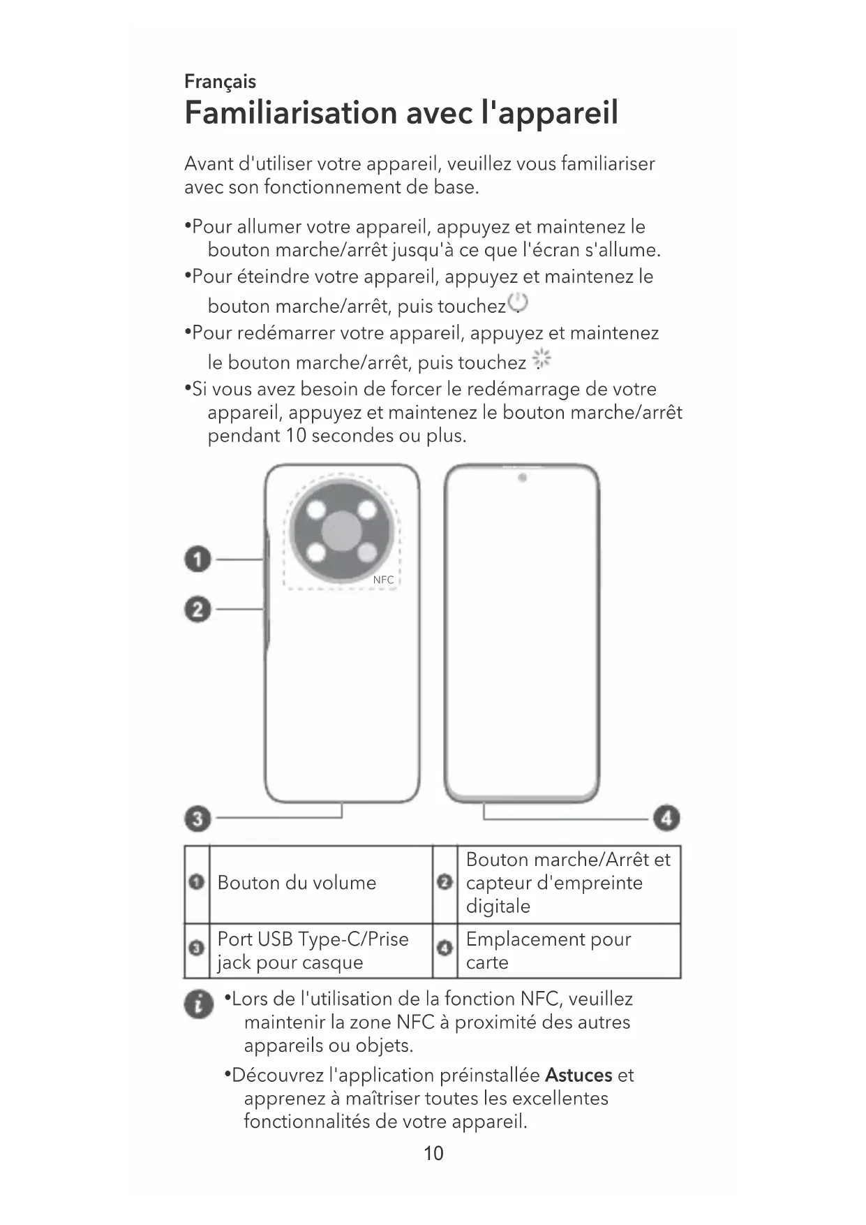 - Découvrez l'application préinstallée Astuces et apprenez à maîtriser toutes les excellentes fonctionnalités de votre appareil. 10Mise en route