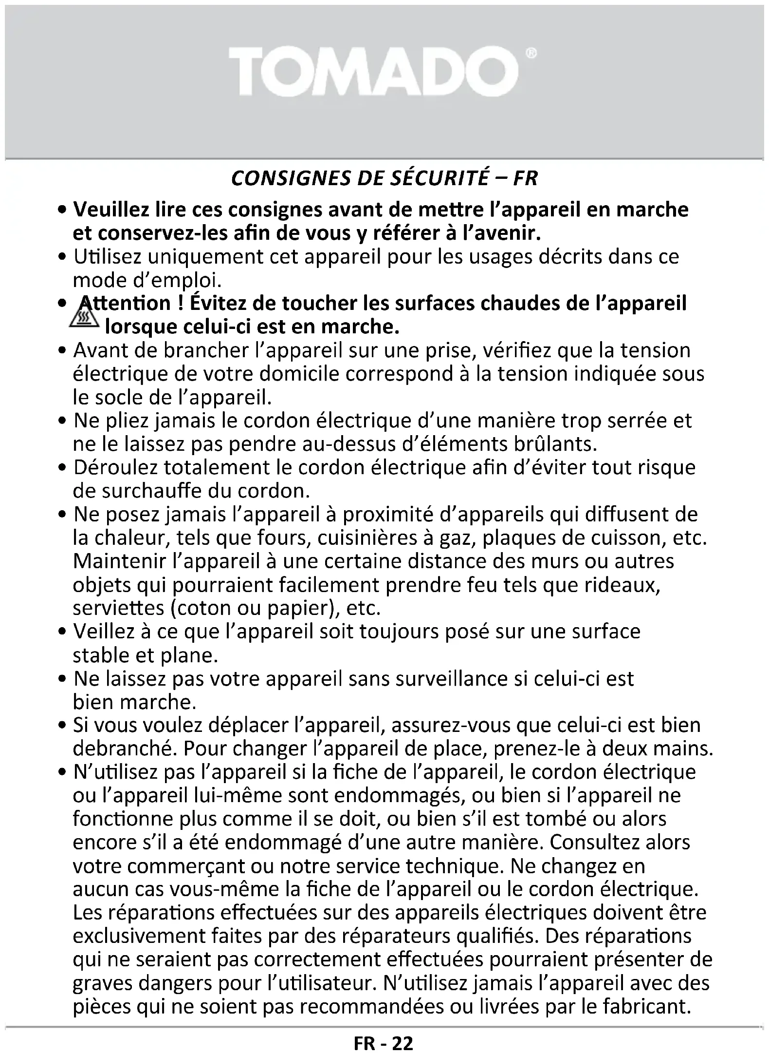 Rendez-vous sur www.tomado.com/support pour acheter des accessoires ou des pièces de rechange.