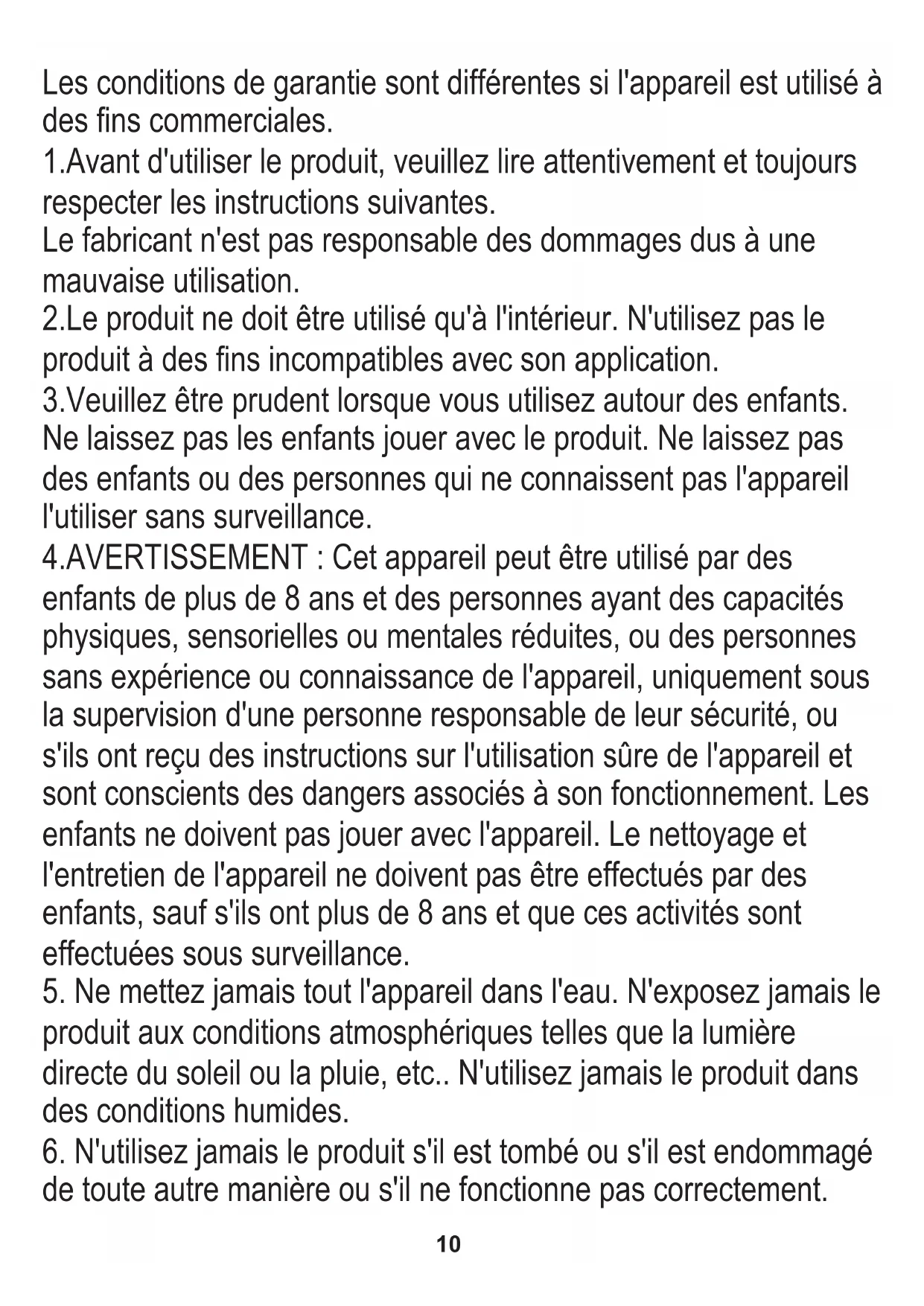 CONDITIONS GÉNÉRALES DE SÉCURITÉ. INSTRUCTIONS IMPORTANTES SUR LA SÉCURITÉ D'UTILISATION VEUILLEZ LIRE ATTENTIVEMENT ET CONSERVER. POUR RÉFÉRENCE FUTURE10 4.AVERTISSEMENT : Cet appareil peut être utilisé par des enfants de plus de 8 ans et des personnes ayant des capacités physiques, sensorielles ou mentales réduites, ou des personnes sans expérience ou connaissance de l'appareil, uniquement sous la supervision d'une personne responsable de leur sécurité, ou s'ils ont reçu des instructions sur l'utilisation sûre de l'appareil et sont conscients des dangers associés à son fonctionnement. Les enfants ne doivent pas jouer avec l'appareil. Le nettoyage et l'entretien de l'appareil ne doivent pas être effectués par des enfants, sauf s'ils ont plus de 8 ans et que ces activités sont effectuées sous surveillance. 3.Veuillez être prudent lorsque vous utilisez autour des enfants. Ne laissez pas les enfants jouer avec le produit. Ne laissez pas des enfants ou des personnes qui ne connaissent pas l'appareil l'utiliser sans surveillance.
